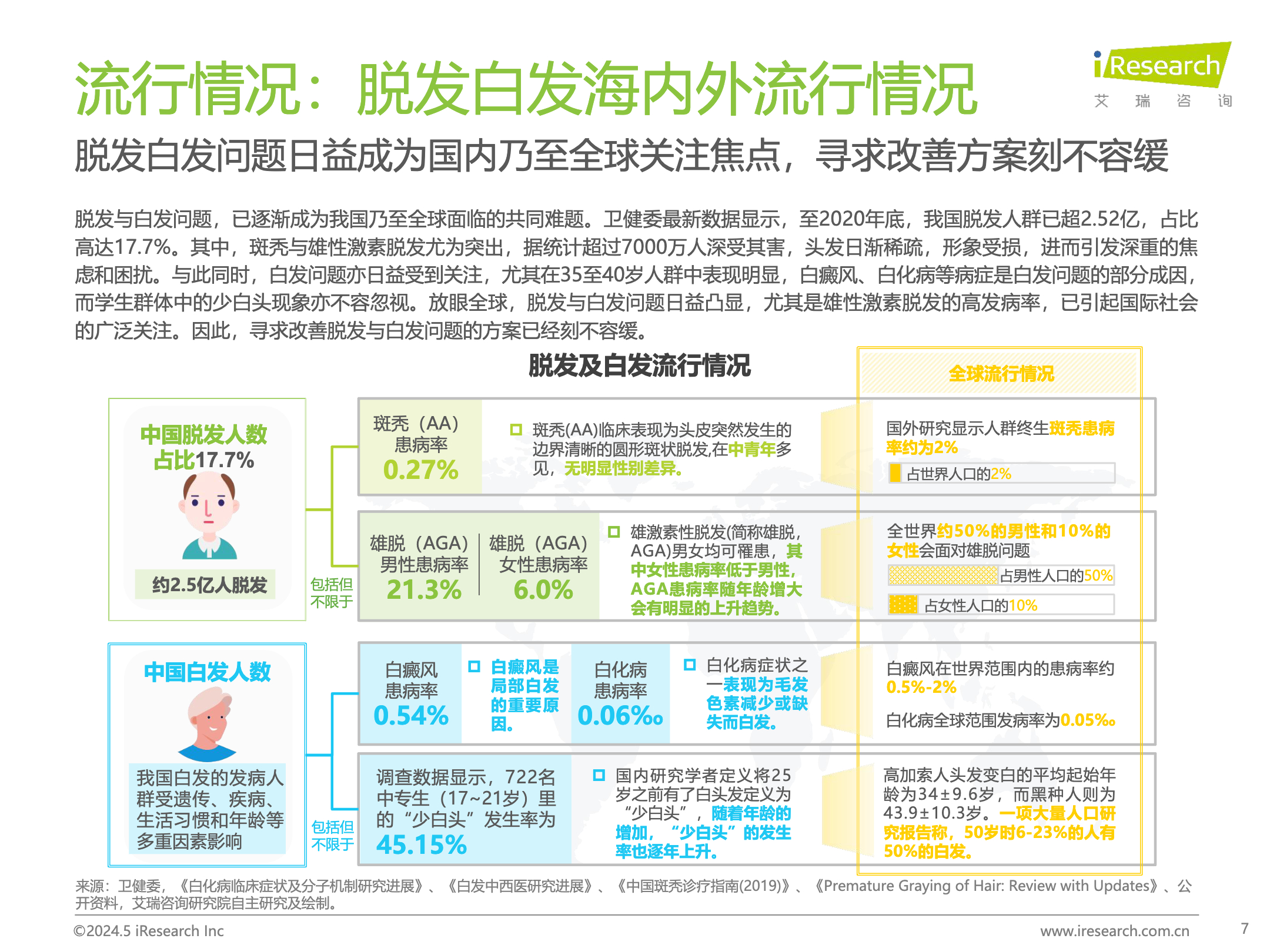 脱发与白发问题已逐渐成为我国乃至全球面临的共同难题。 卫健委最新数据显示,截至2020年底,我国脱发人群已超2.52亿,占比高达17.7%,遗传因素、生活方式的变化、工作压力的增加以及环境因素等导致越来越多的中国人面临脱发白发等头发健康问题。 本报告旨在提供对中国脱发白发理疗产业的深入洞察,分析市场发展情况,了解用户的脱发白发理疗行为特点,以期为行业从业者和投资者等各类主体提供参考与借鉴。