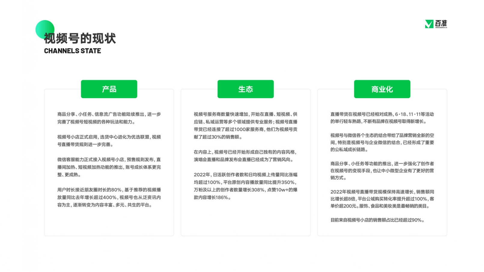 视频号自内测以来,逐渐成熟,目前已孕育出自己的生态,「直播+电商」的组合也开始迈入视频号。11月16日,腾讯发布Q3财报,提到视频号直播 服务及音乐付费会员服务的收入增加。 2022年7月,视频号先后上线信息流广告、视频号小店,10月份又将视频号小店与微信客服打通,并上线直播加热等功能。一系列功能与服务的更 新都显示出来,视频号正在加速商业化进程。 本报告将从现状、逻辑、机会,以及未来四个维度,分享对视频号的洞察,如何抓住这多元增长到趋势?