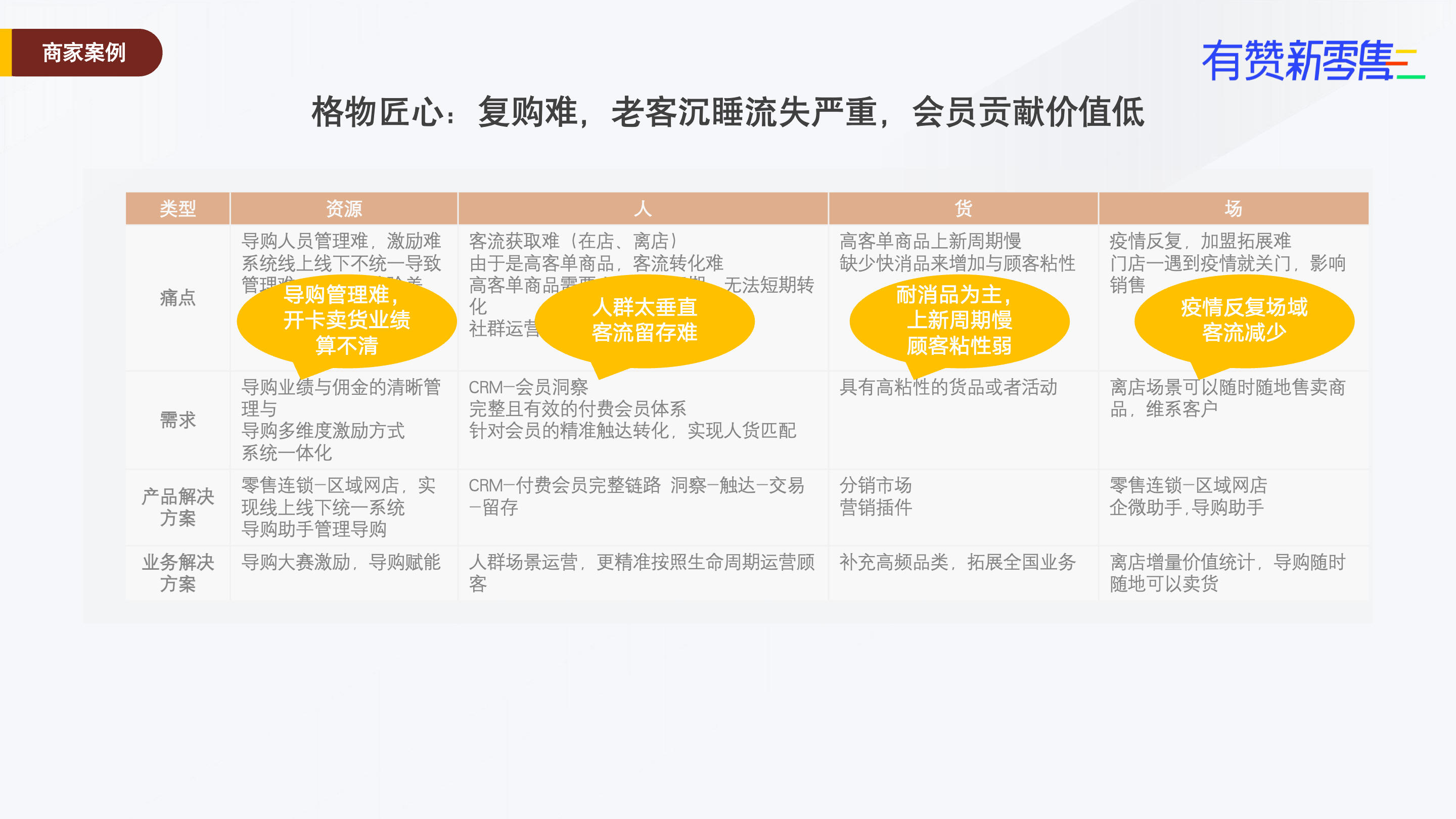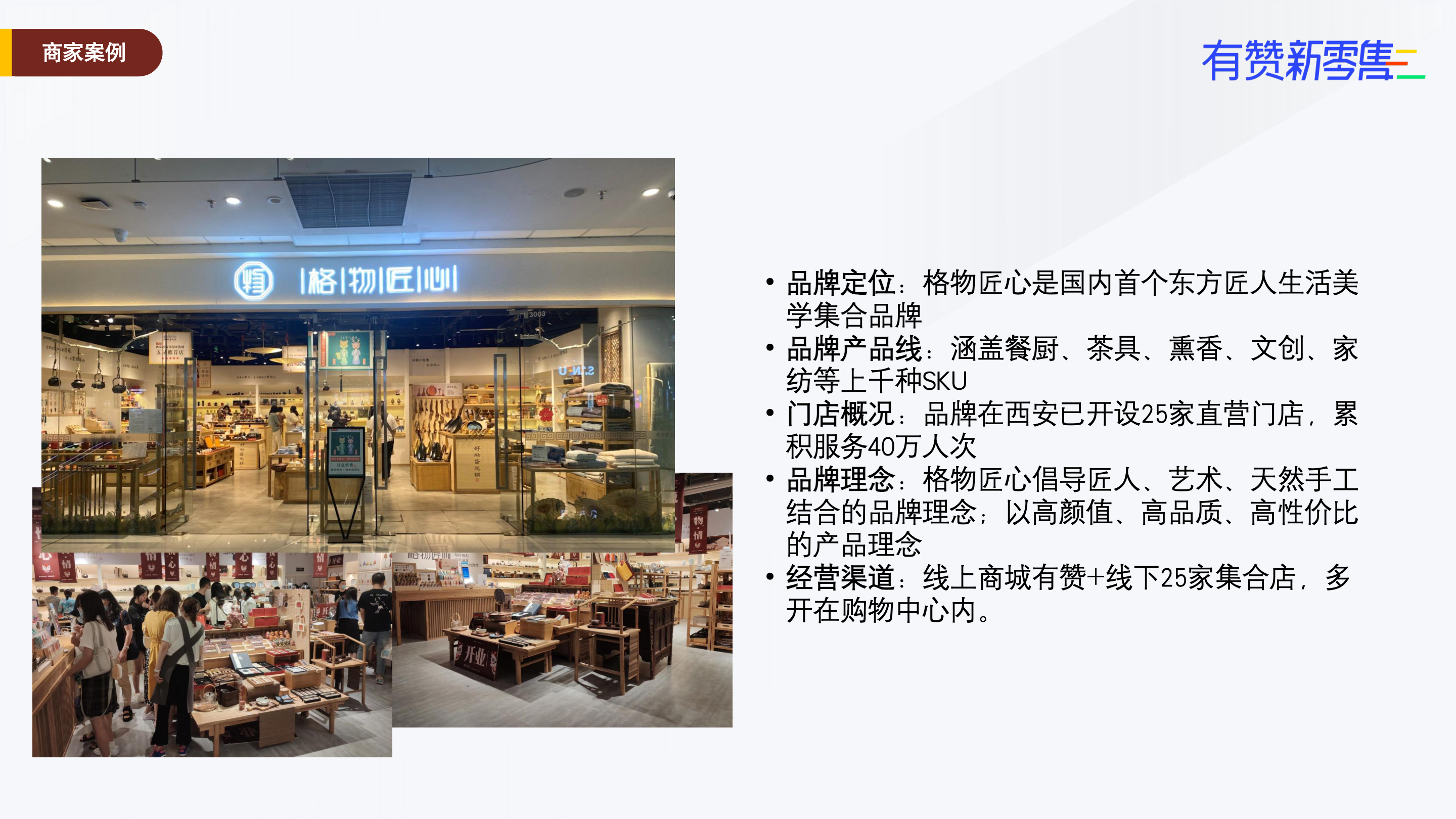 格物匠心是国内首个东方匠人生活美学集合品牌,涵盖餐厨、茶具、熏香、文创、家纺等上千种SKU。品牌在线已开设25家直营门店,累计服务40万人次。格物匠心倡导匠人、艺术、天然手工结合的品牌理念,以高颜值、高品质、高性价比的产品理念,通过全数据闭环的人群精准运营+导购激励赋能,降本增效,提升会员贡献占比。
