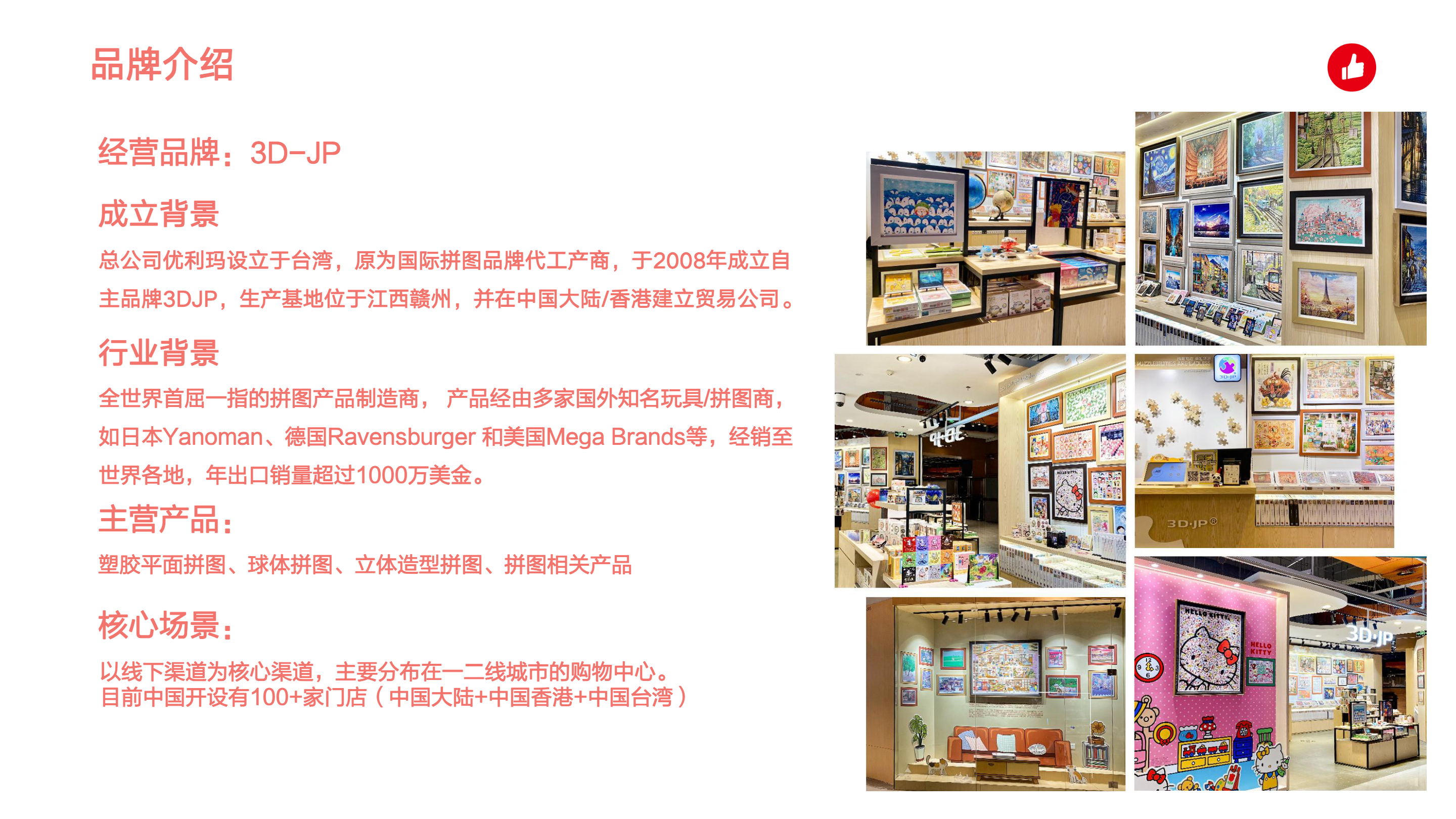 总公司优利玛设立于台湾,原为国际拼图品牌代工厂商,于2008年成立自主品牌3DJP,生产基地位于江西赣州,并在中国大陆/香港建立贸易公司。全世界首屈一指的拼图产品制造商,产品经由多家国外知名玩具/拼图商,如日本Yanaman、德国Ravensburger和美国Mega Brands等,经销至世界各地,年出口销量超过1000万美金。有赞产品+运营服务双引擎解决方案让3DJP全域同比增长35%。