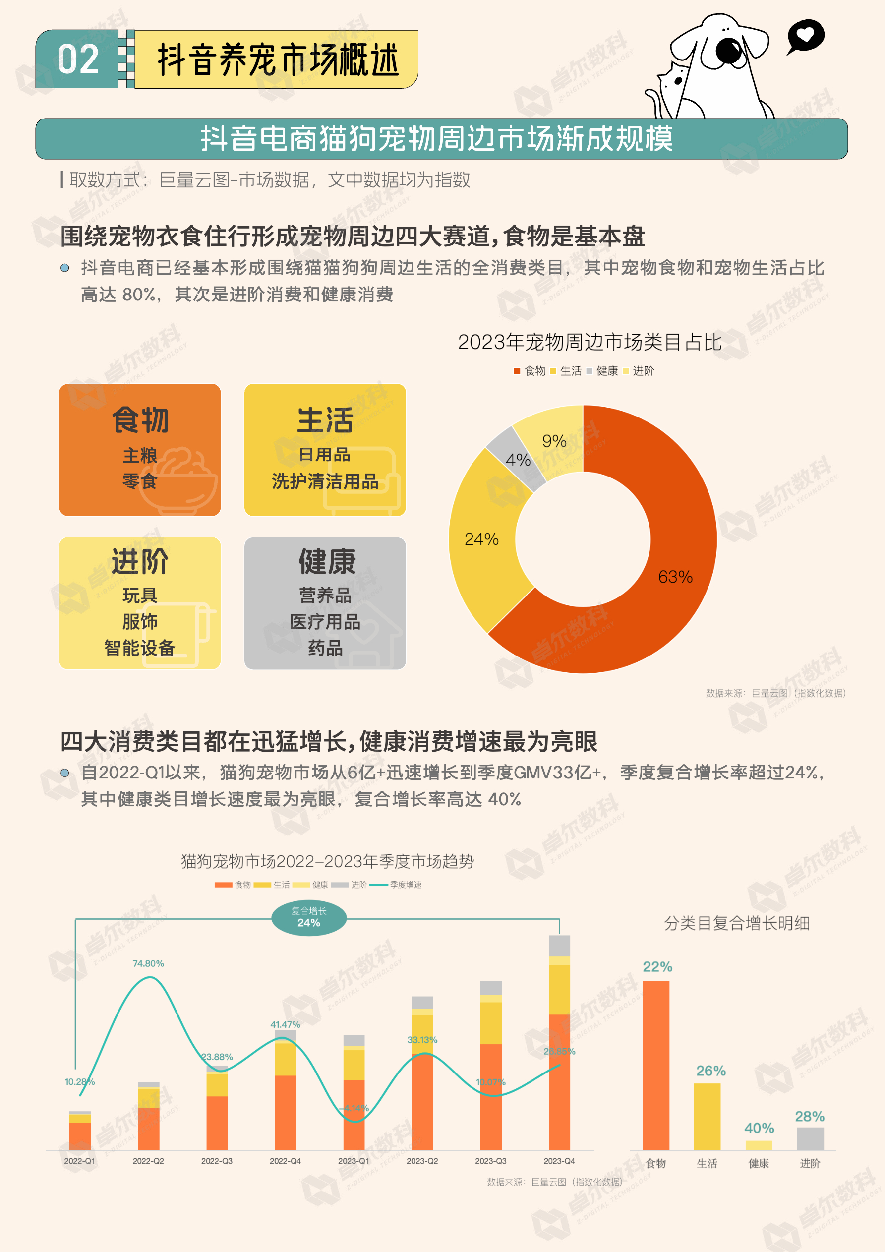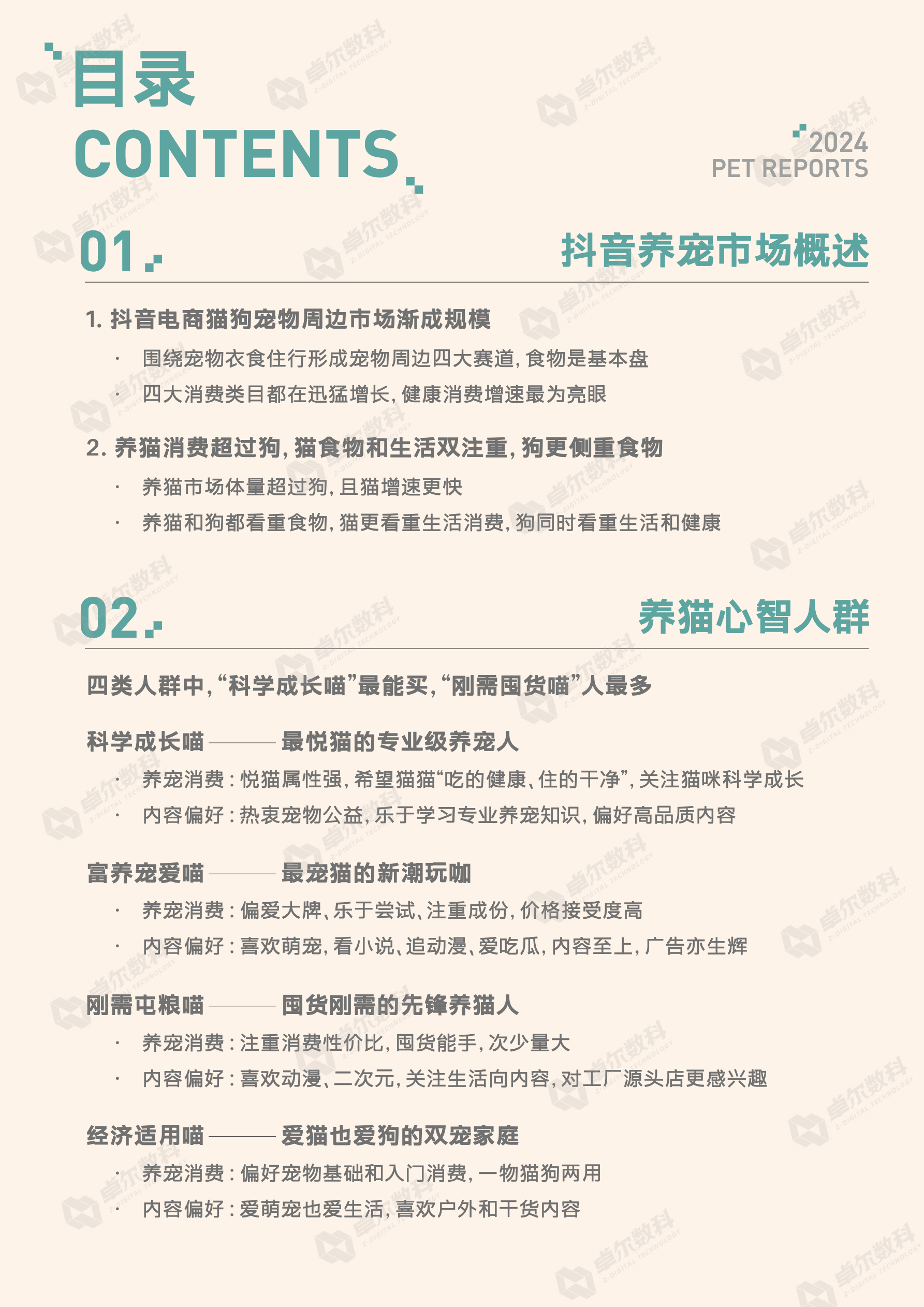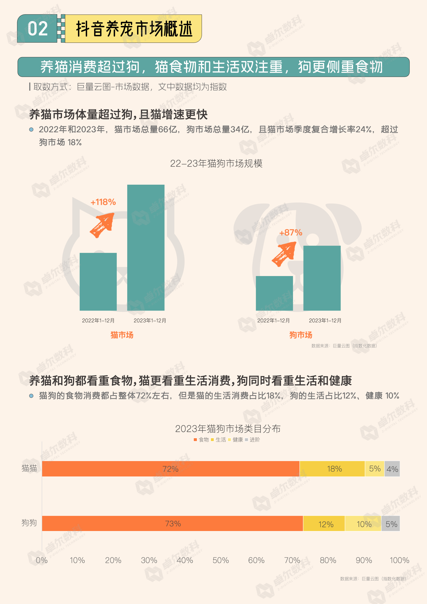 随着人们生活水平的提高和对宠物的关爱不断增加,养宠市场呈现出蓬勃发展的态势。 抖音作为一个充满活力和创意的社交媒体平台,不仅为宠物爱好者提供了分享和交流的空间,也成为了养宠相关产品和服务的重要推广渠道。 本报告旨在通过对抖音养宠市场的深入分析,见微知著,解密养宠人群的心智图谱,为相关从业者提供有价值的参考和建议。从而制定更加有效的营销策略,满足养宠人群的需求,共同推动养宠行业的发展。