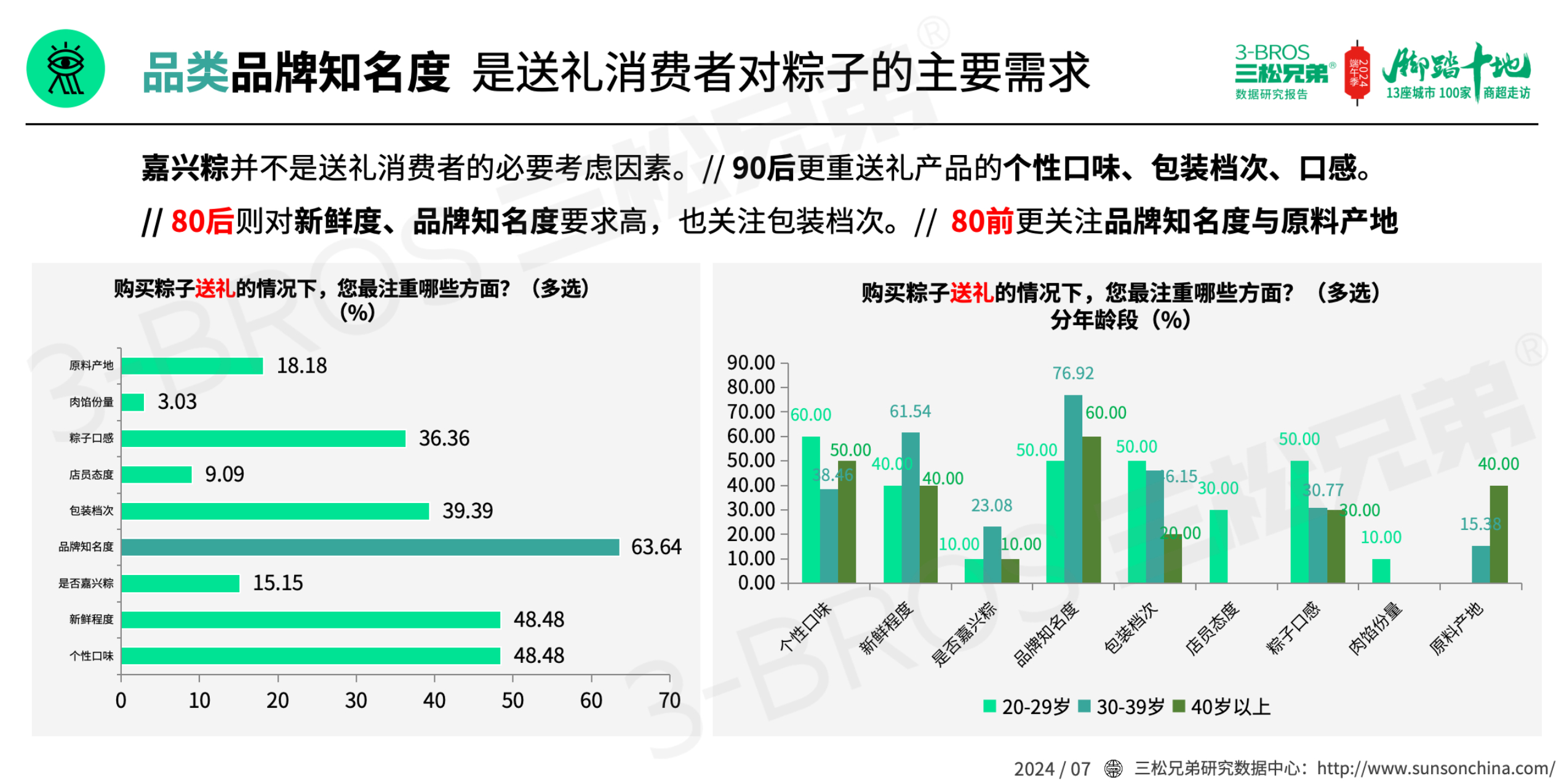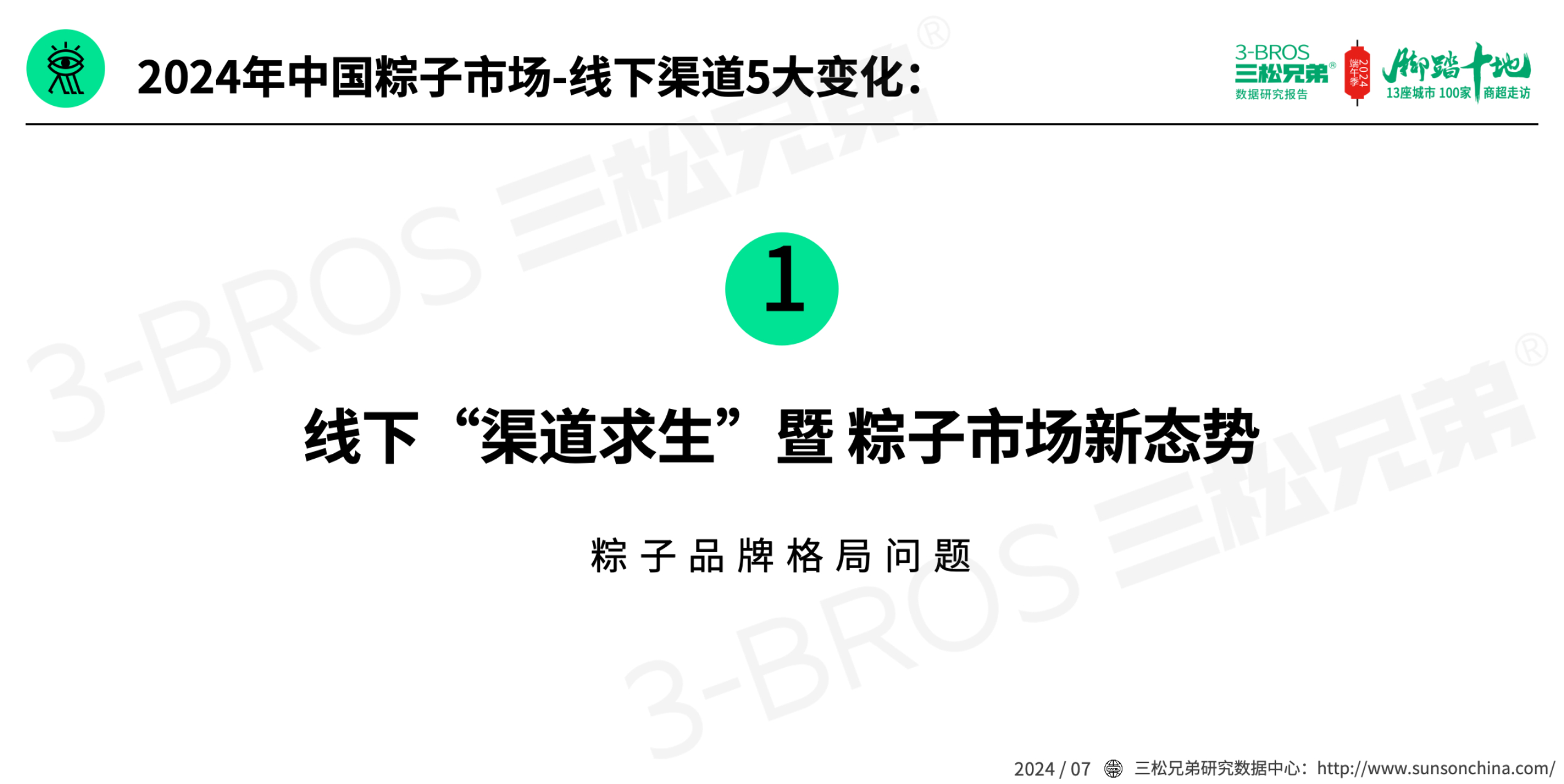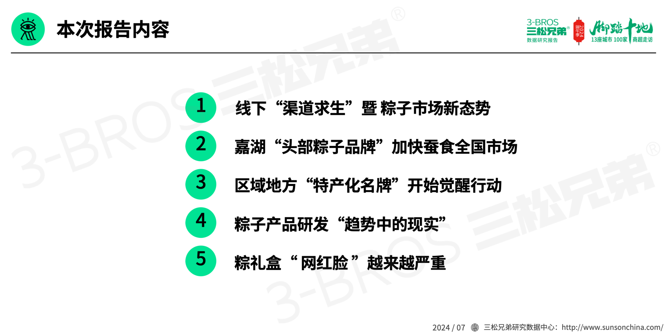粽子这一单品,大多数消费会选择大型购物超市、品牌自营店购买节日食品,具有公信力的线下商超和门店仍然是该类产品的主流消费渠道。 本报告从以下5方面深度剖析粽子食品市场及发展趋势: 1.线下 “渠道求生”暨粽子市场新态势 2.嘉湖“头部粽子品牌” 加快蚕食全国市场 3.区域地方 “特产化名牌”开始觉醒行动 4.粽子产品研发 “趋势中的现实” 5.粽礼盒 “网红脸”越来越严重?
