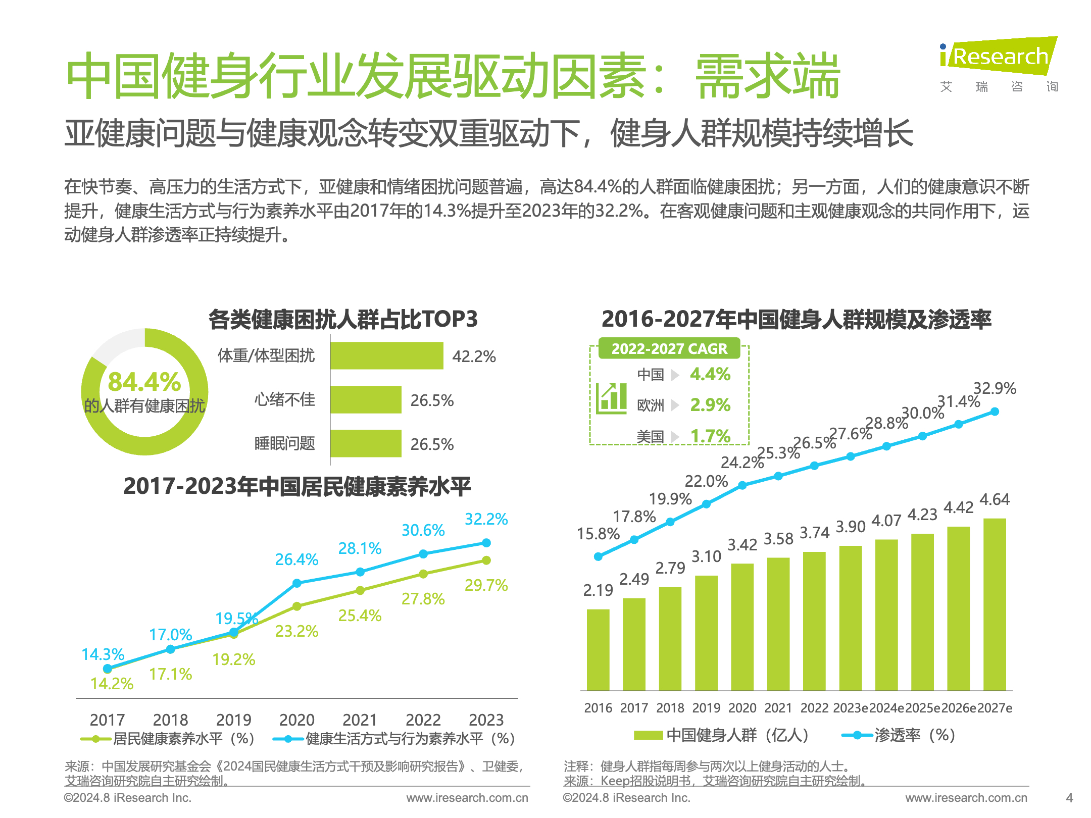 亚健康问题与健康观念转变双重驱动下,健身人群规模持续增长,2023年中国健身房市场规模达675亿元,短期震荡,长期向好。 1.具体中国健身行业发展情况如何? 2.中国健身房经营情况及消费者信心如何? 3.中国健身行业商家经营机会 4.中国健身行业发展建议 查看完整报告获取更多信息~