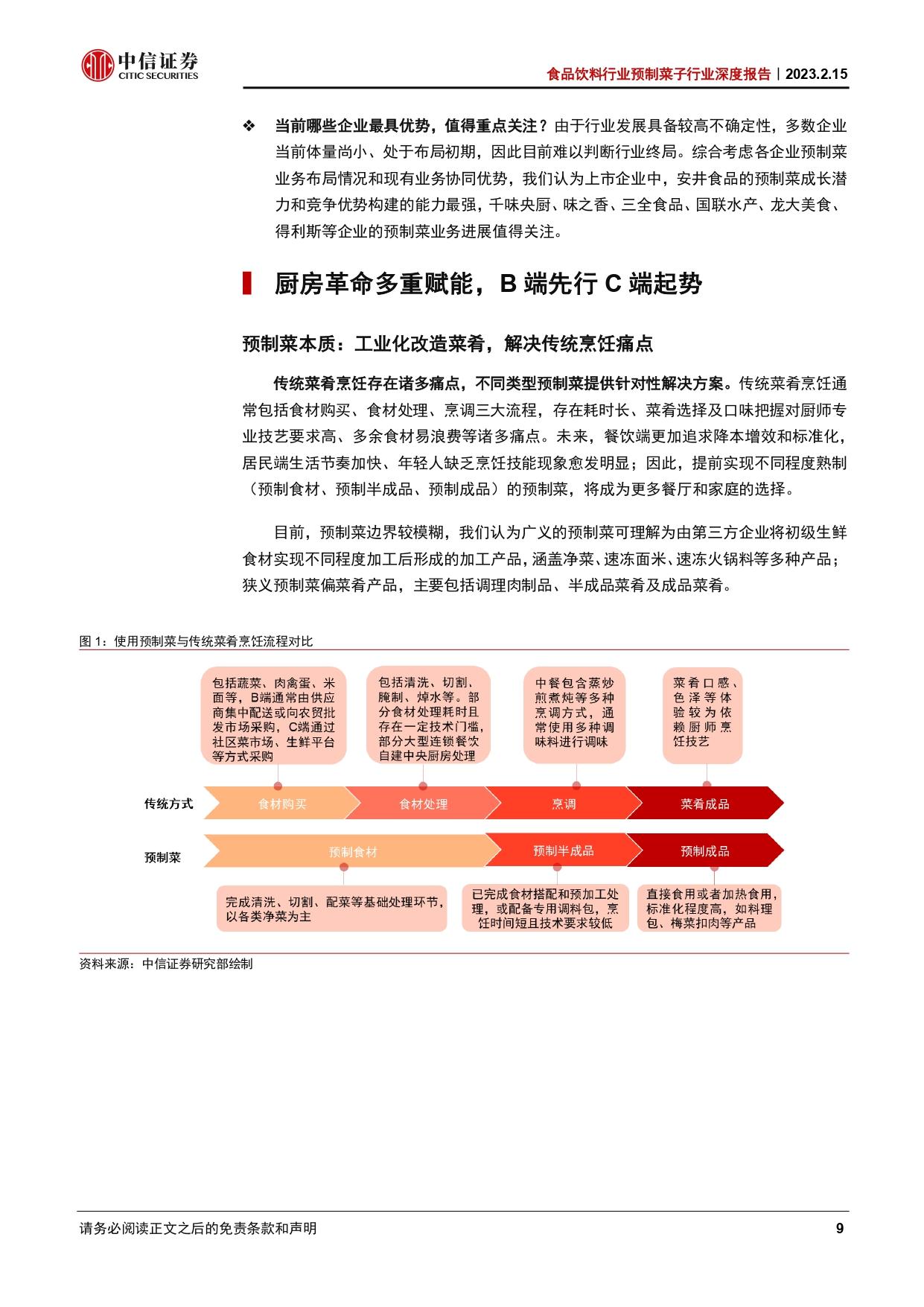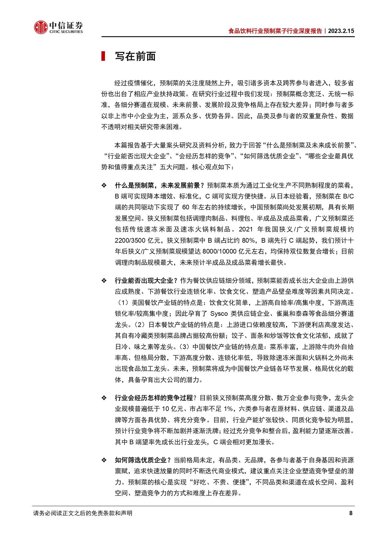 预制菜针对性解决传统菜肴烹饪过程诸多痛点,B 端先行、C 端起势,十年后有望成为万亿赛道。 目前,六类玩家优势各异、高度分散,政策加持推动行业 快速扩容,经过长期竞争和整合后望孕育龙头。优质企业需重点关注企业在产品、渠道上的竞争力及现有业务协同优势。 三千亿规模品类众多,多力驱动快速成长;细分品类周期各异,十年万亿规模可期,百家争鸣格局分散,巨头入局跑马圈地。那么,预制菜能否诞生大企业?预制菜会经历怎样的竞争过程?企业该如何切入赛道、优质经营? 更多细节信息可查看完整报告获取~