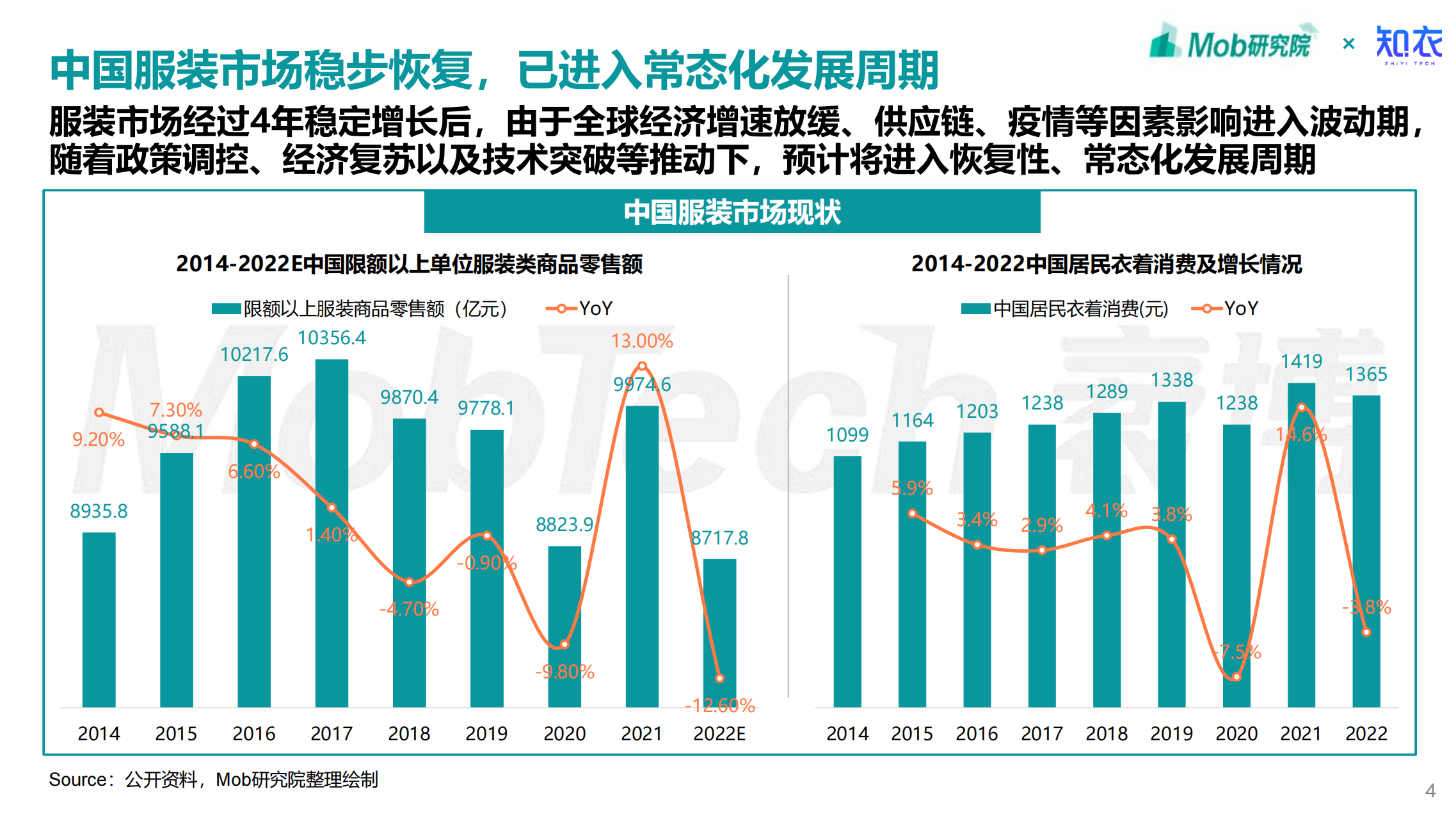 服装市场经过4年稳定增长后,由于全球经济增速放缓、供应链、疫情等因素影响进入波动期, 随着政策调控、经济复苏以及技术突破等推动下,预计将进入恢复性、常态化发展周期。 中国女装市场规模在2019年已达万亿,后虽稍有回落,仍有望在2022年重回万亿市场。而人均服装消费支出远低于欧美国家,未来随着女性职业化水平及对服装要求的不断提升,女装市场未来可期。 随着消费者对服装的质量、款式要求不断提升,中国中高端女装占比不断上升且市场增速明显,预计在2023年,中高端女装零售额占整体女装市场比例将达到23.4%。 消费者购物趋势有何变化?不同风格的服装受欢迎程度如何?更多细节可查看完整报告获取~