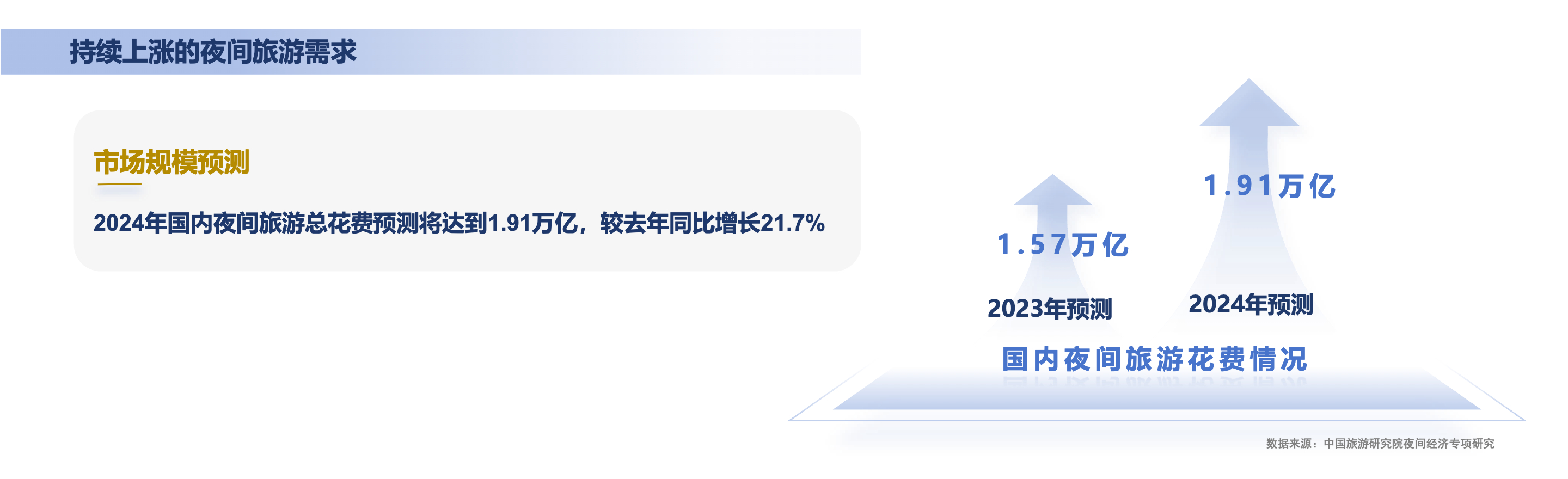 2024年国内夜间旅游总花费预测将达到1.91万亿,较去年同比增长21.7%,另外夜间旅游正在从夜景观光全面转向多维深度体验,持续上涨的夜间旅游需求蕴含着哪些机遇呢?查看完整报告获取更多信息~