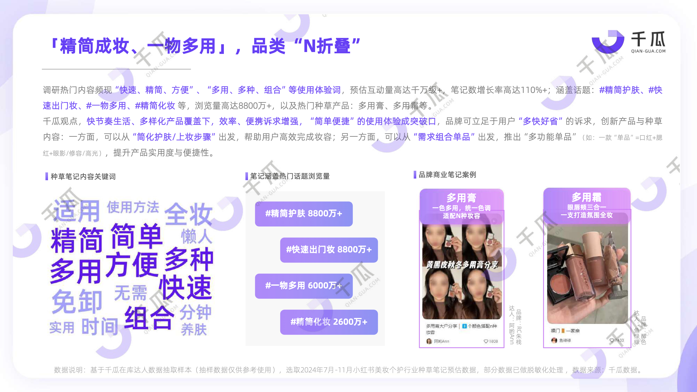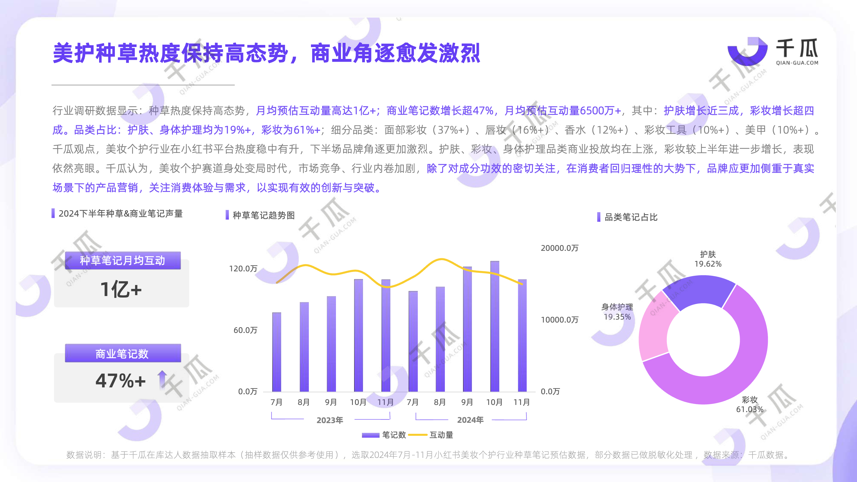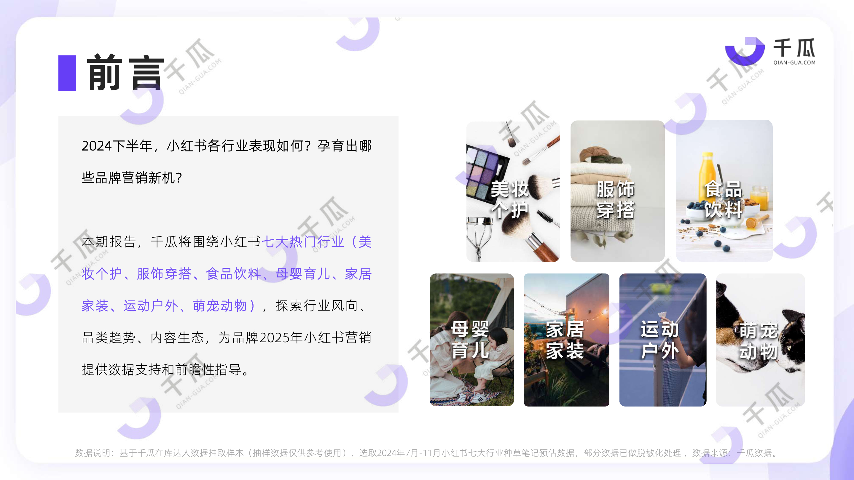 2024下半年,小红书各行业表现如何?孕育出哪些品牌营销新机? 本报告,将围绕小红书七大热门行业 (美妆个护、服饰穿搭、食品饮料、母婴育儿、家居家装、运动户外、萌宠动物),探索行业风向、品类趋势、内容生态,为品牌2025年小红书营销提供数据支持和前瞻性指导。