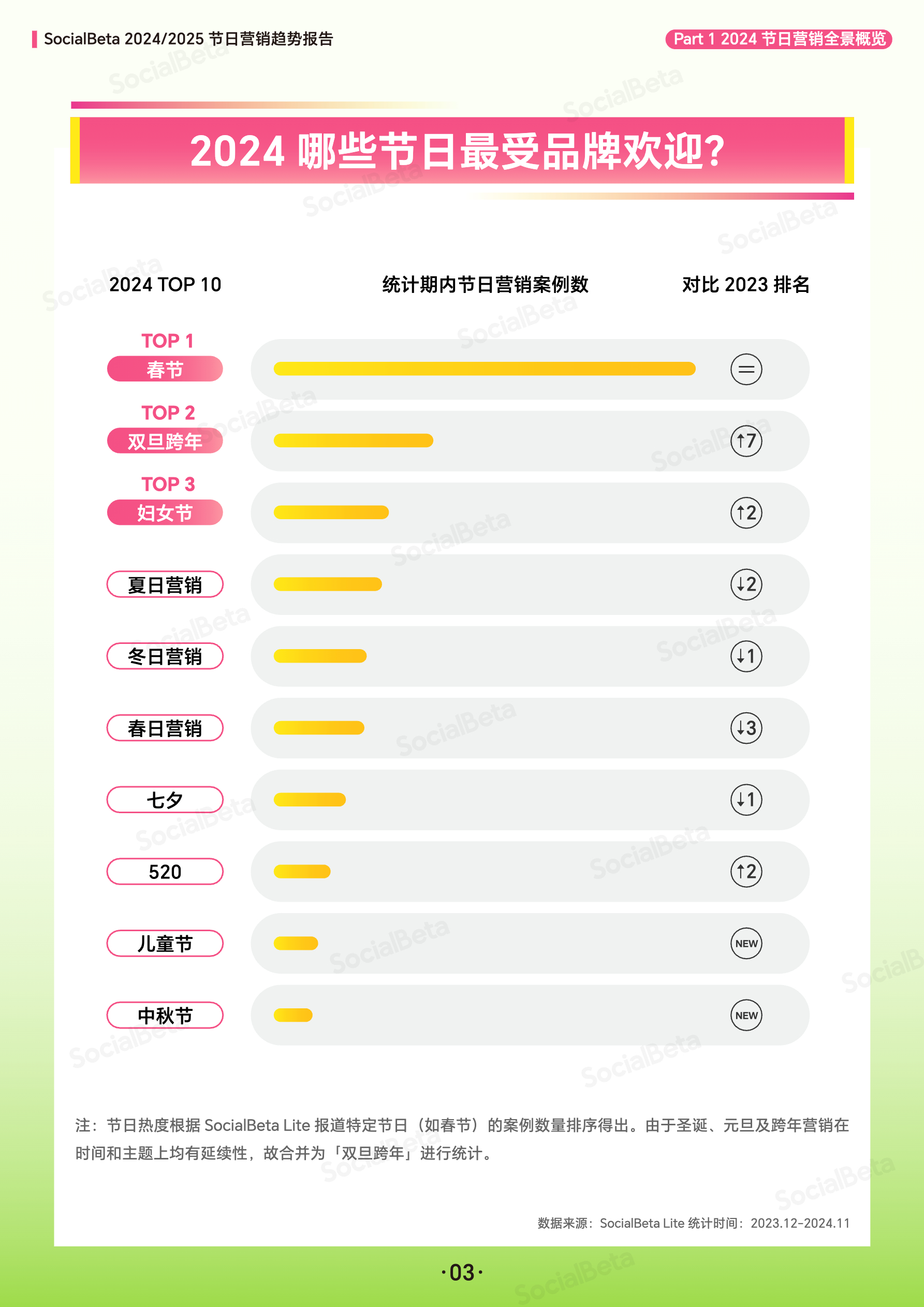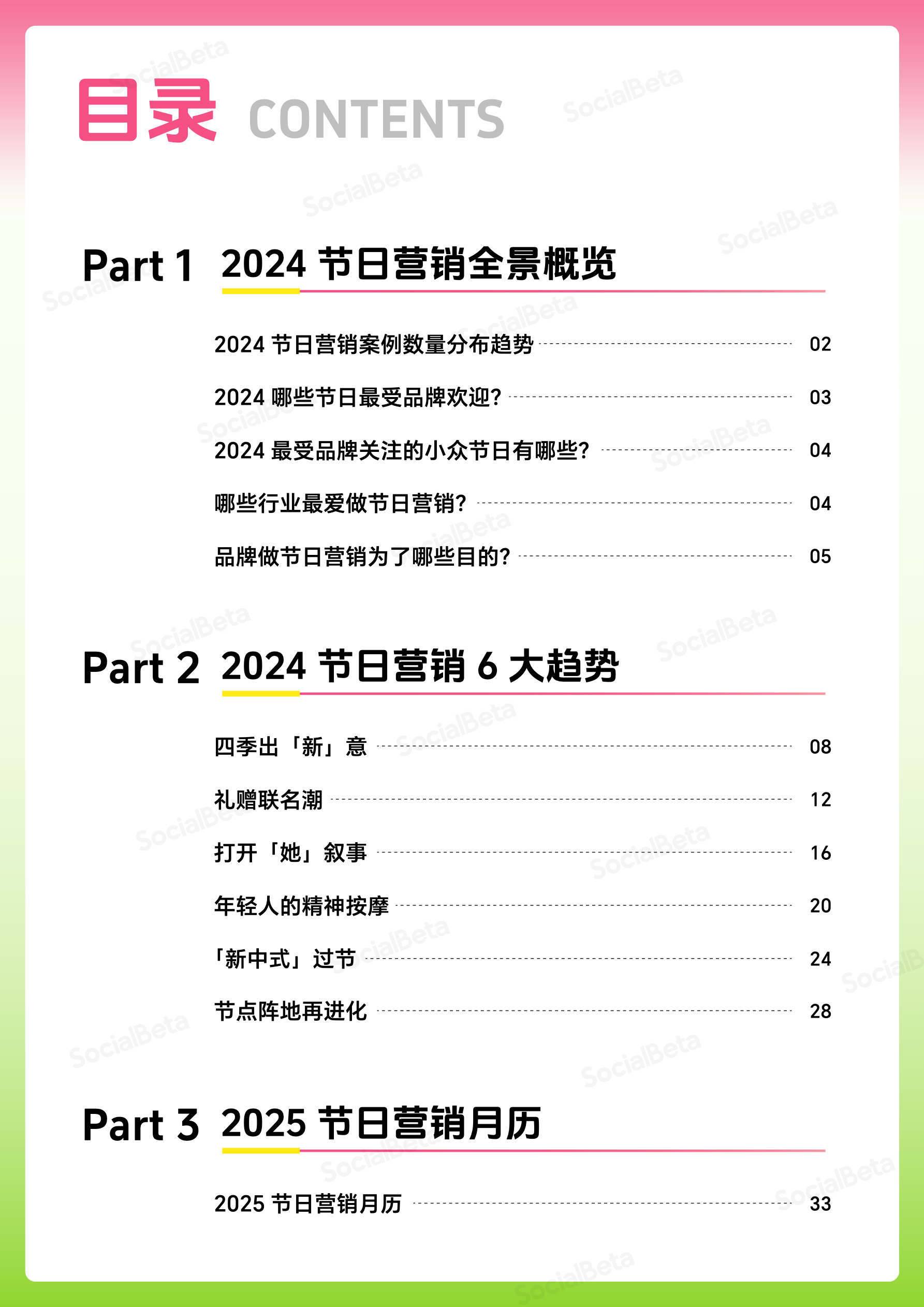 在经济环境承压、品牌预算收紧的背景下,品牌在节日营销策略上更加审慎务实,更重视策略智慧的比拼。 从全年内容规划的主线,再到具体节日的选择,相关的内容创意以及内容的可复用性方面,品牌更注重从自身所处的阶段和目标出发,力求最大化节日营销的短期和长期价值。 本报告紧扣货品营销、人群沟通和品牌建设这三个品牌做节日营销的核心目的,用趋势来串联相关的节日。希望为大家带来生意经营灵感~