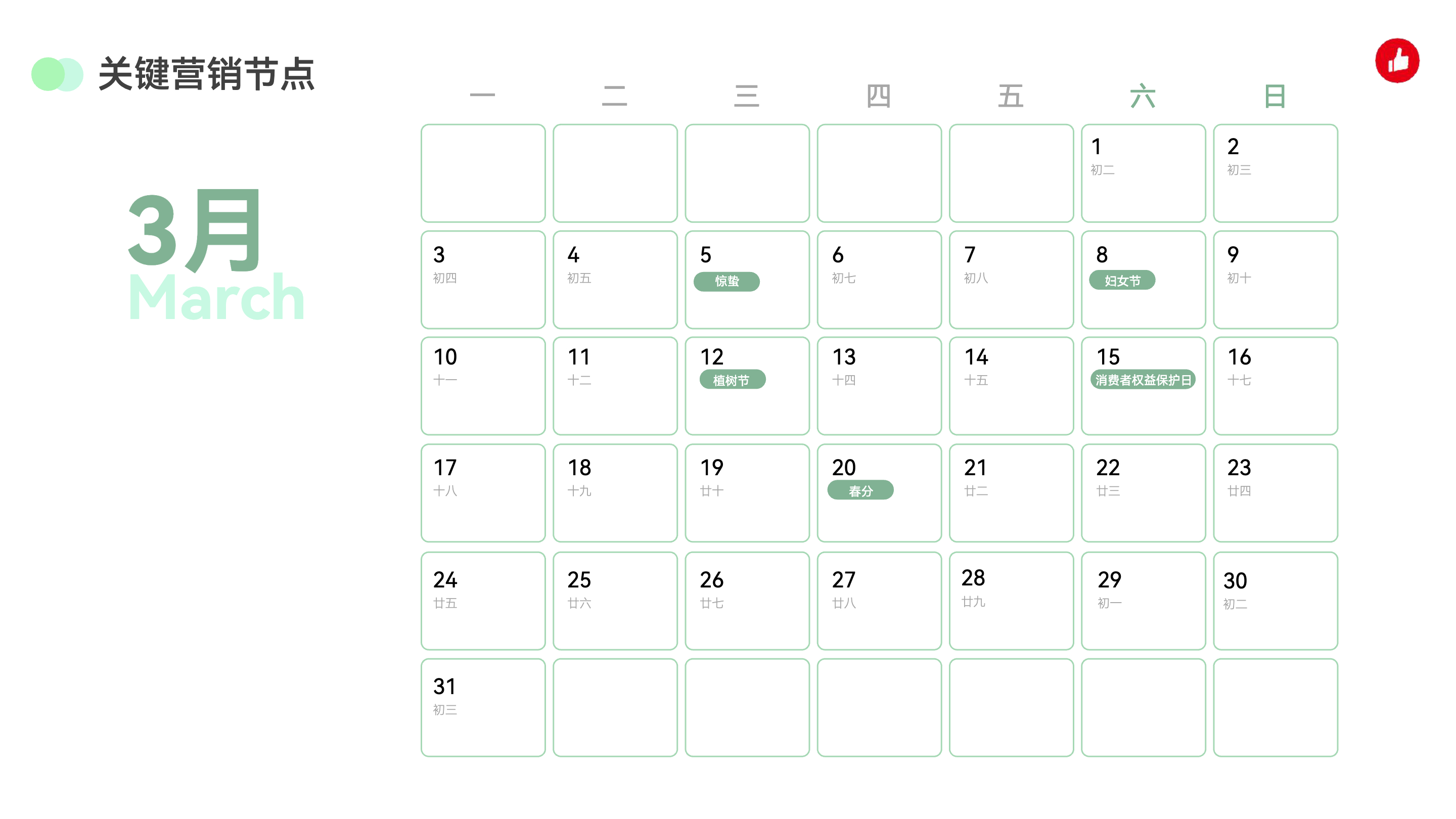 惊蛰、妇女节、植树节、消费者权益保护日、春分......为了助力品牌在3月营销节点中脱颖而出,我们准备了一份3月私域营销建议,涵盖节点营销策略、创意海报设计、消费趋势洞察等干货内容,助您抢占先机,引爆品牌声量与销量~
