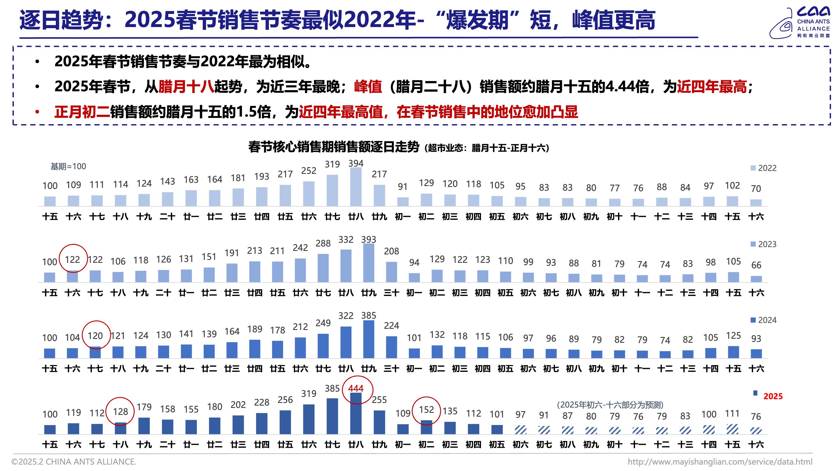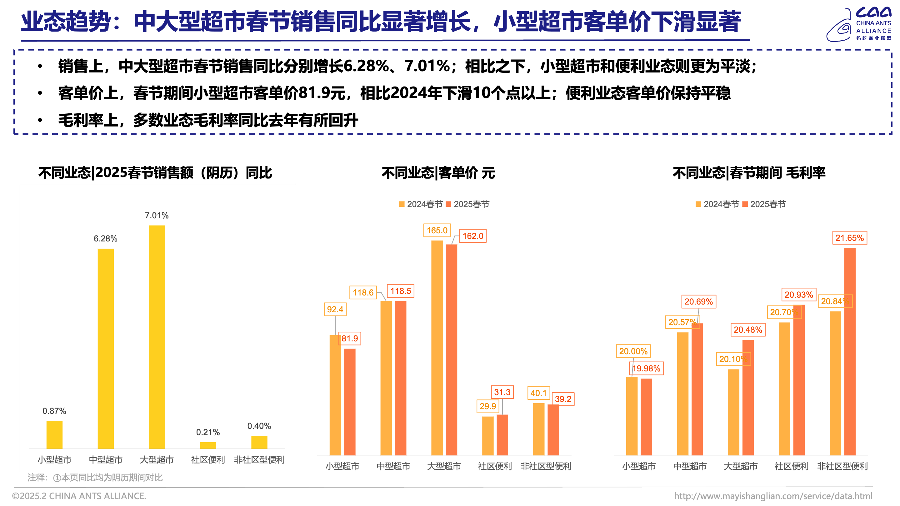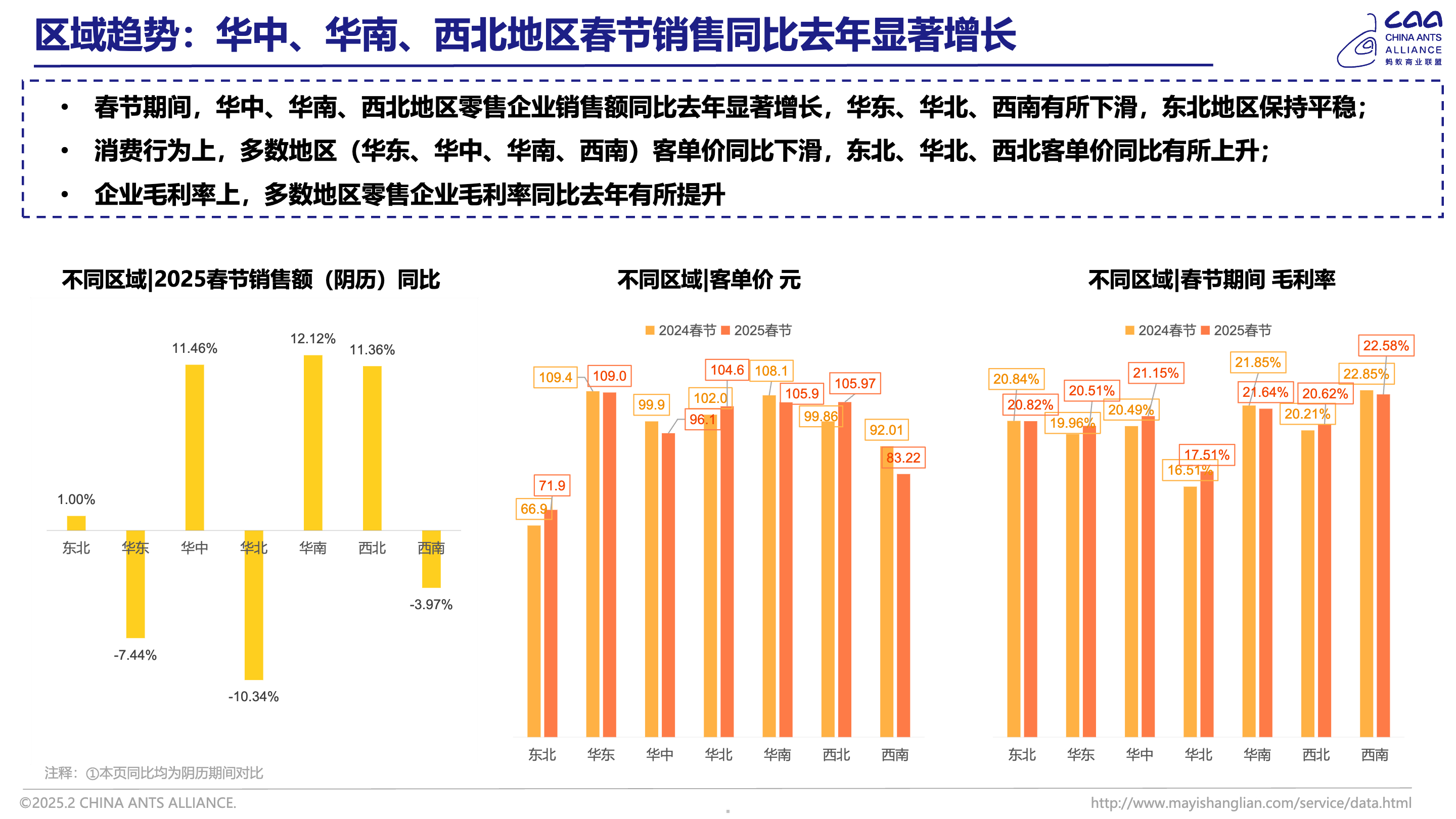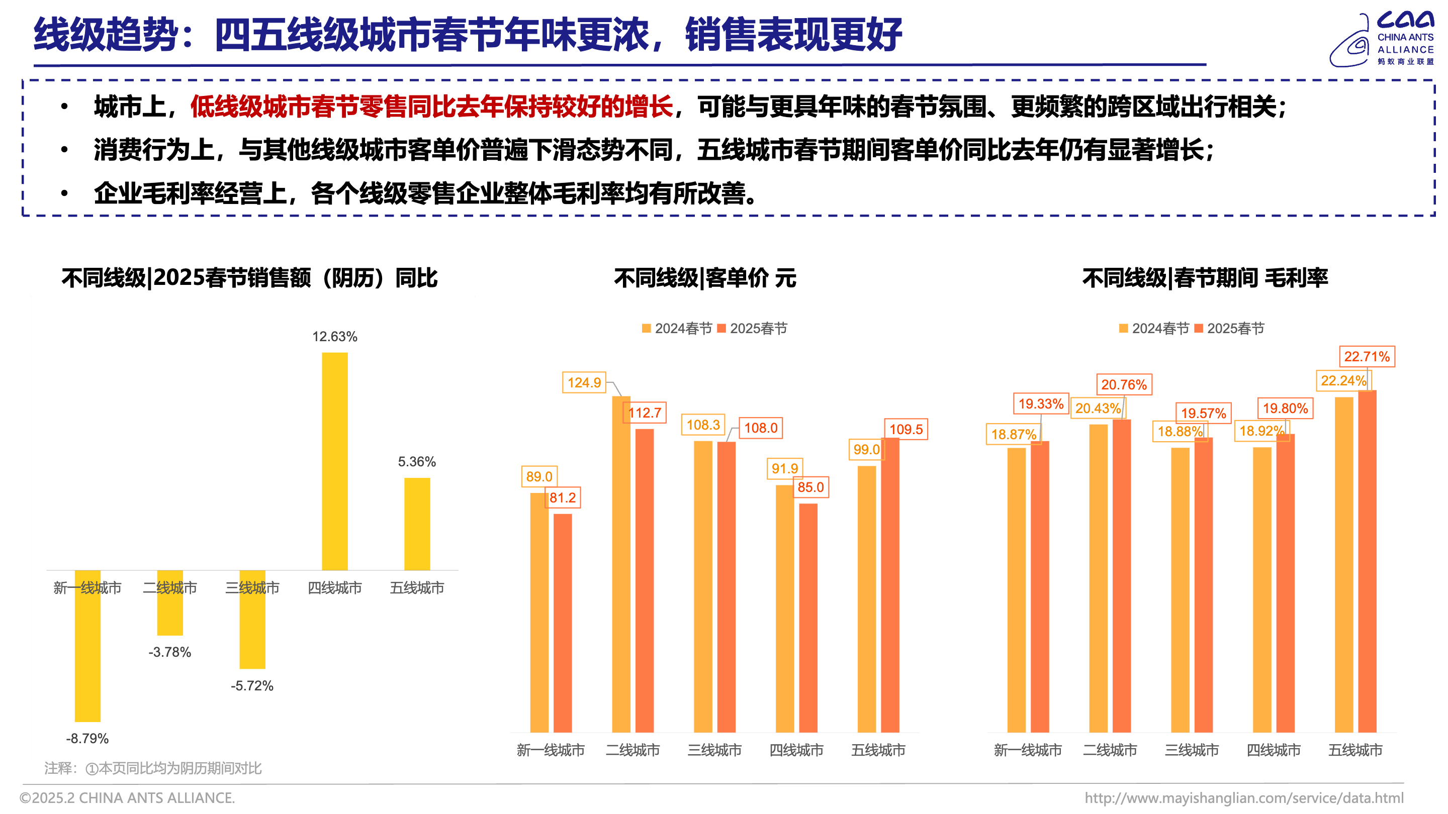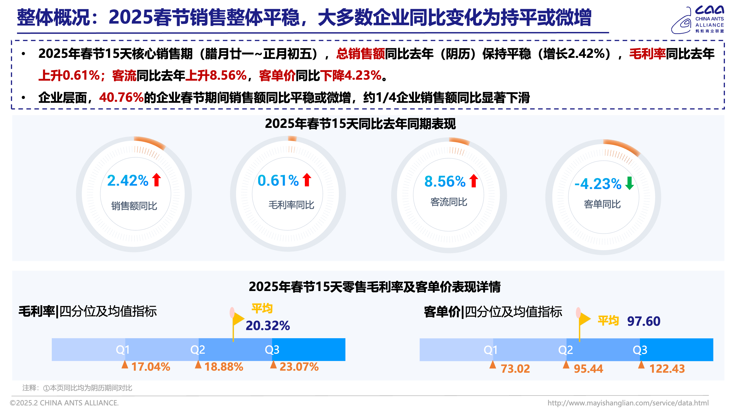 2025年春节15天核心销售期(腊月廿一~正月初五),总销售额同比去年(阴历)保持平稳(增长2.42%),毛利率同比去年上升0.61%;客流同比去年上升8.56%,客单价同比下降4.23%。 其中40.76%的企业春节期间销售额同比平稳或微增,约1/4企业销售额同比显著下滑。 春节期间什么更受欢迎?哪些企业业绩下滑了?更多细节信息,查看完整报告获取~