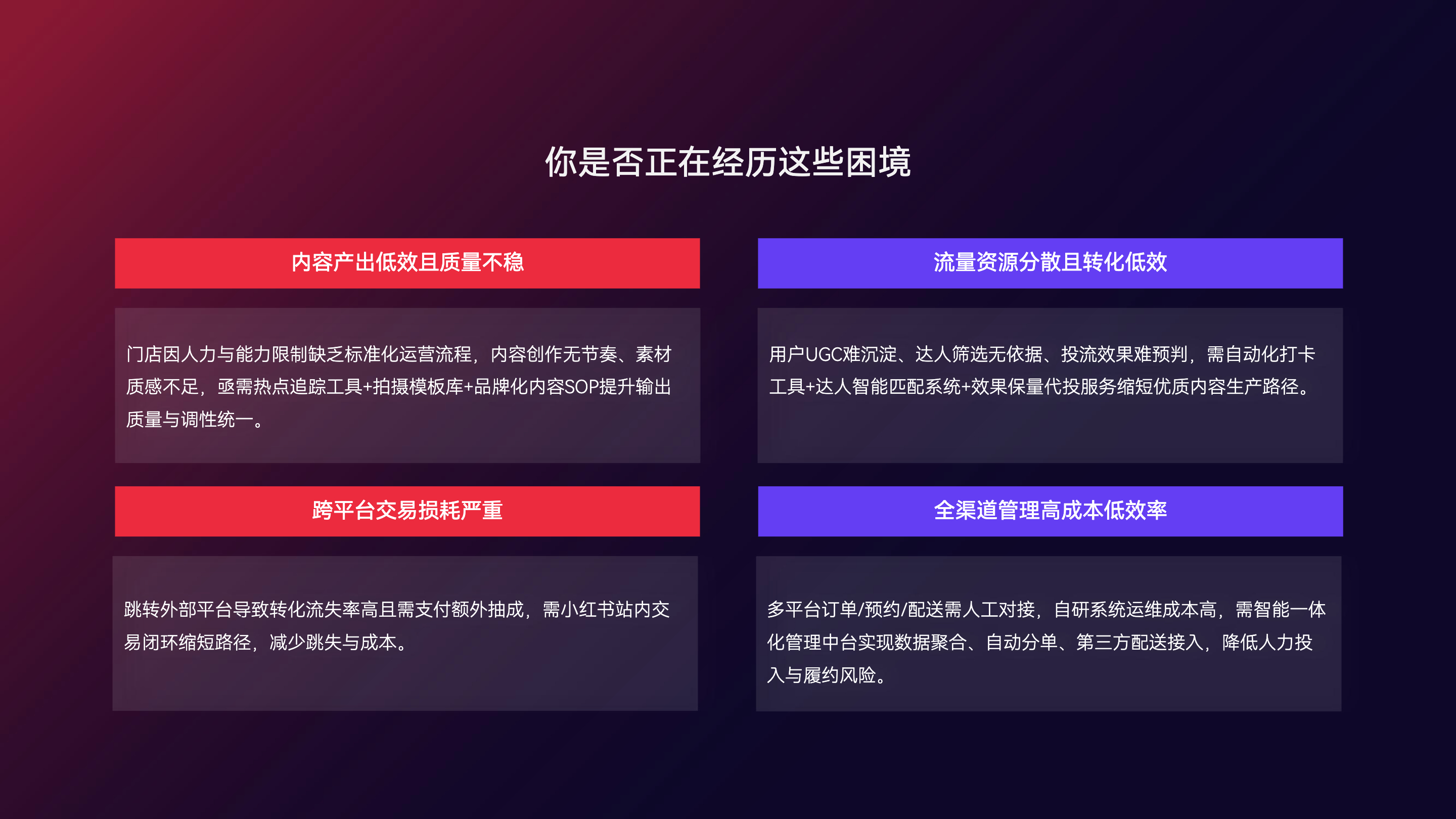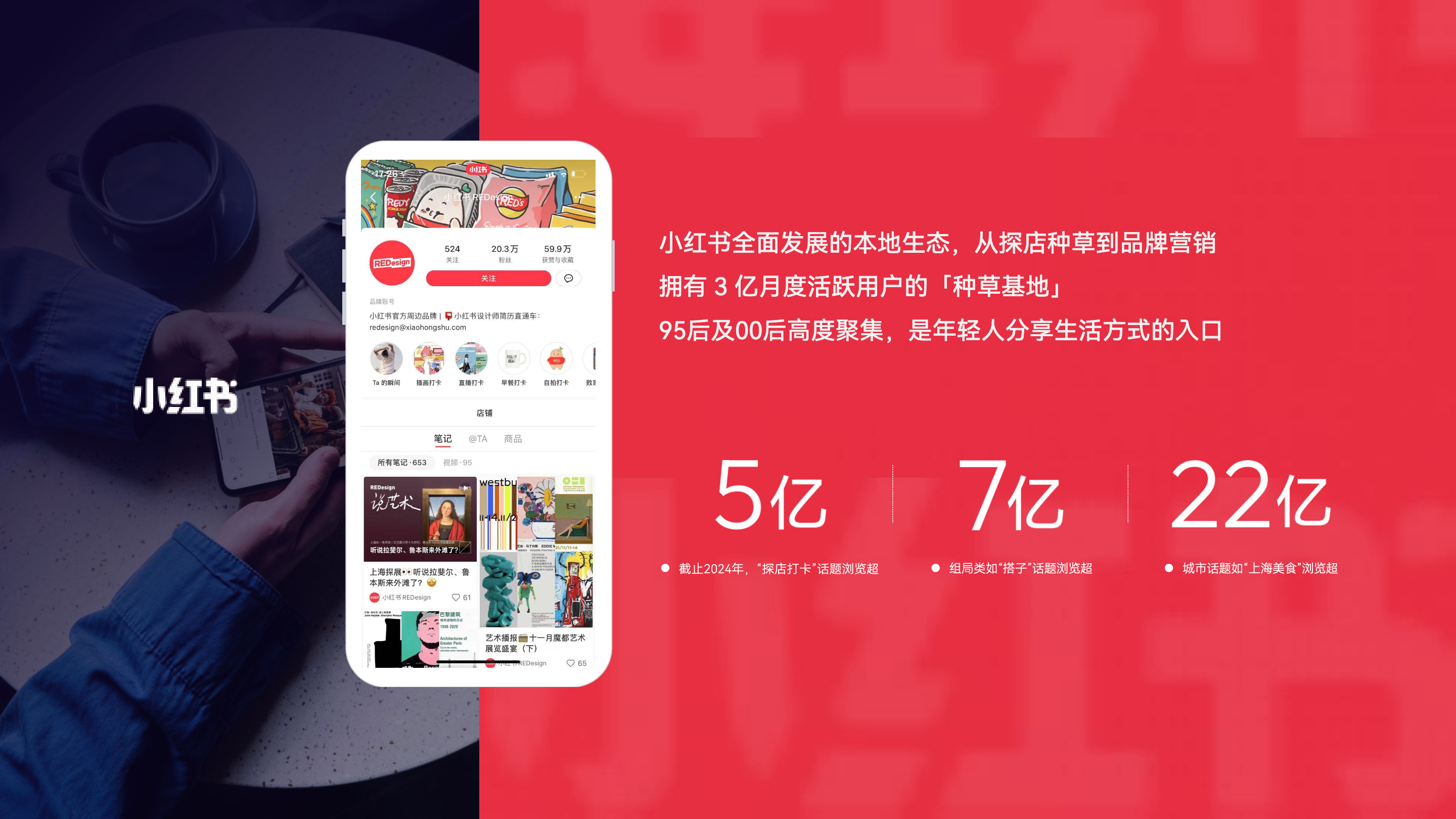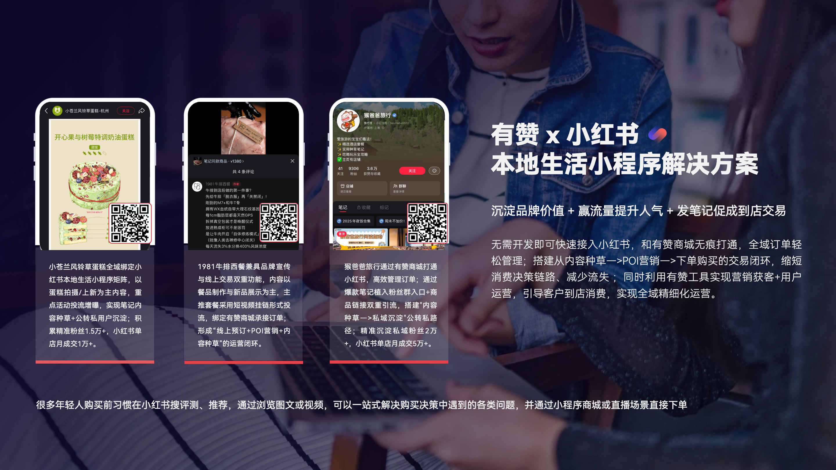 小红书全面发展的本地生态,从探店种草到品牌营销拥有 3 亿月度活跃用户的「种草基地」,95后及00后高度聚集,是年轻人分享生活方式的入口。 有赞x小红书本地生活解决方案,实现内容种草+引流到店+下单转化的经营闭环,助你生意增长。