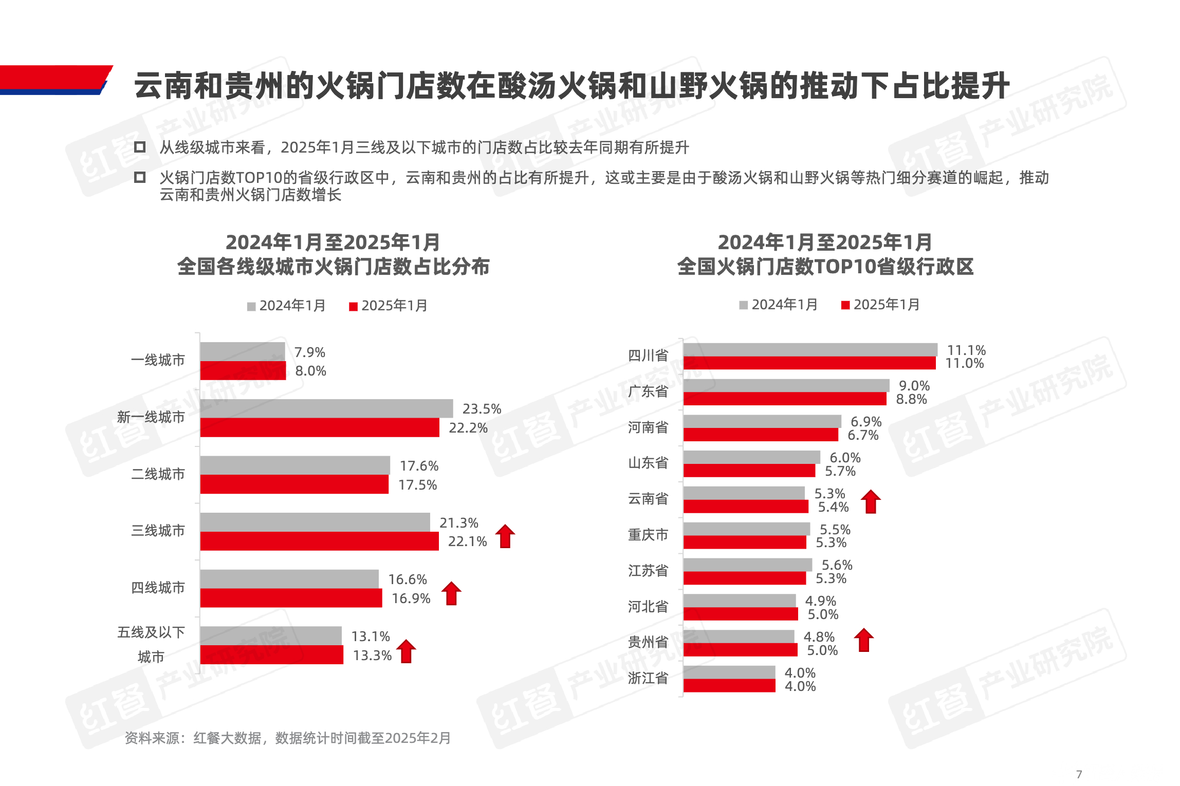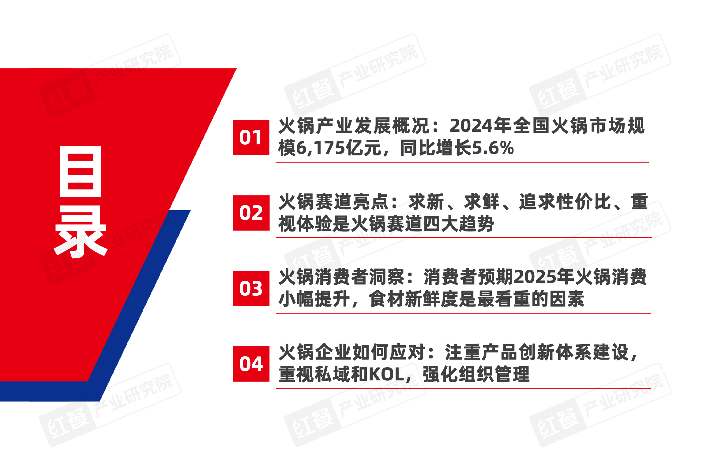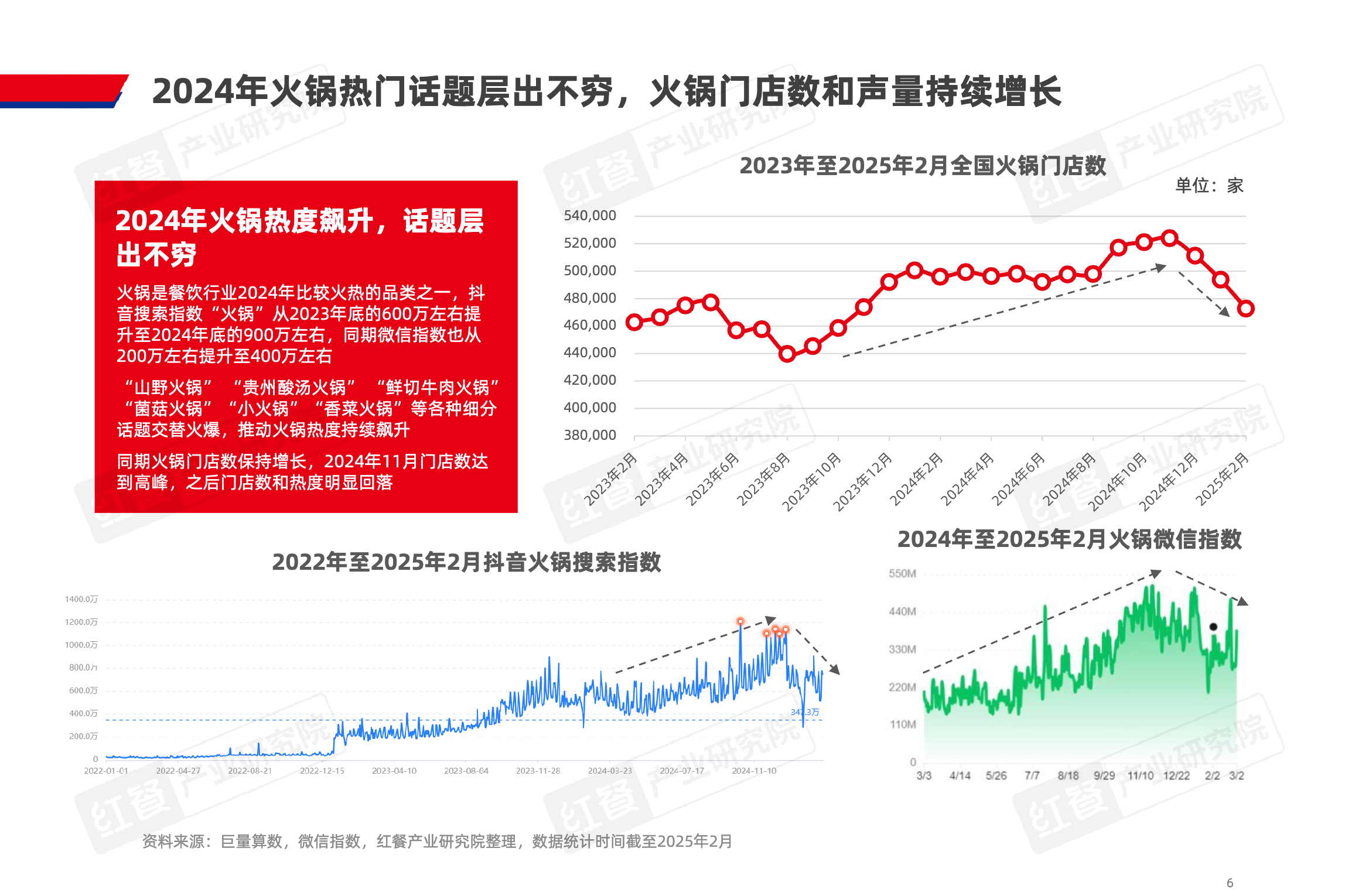 2024年火锅热度较高,全国火锅市场规模6,175亿元,同比增长5.6%,2024年火锅门店数同比增长3.9%,2025年火锅消费频率预期提升,预计2025年火锅市场规模将达到6,500亿元 。 求新、求鲜、追求性价比、重视体验是火锅赛道四大趋势。面对市场产品创新越来越频繁,火锅企业该如何应对呢?查看完整报告获取更多信息~