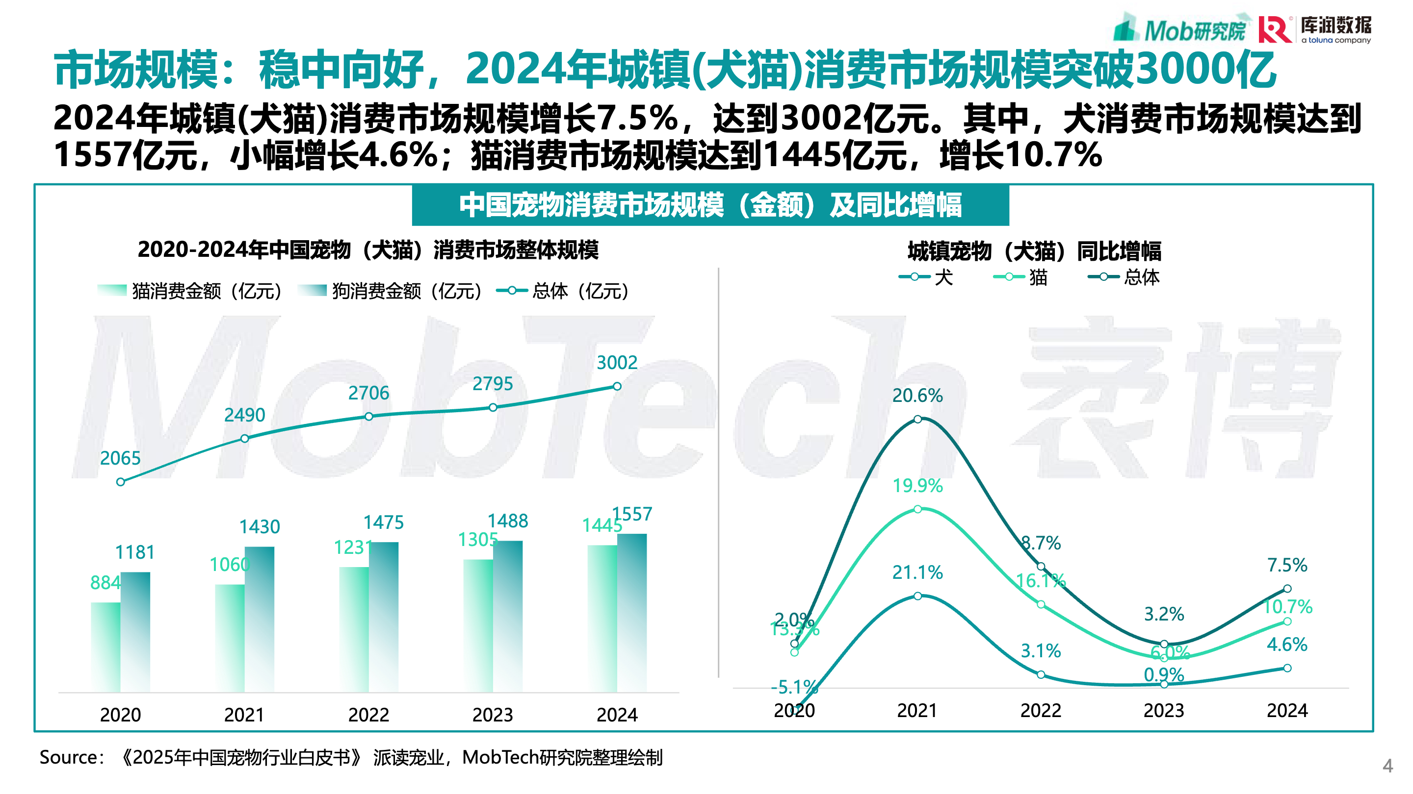 2024年城镇(犬猫)消费市场规模增长7.5%,达到3002亿元。其中,犬消费市场规模达到1557亿元,小幅增长4.6%;猫消费市场规模达到1445亿元,增长10.7%。 如何抓住稳重向好的市场?这4大趋势值得关注!