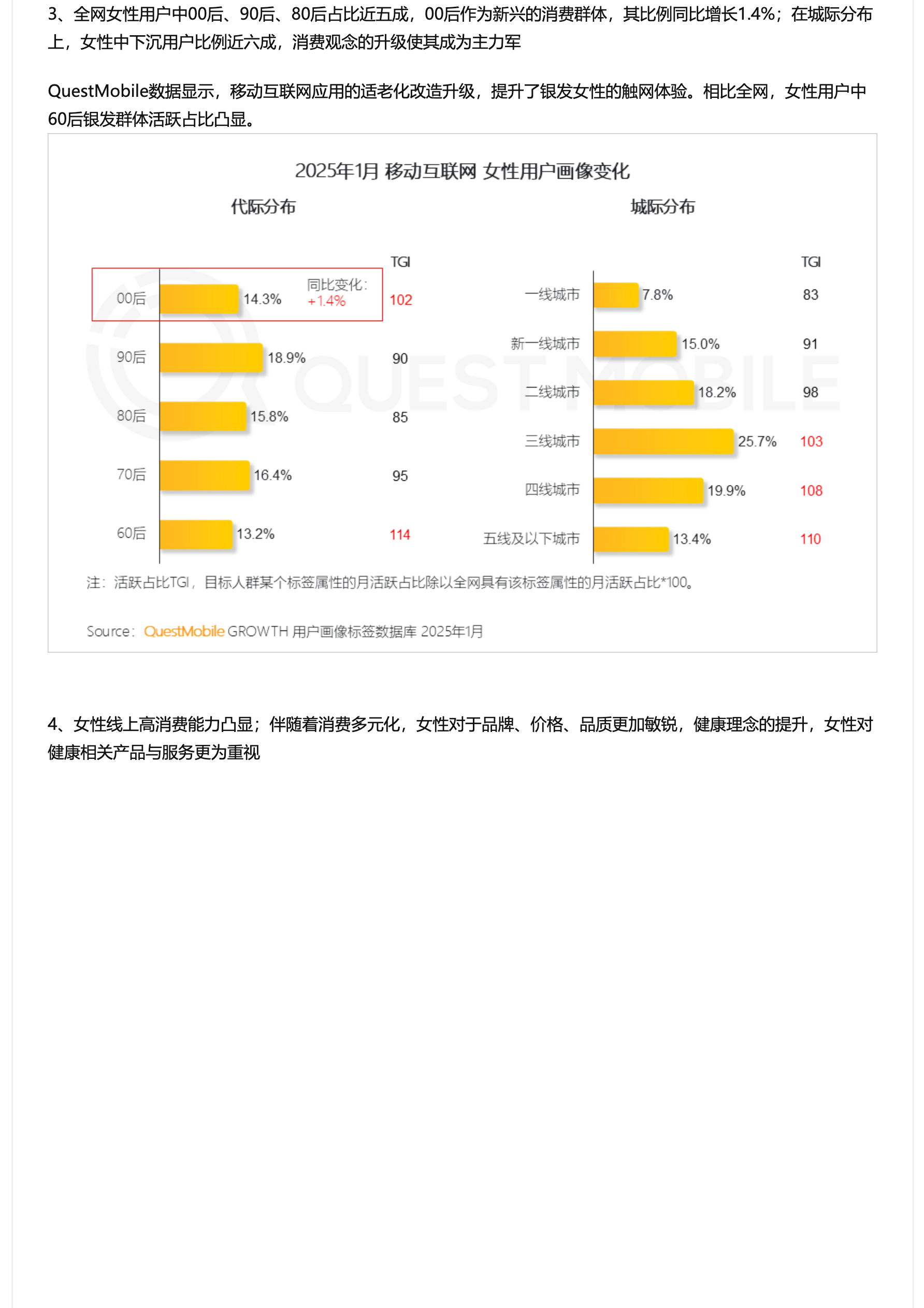 截止到2025年1月,女性用户活跃规模已经达到6.24亿,同比增加了2.6%。其中,80后、90后、00后占比近五成;00后增长较快,同比增加了1.4%。她们线上高消费能力凸显,在视频、生活等领域规模增长显著......更多细节内容,查看完整报告获得~