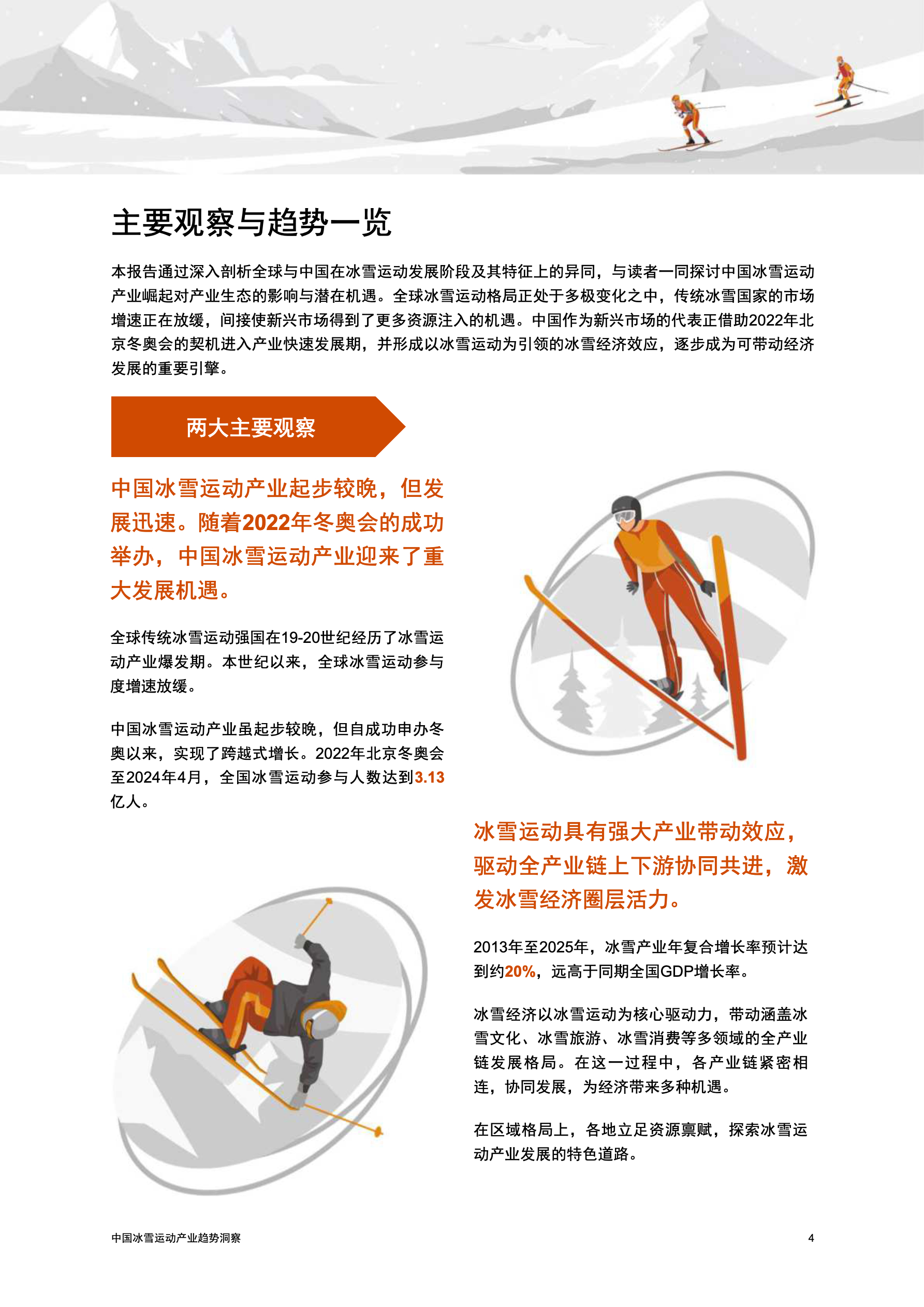 本报告通过深入剖析全球与中国在冰雪运动发展阶段及其特征上的异同,一同探讨中国冰雪运动产业崛起对产业生态的影响与潜在机遇。 全球冰雪运动格局正处于多极变化之中,传统冰雪国家的市场增速正在放缓,间接使新兴市场得到了更多资源注入的机遇。中国作为新兴市场的代表正在进入产业快速发展期,并形成以冰雪运动为引领的冰雪经济效应。