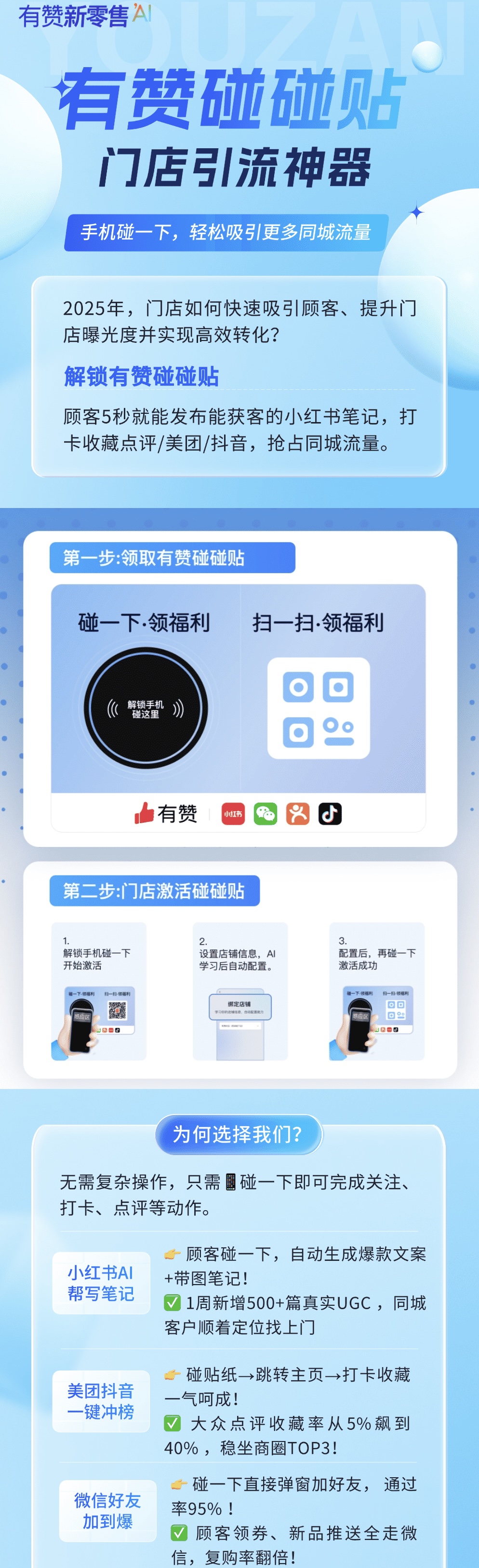 顾客手机碰一下, 基于NFC技术,就能快速完成关注门店的大众点评、美团、抖音账号,打卡、点评、连WiFi、出示会员码、线上点单等。操作简单,效率极高。 只需5秒,顾客就能一键生成能获客笔记、视频,吸引更多潜在客户,获得更多同城流量。