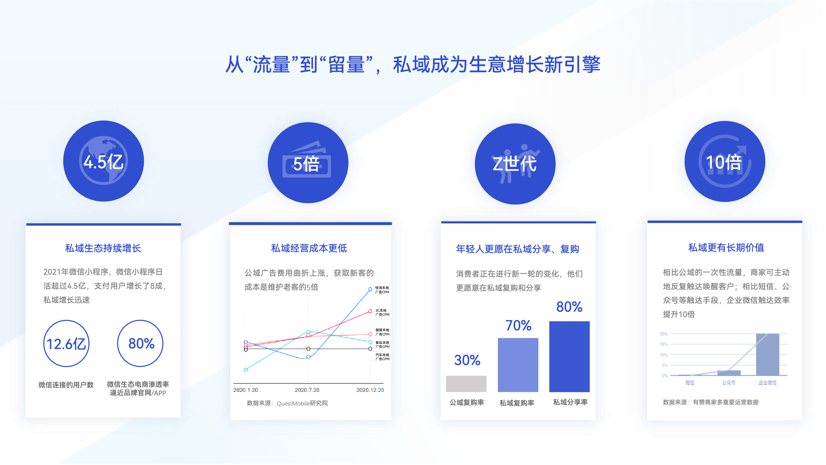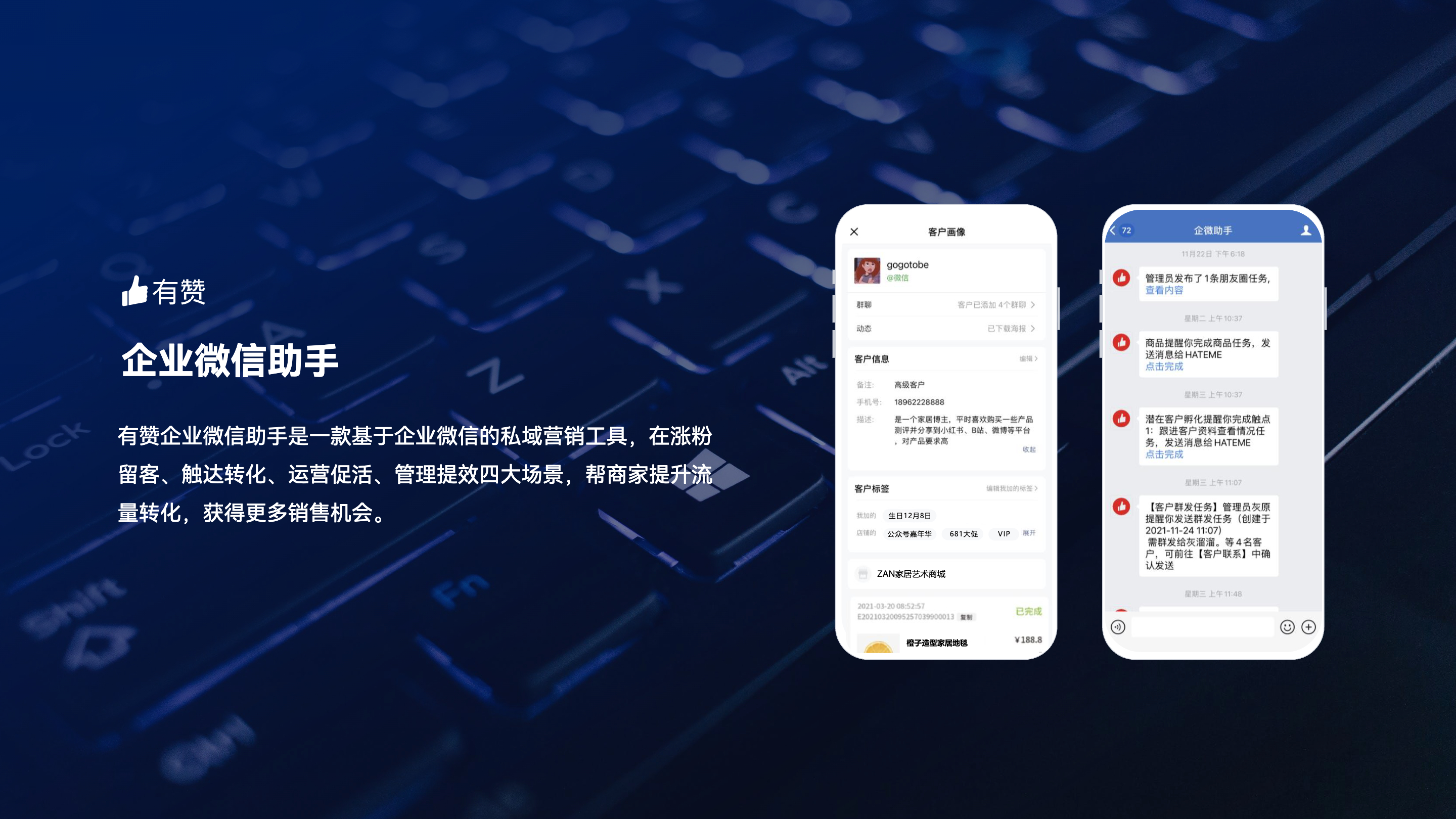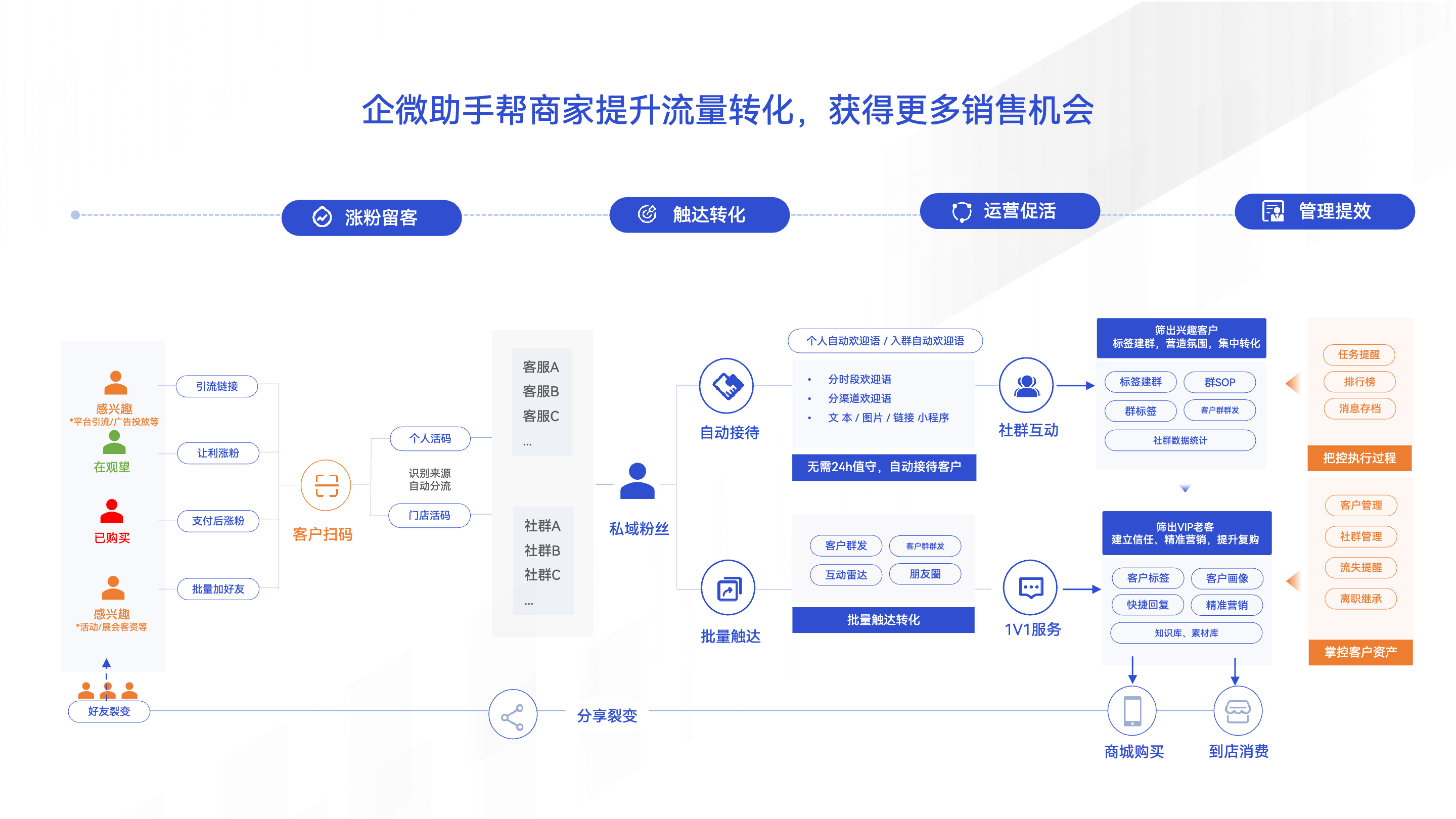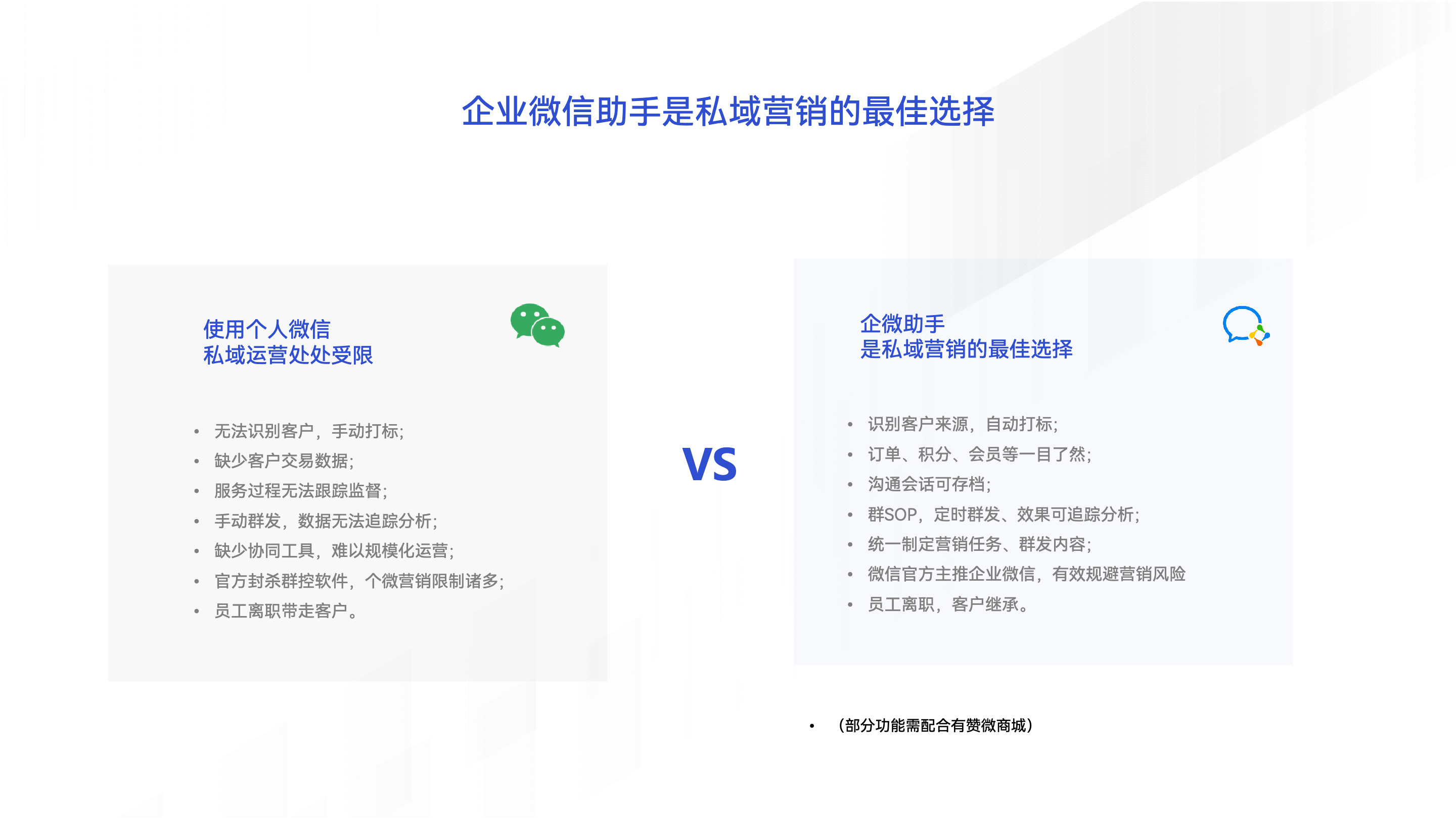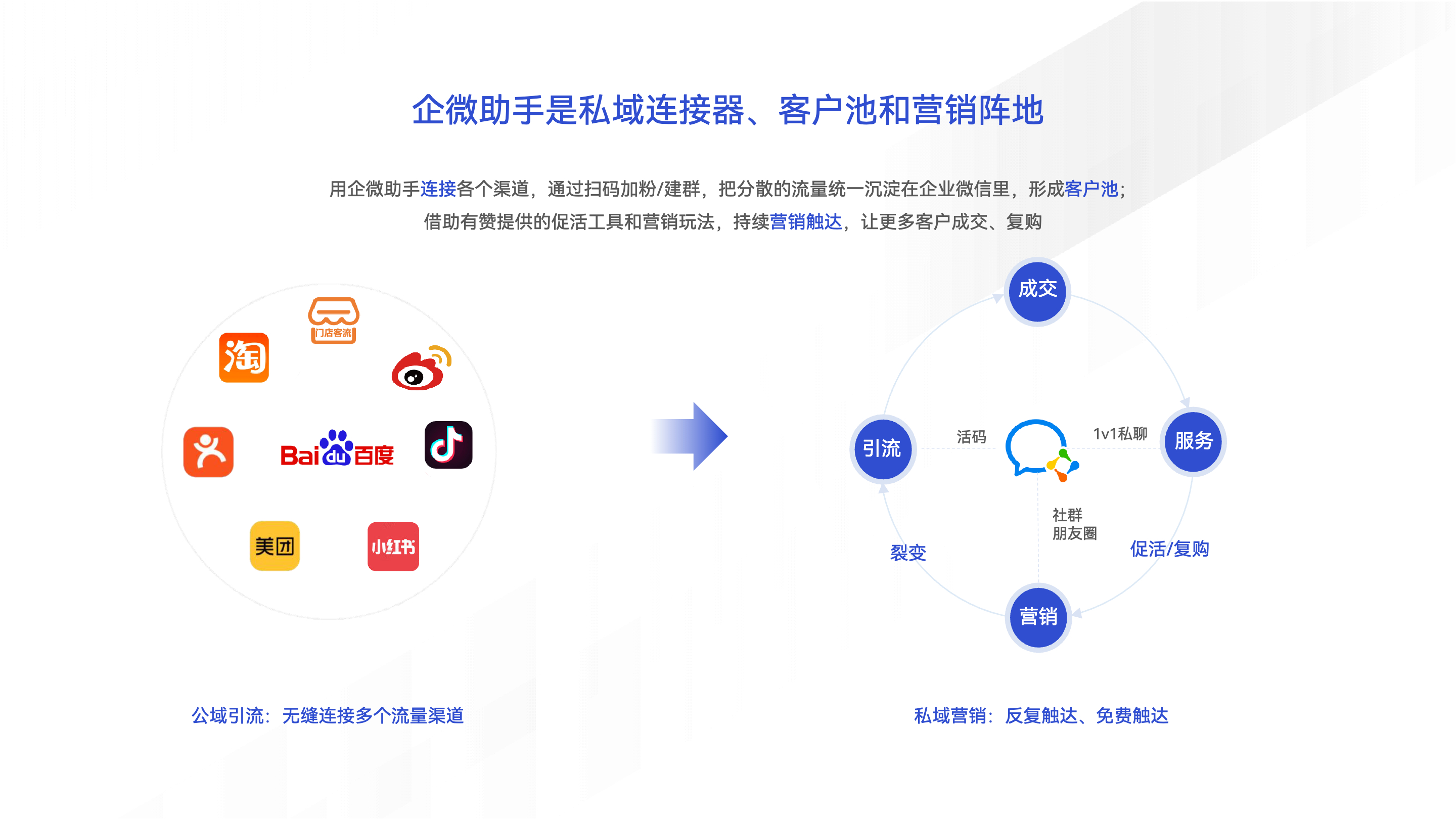 有赞企业微信助手,是开展私域营销的理想选择。使用企业微信帮你把各平台流量、线下门店客流等公域流量,转化成自己的私域流量统一运营,更有6大营销能力,加速流量转化。