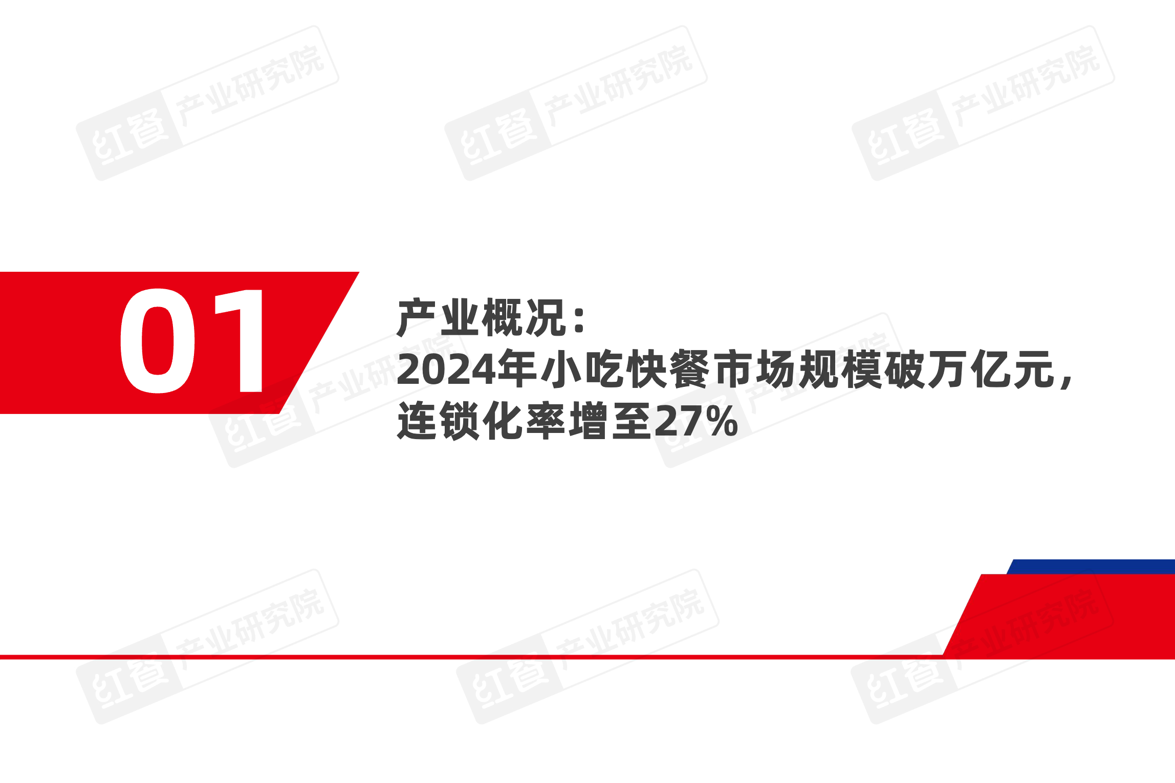 2024年小吃快餐市场规模破万亿元,连锁化率增至27%。其中中式汉堡、薯条、中式炸鸡、砂锅菜、生烫牛肉粉等赛道热度上升,小吃快餐呈现三大趋势:品类融合化、产品细分化、门店运营精细化,更多细节内容查看完整报告获取~