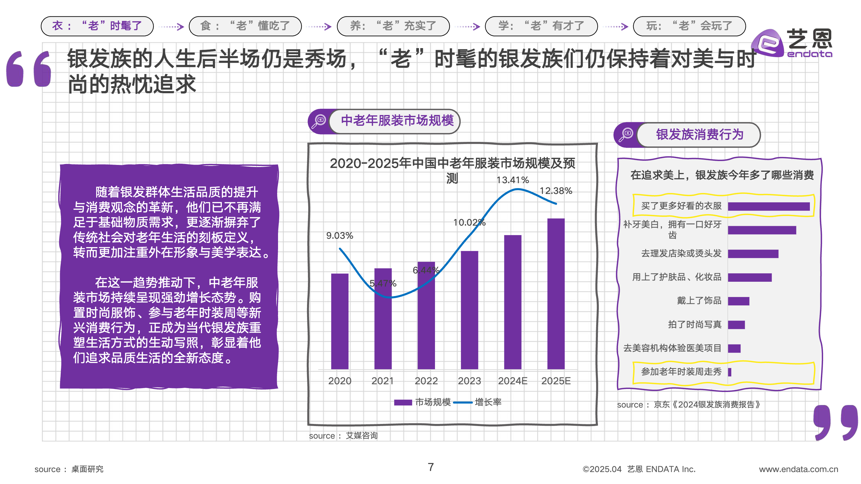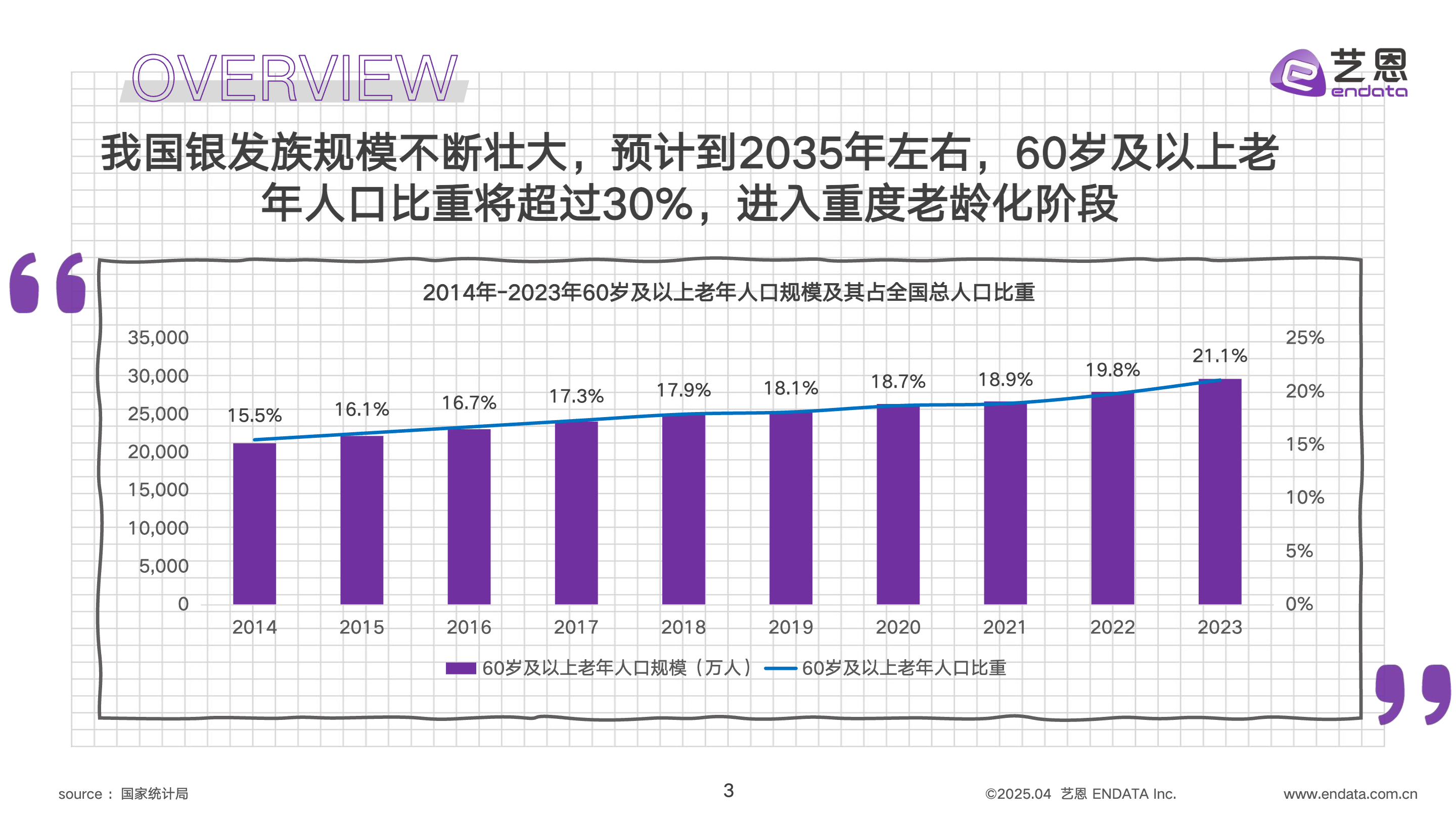 随着中国老龄化进程的持续深化,银发群体正日益成为社会关注焦点。在数字化浪潮的推动下,新一代老年人展现出与刻板印象截然不同的精神风貌:他们热衷美食、精通娱乐、注重自我提升,以积极开放的姿态追求健康、多元、富有活力的生活方式。 这种代际特征的演变,正在悄然消弭传统认知中老年与青年群体的鲜明界限,他们关注什么喜欢什么追求什么?也可以给到相关行业商家参考和灵感。