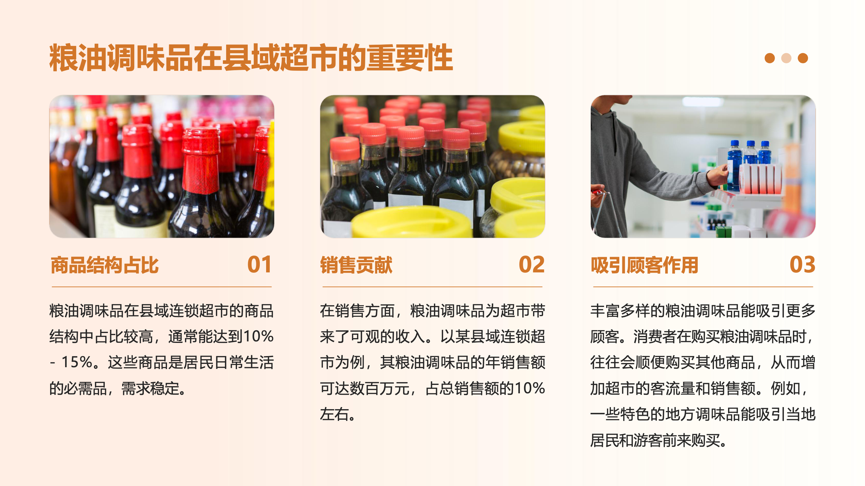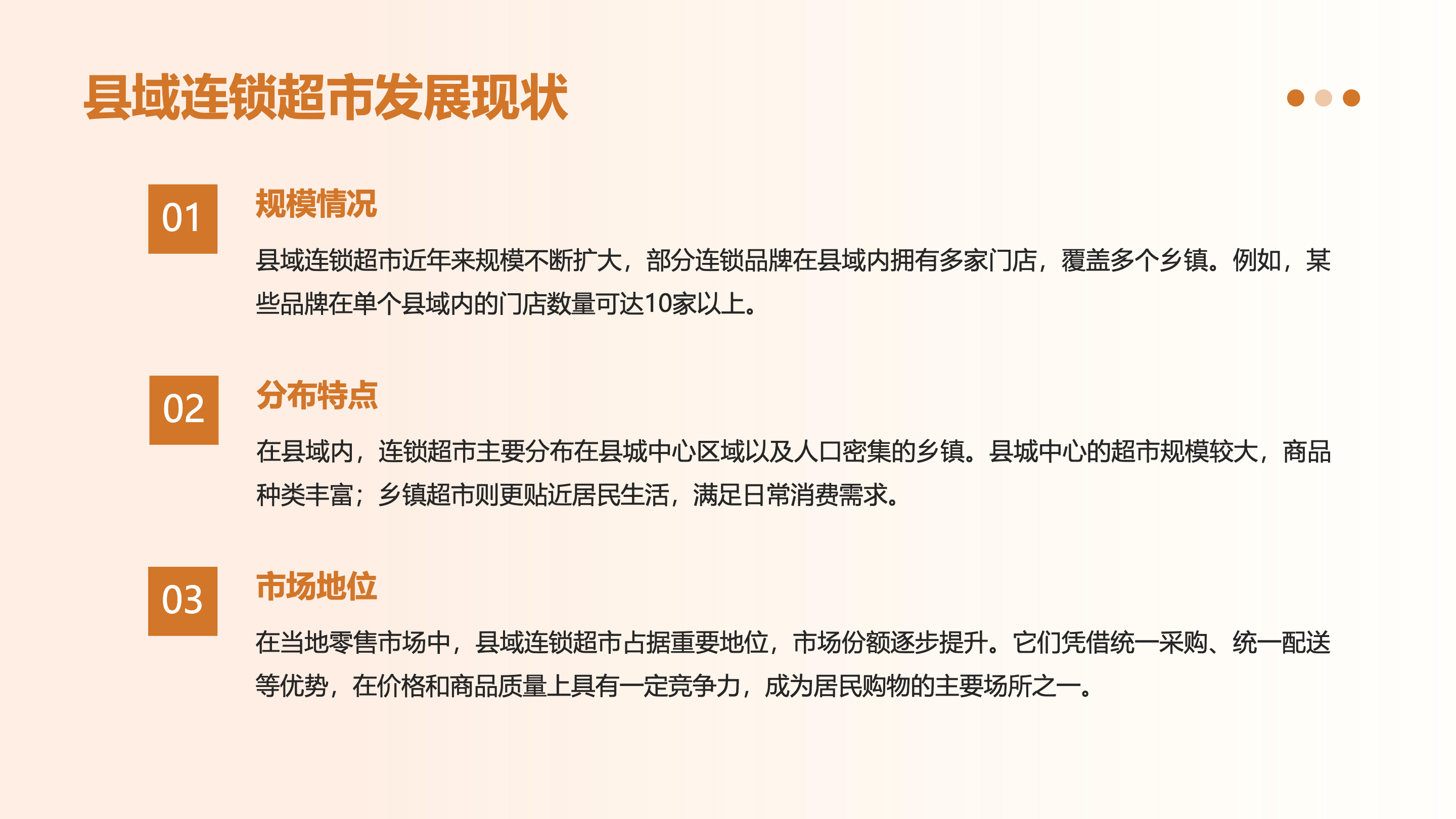 县域连锁超市近年来规模不断扩大,部分连锁品牌在县域内拥有多家门店,覆盖多个乡镇。例如,某些品牌在单个县域内的门店数量可达10家以上。 在当地零售市场中,县域连锁超市占据重要地位,市场份额逐步提升。它们凭借统一采购、统一配送等优势,在价格和商品质量上具有一定竞争力,成为居民购物的主要场所之一。