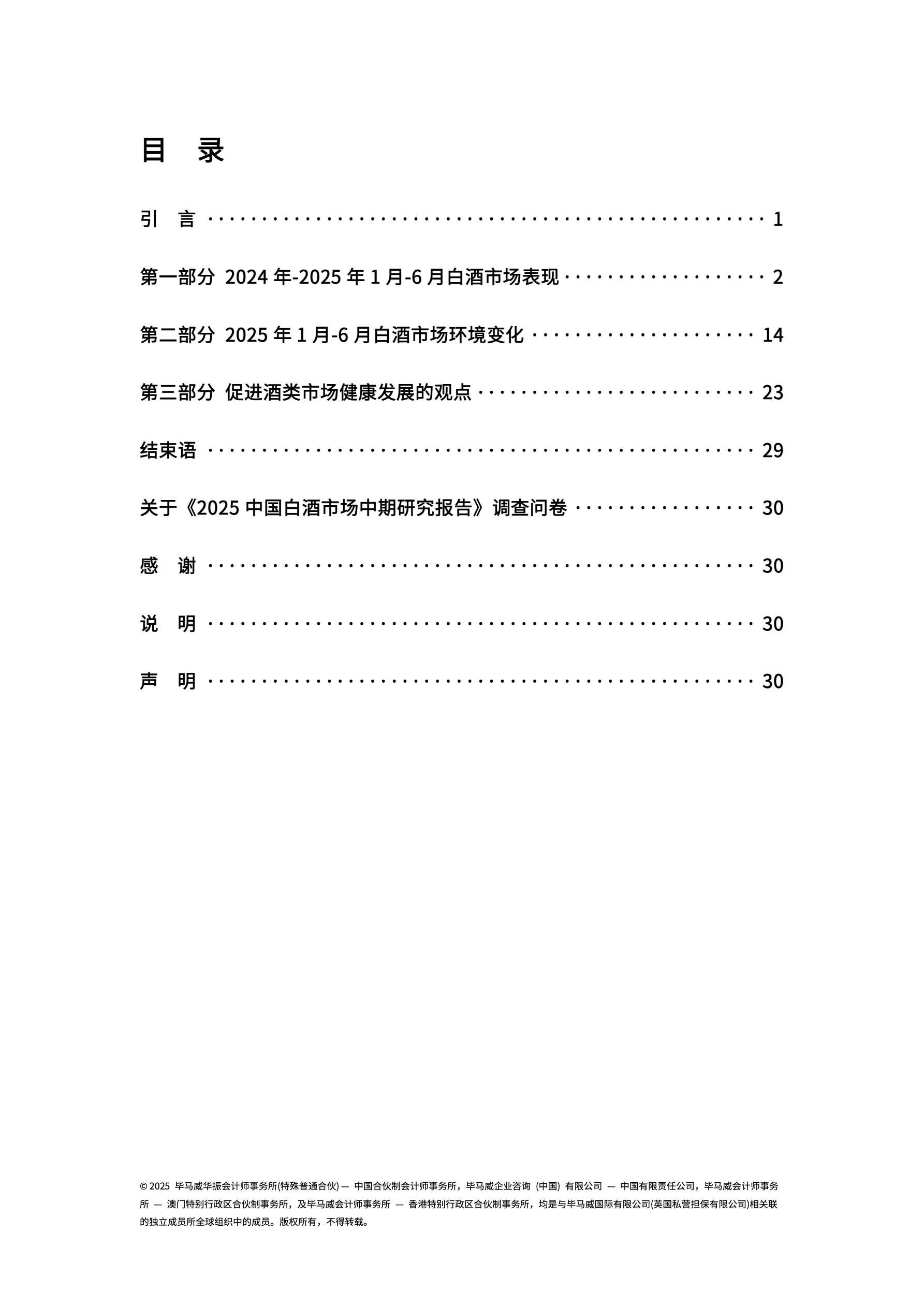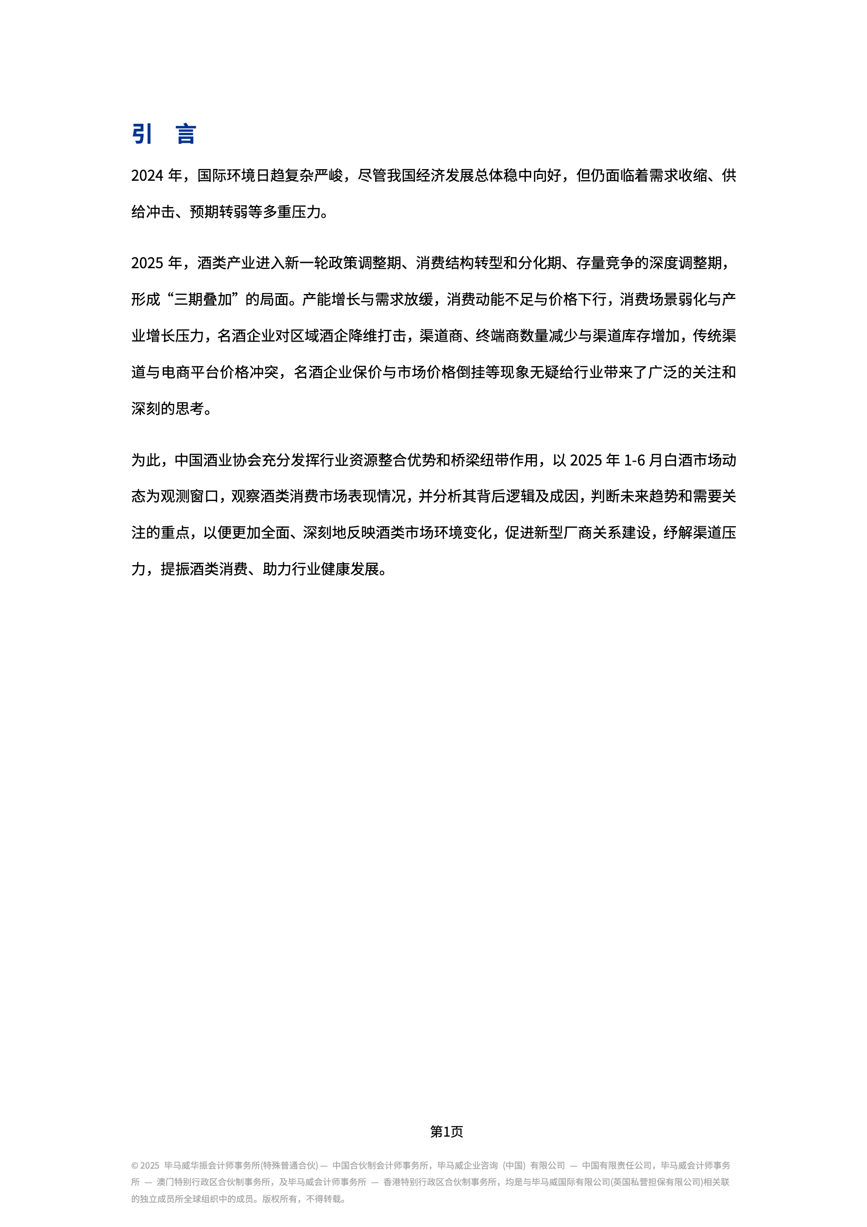 本报告以 2025 年 1-6 月白酒市场动态为观测窗口,观察酒类消费市场表现情况,并分析其背后逻辑及成因,判断未来趋势和需要关注的重点,以便更加全面、深刻地反映酒类市场环境变化,促进新型厂商关系建设,纾解渠道压力,提振酒类消费、助力行业健康发展。