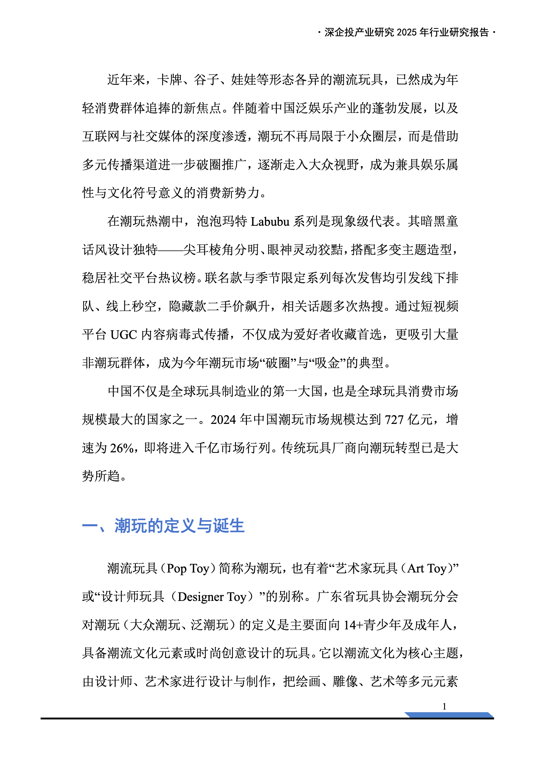 中国不仅是全球玩具制造业的第一大国,也是全球玩具消费市场规模最大的国家之一。2024 年中国潮玩市场规模达到 727 亿元,增速为 26%,即将进入千亿市场行列。在潮玩热潮中,泡泡玛特 Labubu 系列是现象级代表,现在传统玩具厂商向潮玩转型已是大势所趋。