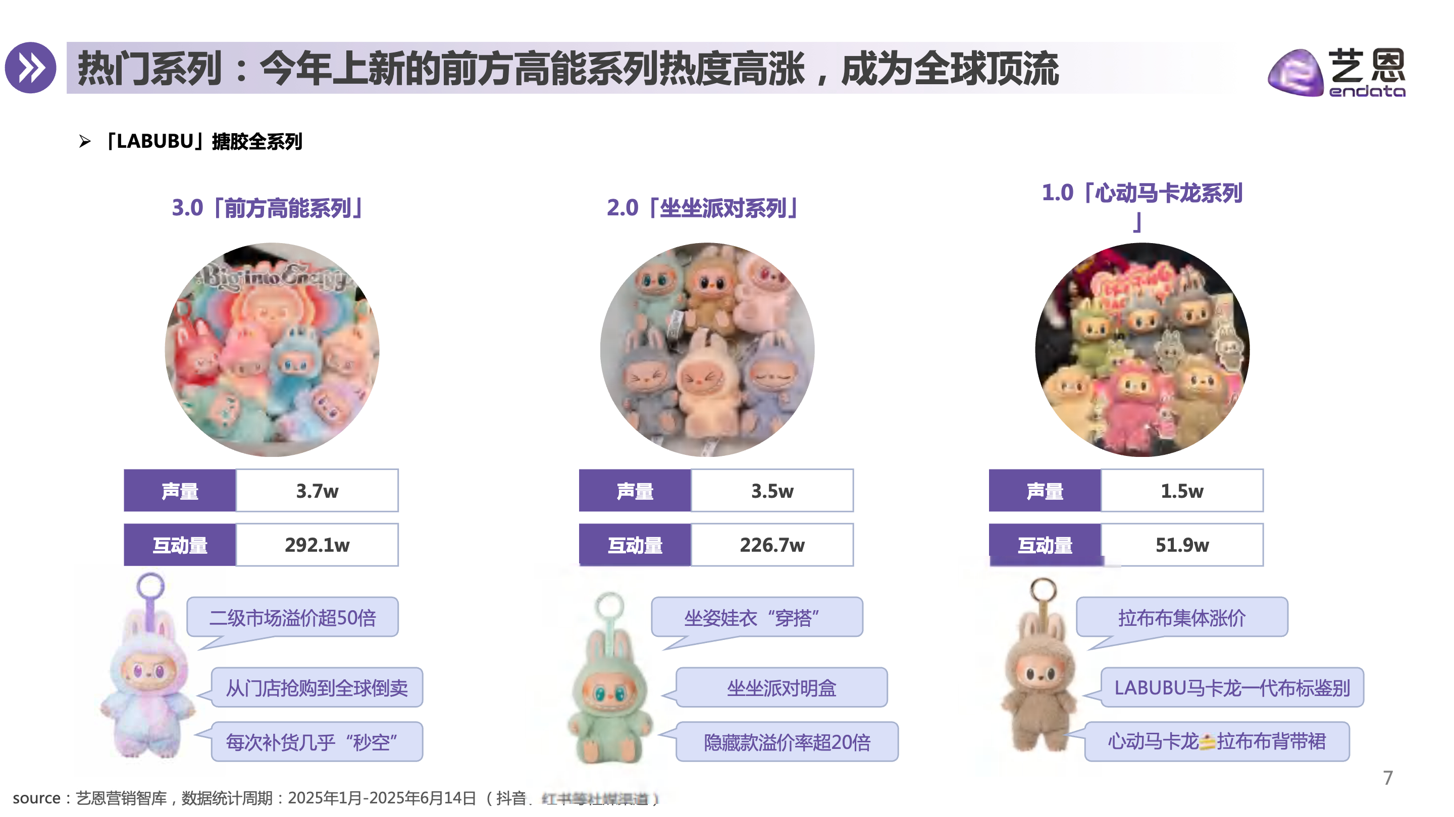 2025年,LABUBU的热度在明星带动、社交话题与盲盒稀缺性营销的推动下持续爆发,不仅成为潮玩界的投资新宠,更以“文化符号”之姿引发全球范围内的情感共鸣与争议讨论。 LABUBU的爆火不仅是一场关于潮玩的胜利,更是IP如何跨越文化边界、品牌如何借势进行联名营销的生动实践。在联名方面,艺恩倾力打造IP营销解决方案,希望助力更多IP和品牌在多元生态中找到自己的“爆点公式”。