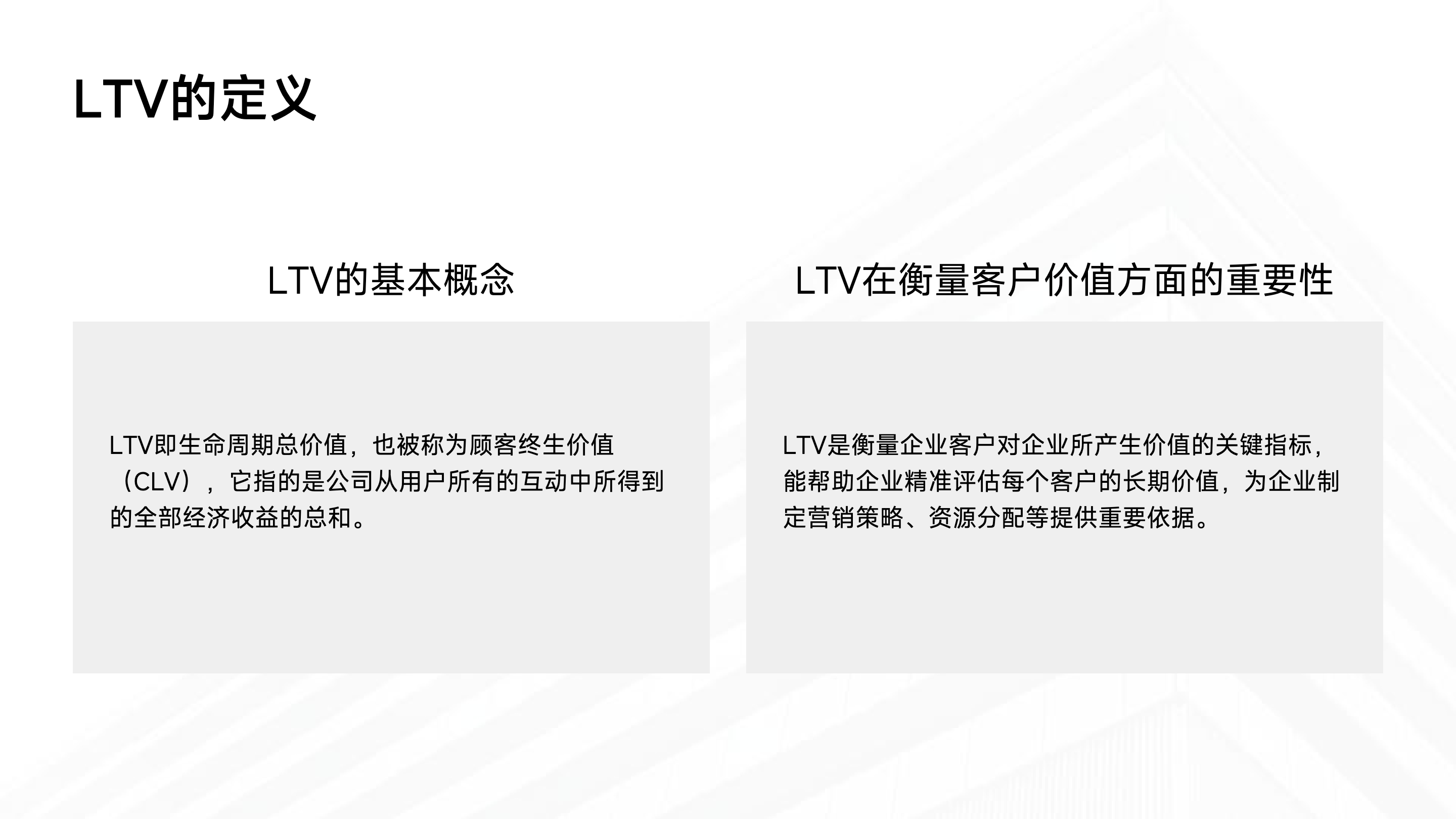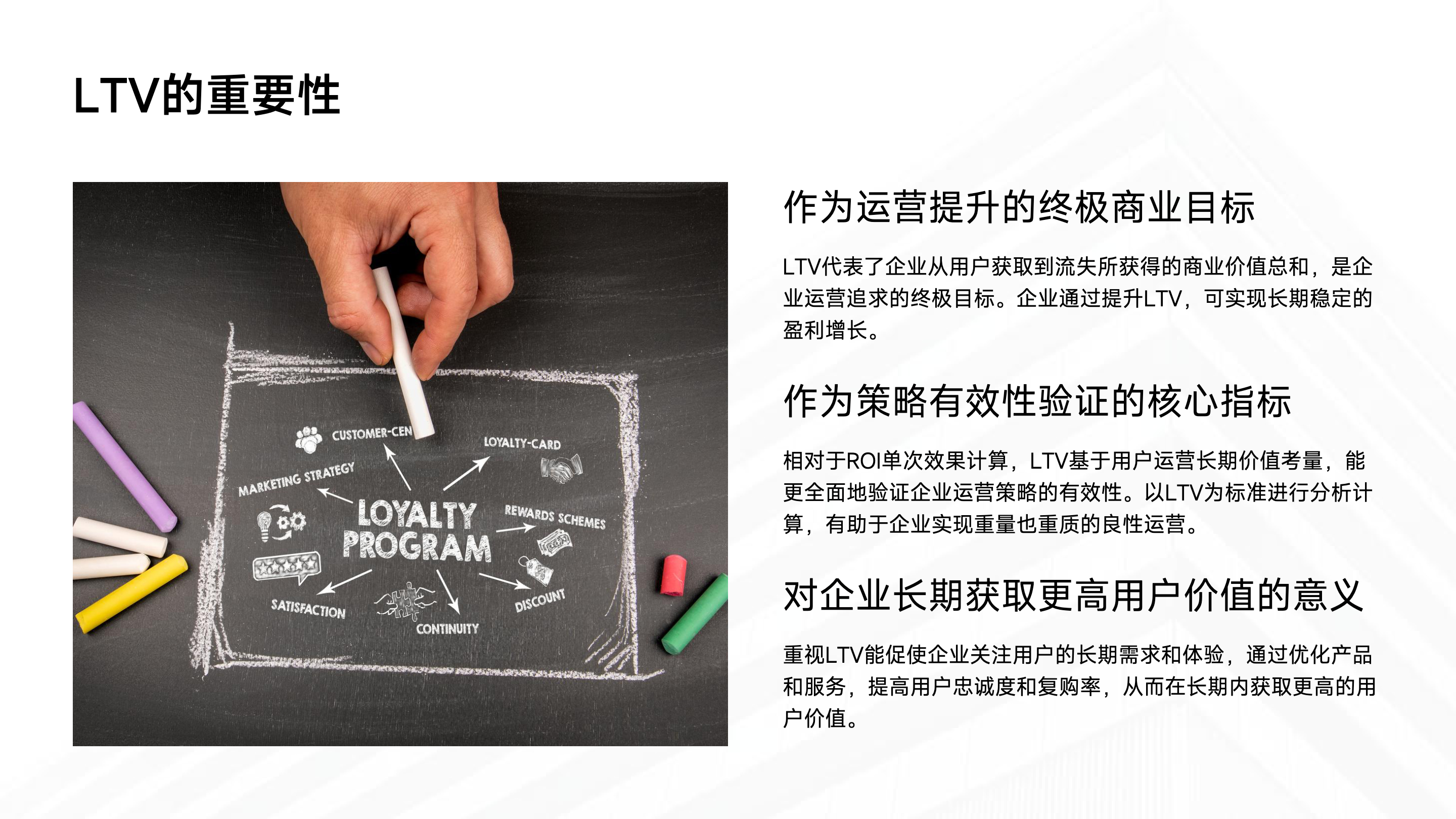 LTV代表了企业从用户获取到流失所获得的商业价值总和,是企业运营追求的终极目标。企业通过提升LTV,可实现长期稳定的盈利增长。 重视LTV能促使企业关注用户的长期需求和体验,通过优化产品和服务,提高用户忠诚度和复购率,从而在长期内获取更高的用户价值。 查看完整报告获取更多方法论~