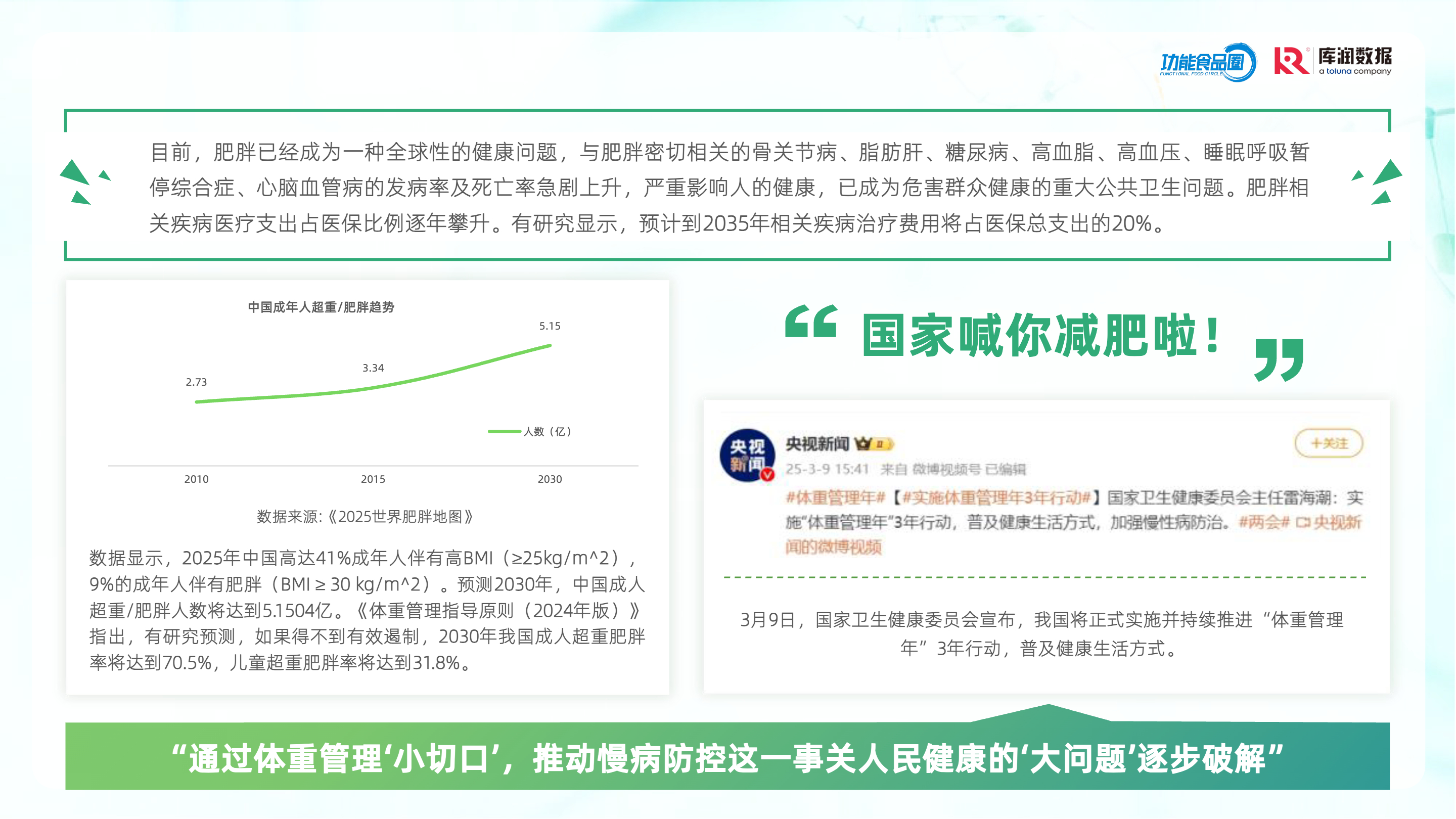 伴随我国超重肥胖率持续攀升及健康风险加剧,体重管理食品市场呈现强劲增长态势。 本报告重点聚焦体重管理食品的消费者洞察,旨在通过研究消费者的购买动机、产品关注点、品牌偏好及购买渠道等关键维度,剖析消费心理、消费行为偏好与核心需求等,深入洞察体重管理食品的消费趋势。