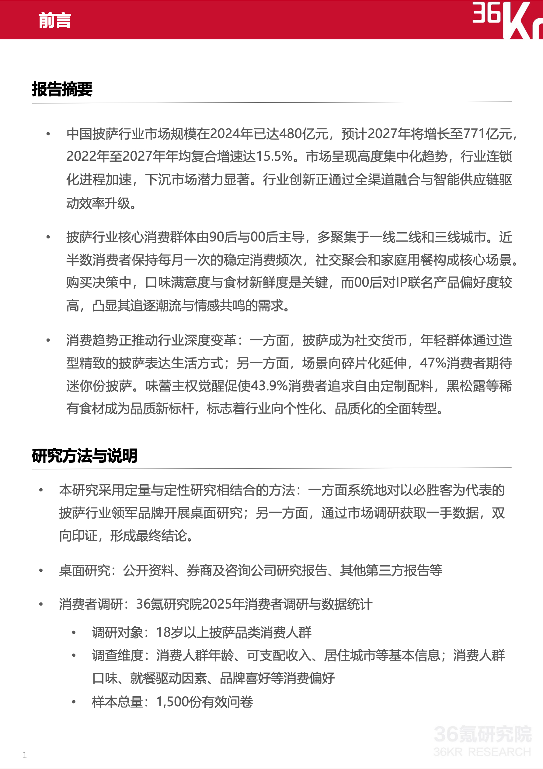 中国披萨行业市场规模在2024年已达480亿元,预计2027年将增长至771亿元,2022年至2027年年均复合增速达15.5%。市场呈现高度集中化趋势,行业连锁化进程加速,下沉市场潜力显著。消费者用户画像和消费趋势如何呢?查看完整报告获取更多消息~