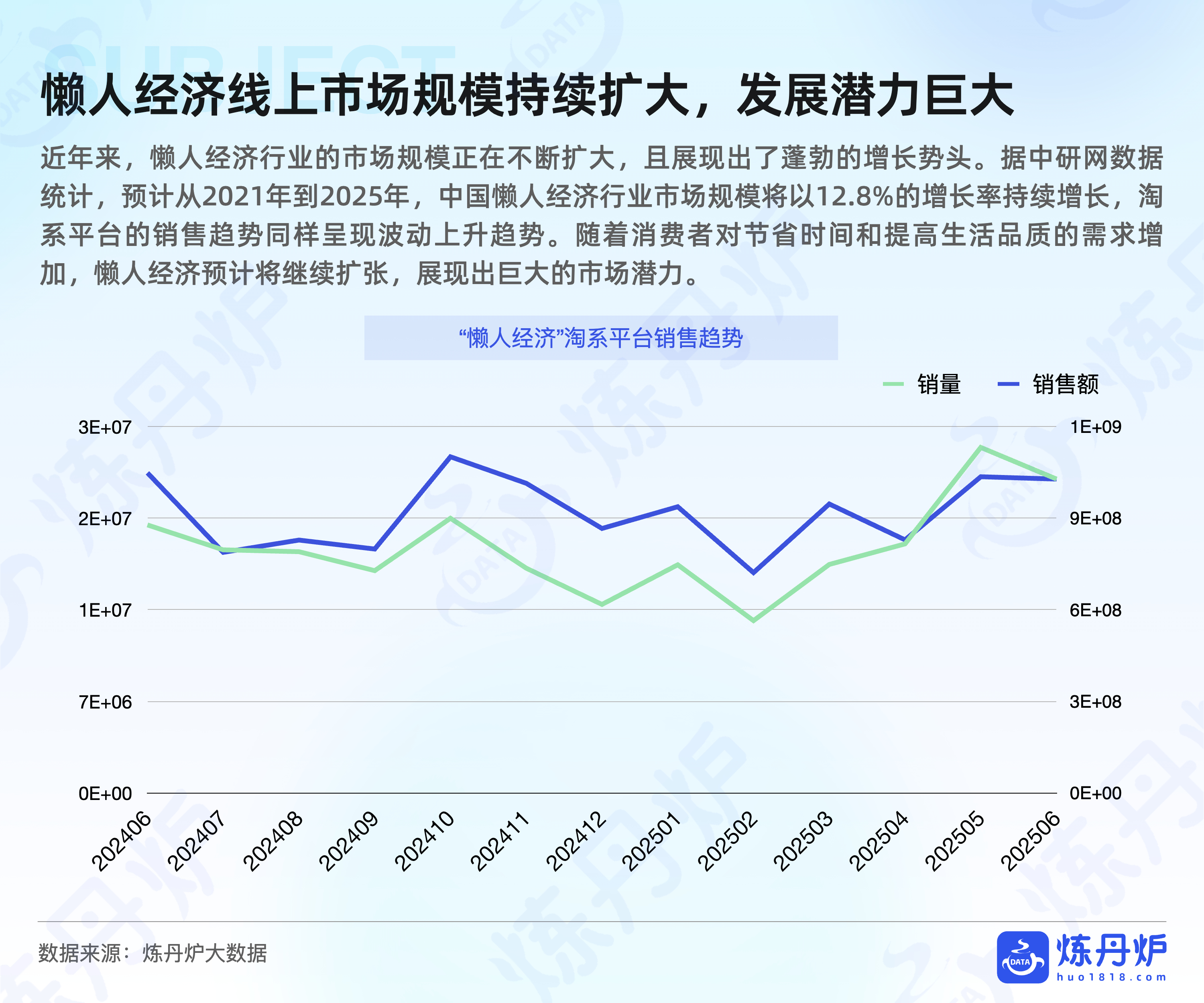 近年来,懒人经济行业的市场规模正在不断扩大,且展现出了蓬勃的增长势头。据中研网数据 统计,预计从2021年到2025年,中国懒人经济行业市场规模将以12.8%的增长率持续增长,淘 系平台的销售趋势同样呈现波动上升趋势。随着消费者对节省时间和提高生活品质的需求增加,懒人经济预计将继续扩张,展现出巨大的市场潜力。