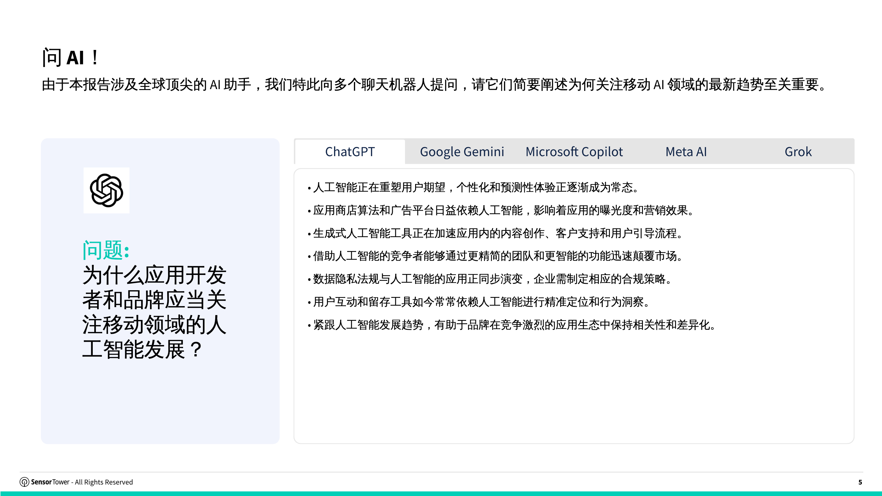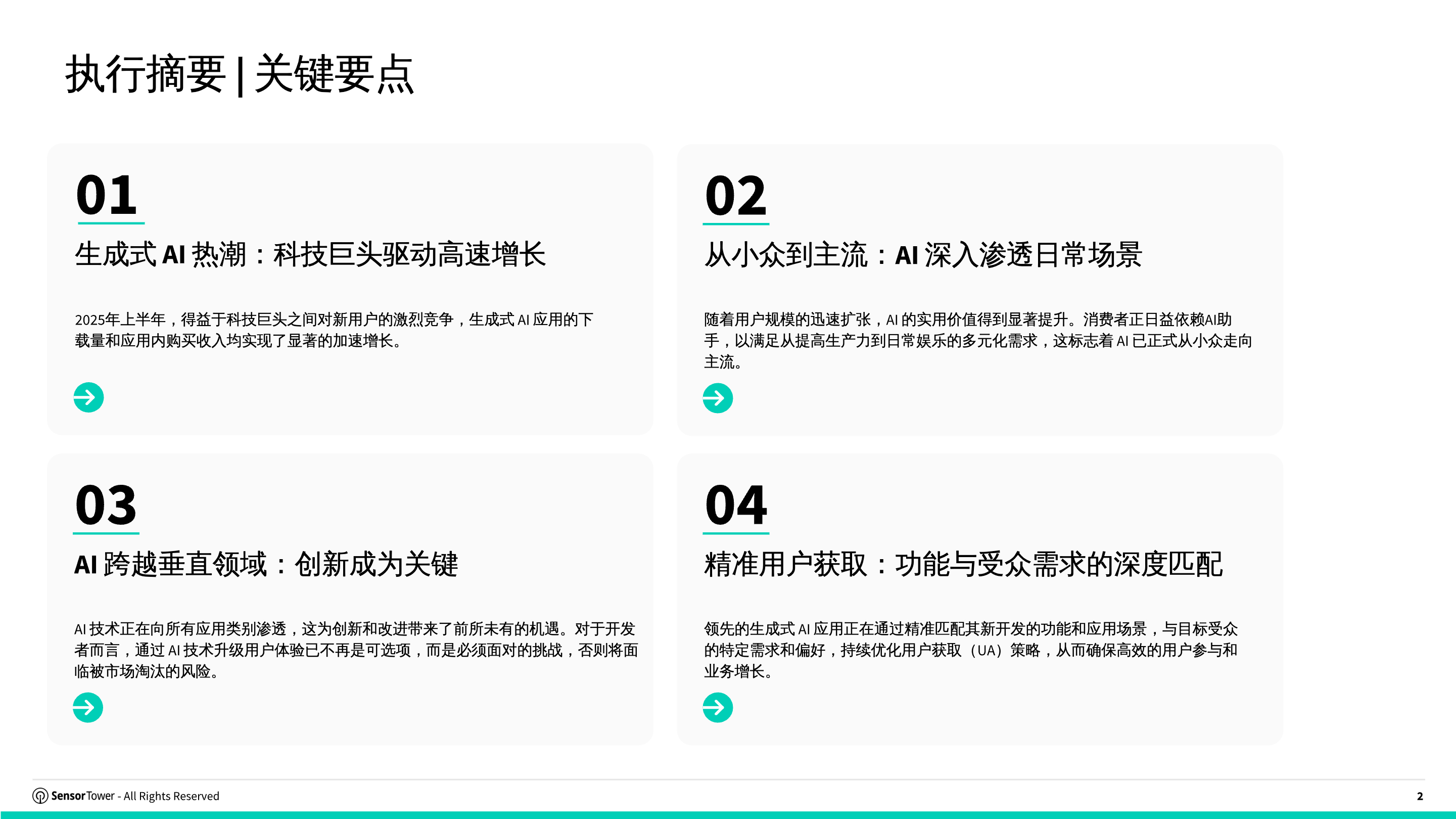 2025年上半年,得益于科技巨头之间对新用户的激烈竞争,生成式 AI 应用的下载量和应用内购买收入均实现了显著的加速增长。 随着用户规模的迅速扩张,AI 的实用价值得到显著提升。消费者正日益依赖AI助手,以满足从提高生产力到日常娱乐的多元化需求,这标志着 AI 已正式从小众走向主流。 更多市场应用及洞察,查看完整报告获取~