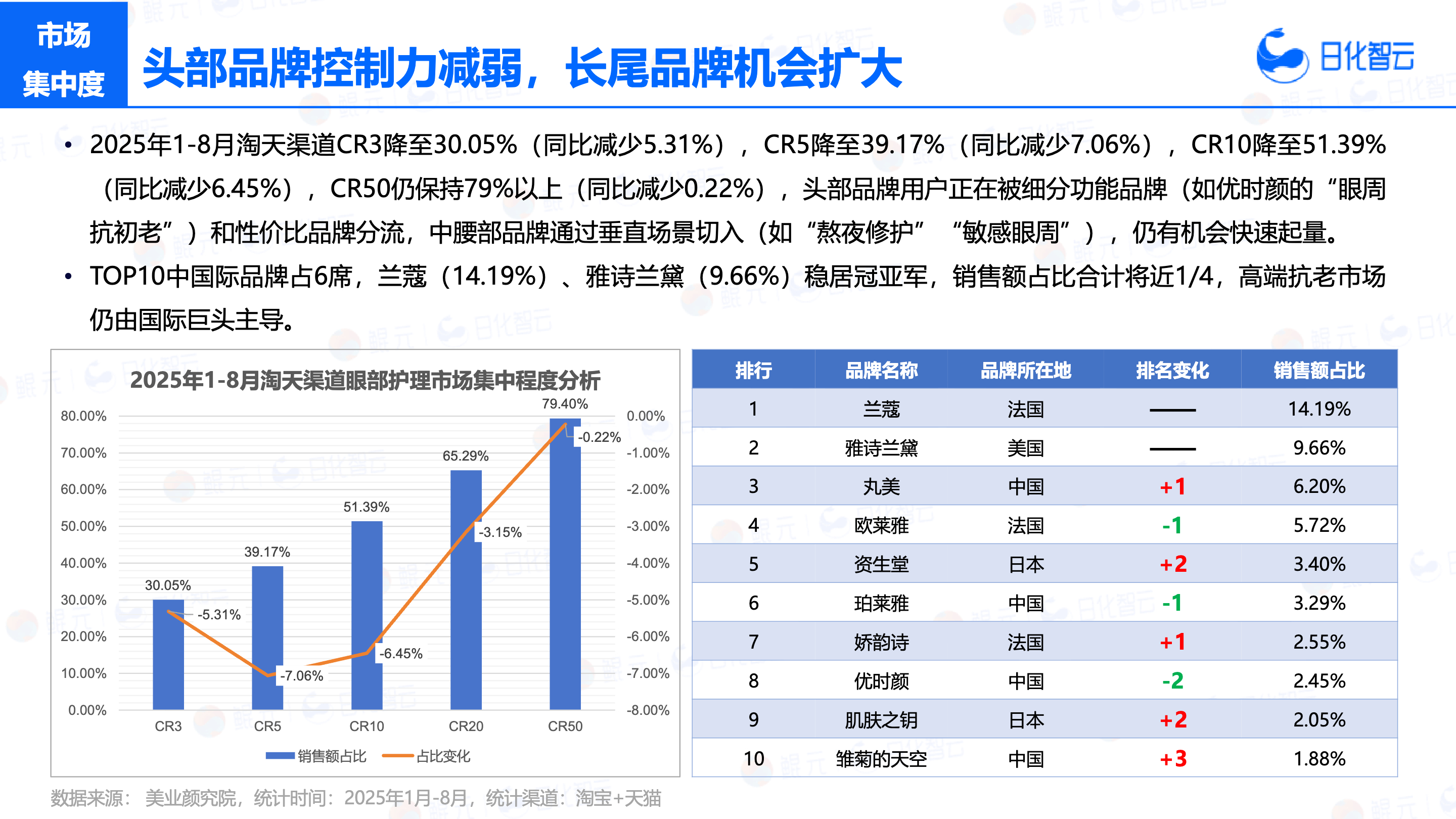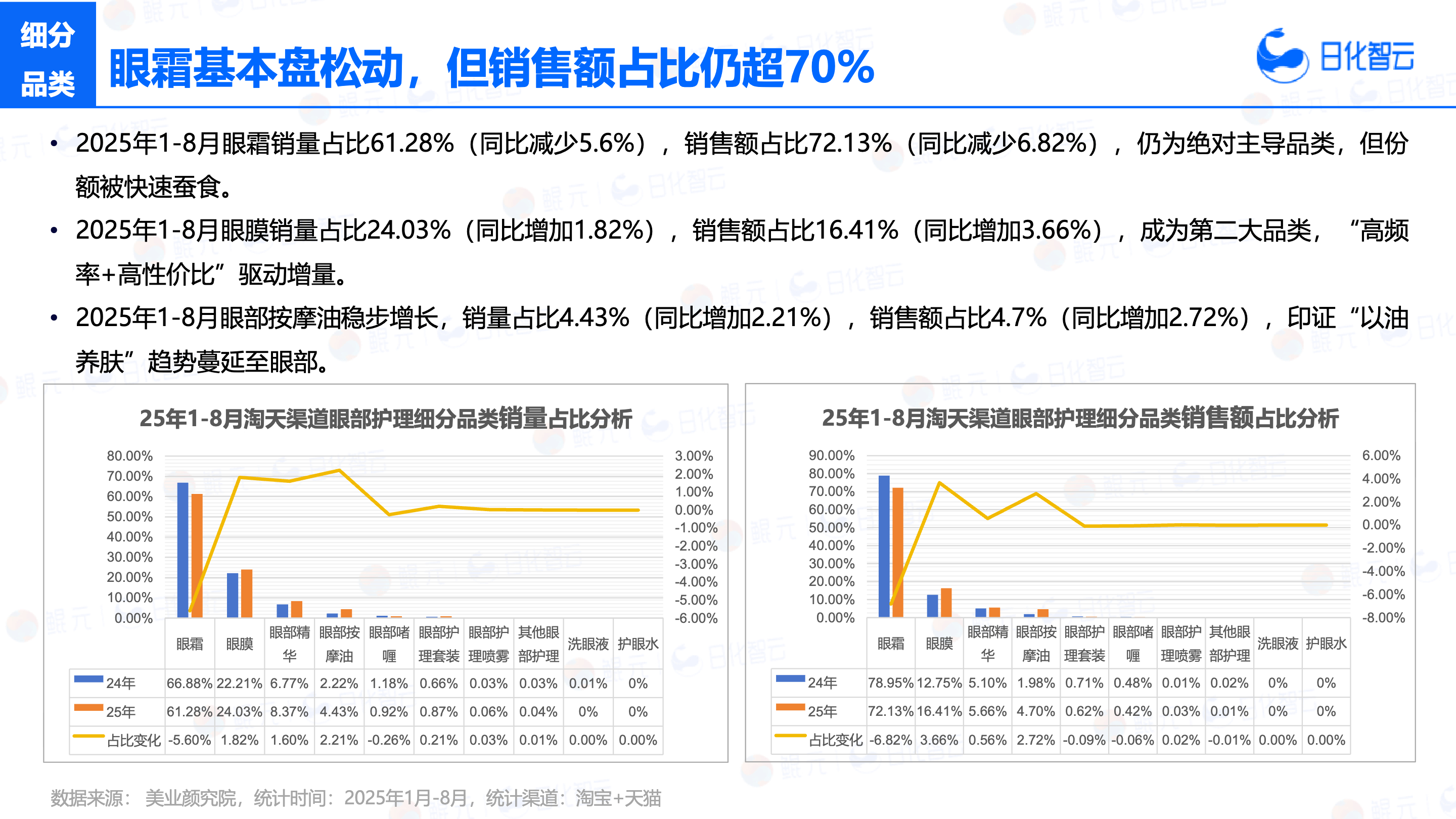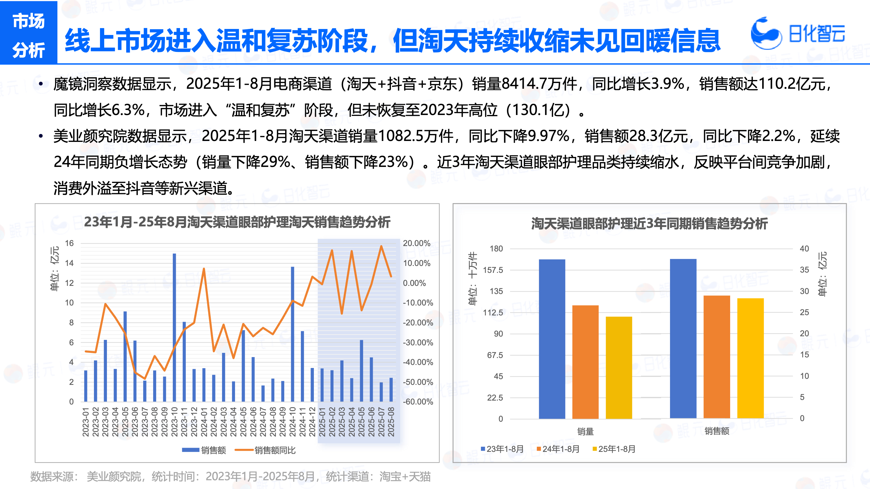 2025年1-8月电商渠道(淘天+抖音+京东)销量8414.7万件,同比增长3.9%,销售额达110.2亿元,同比增长6.3%,市场进入“温和复苏”阶段,但未恢复至2023年高位(130.1亿)。 眼霜眼膜消费现状如何?2025年产品趋势如何?查看完整报告获取更多信息~