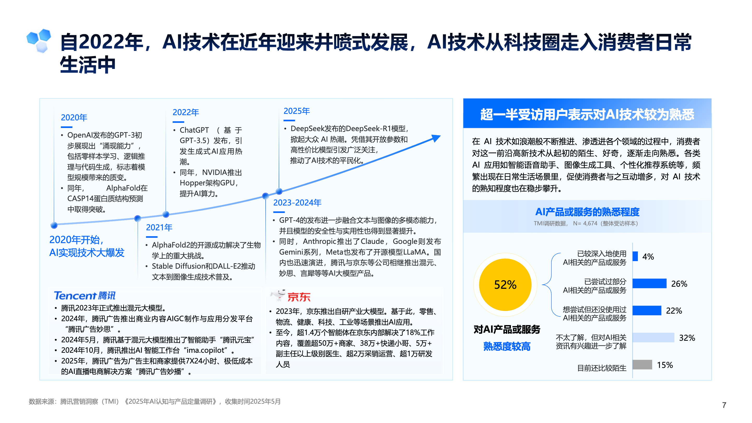 为了帮助中国品牌能够更好把握AI的发展方向,本报告旨在从消费者如何看待当下AI技术的发展、消费者目前如何看待中国品牌结合AI技术,更期待AI技术在哪些品类和服务中应用、解决哪些场景的核心需求等方面出发,给到中国品牌在AI化进程中的一些启示。