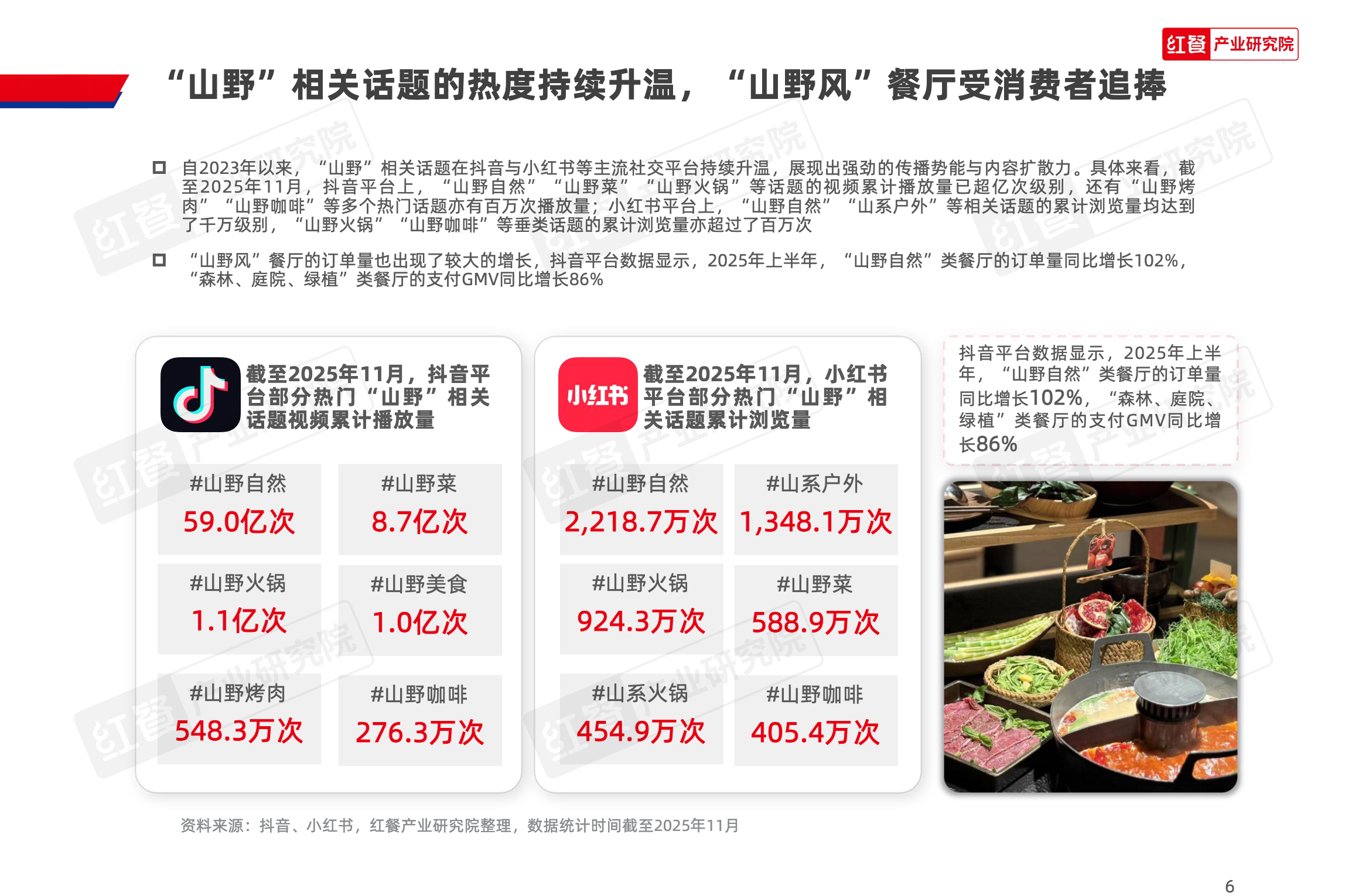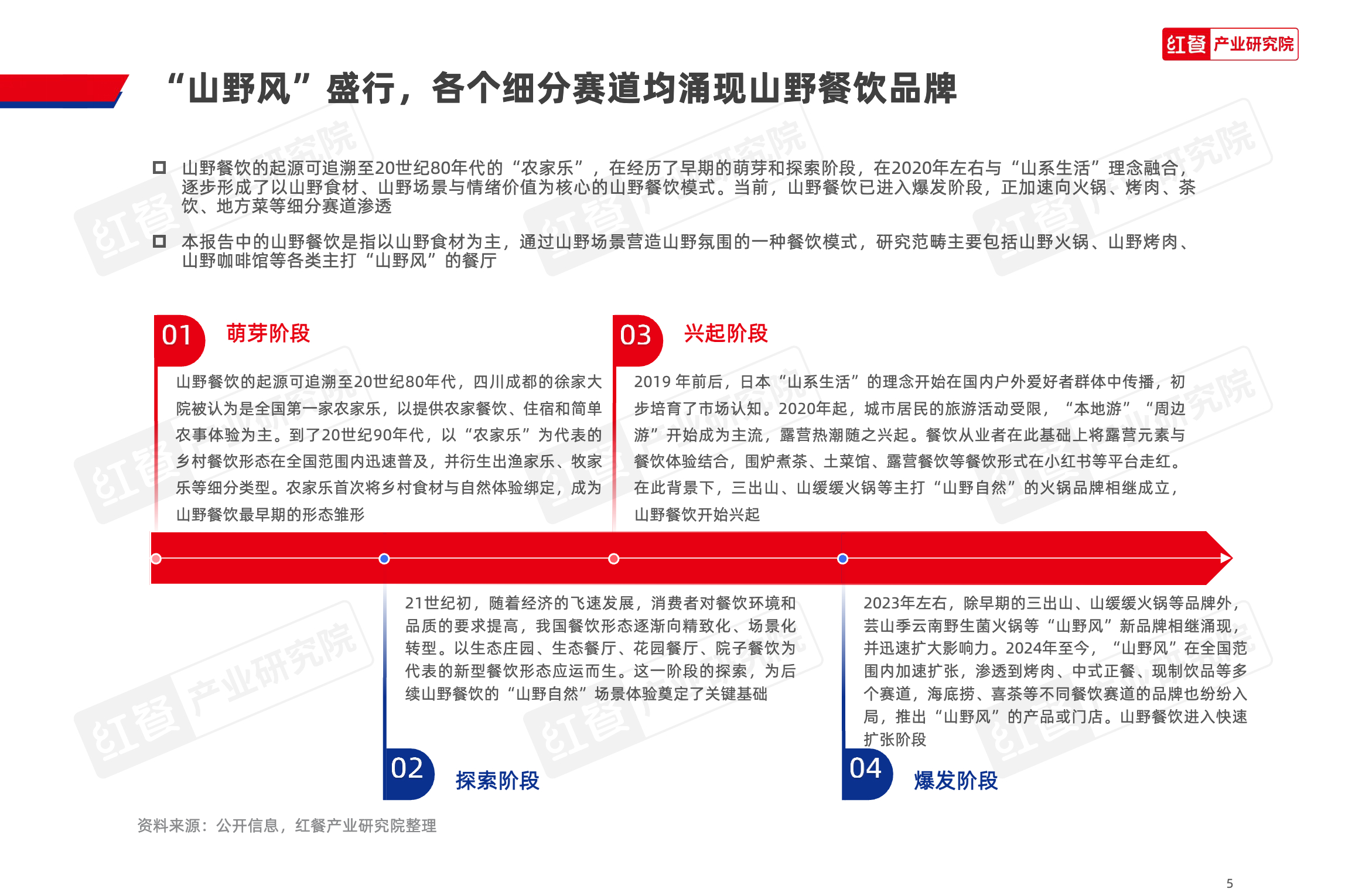 山野餐饮的起源可追溯至20世纪80年代的“农家乐”,在经历了早期的萌芽和探索阶段,在2020年左右与“山系生活”理念融合,逐步形成了以山野食材、山野场景与情绪价值为核心的山野餐饮模式。当前,山野餐饮已进入爆发阶段,正加速向火锅、烤肉、茶饮、地方菜等细分赛道渗透。那么,是入局的时候吗?