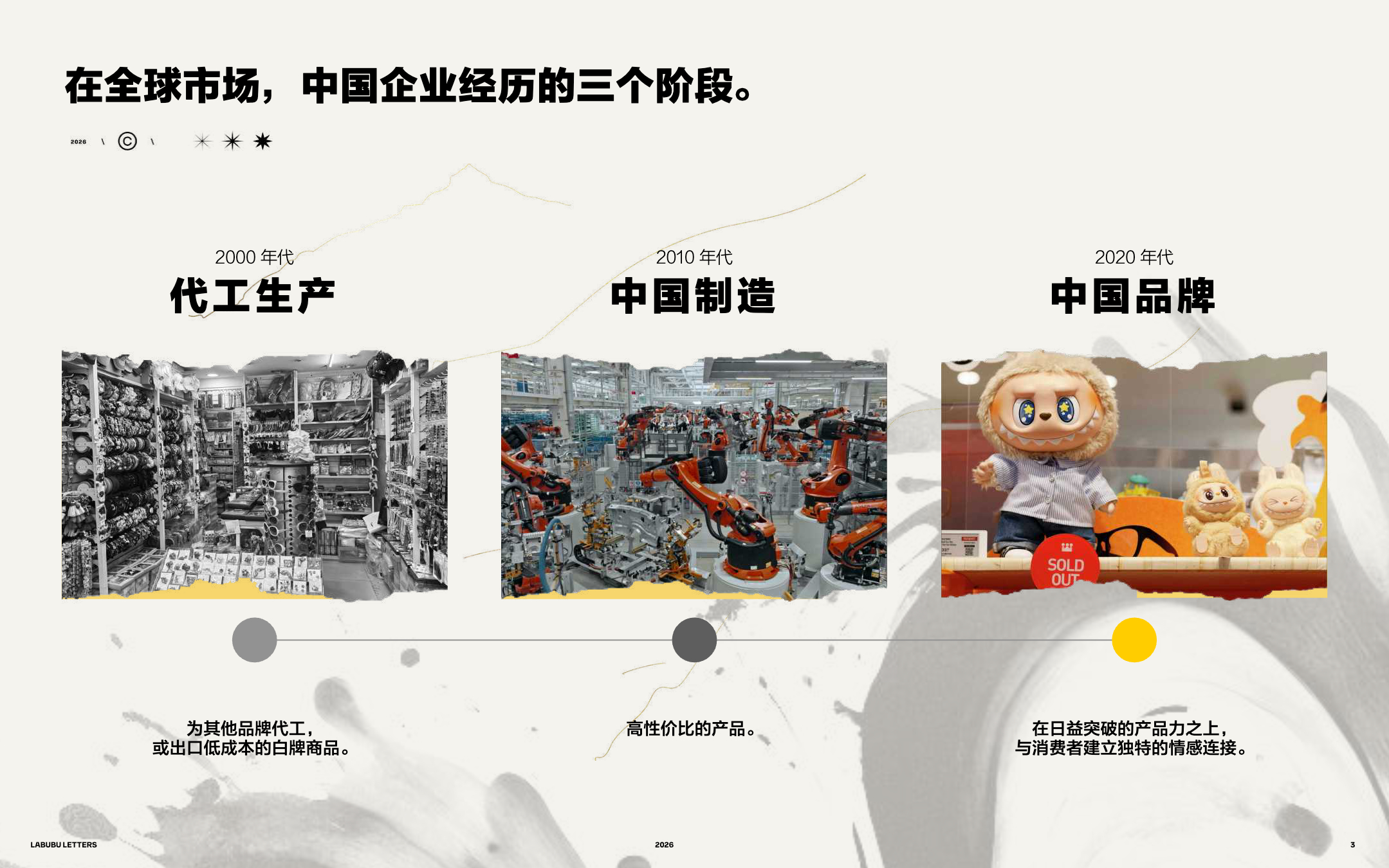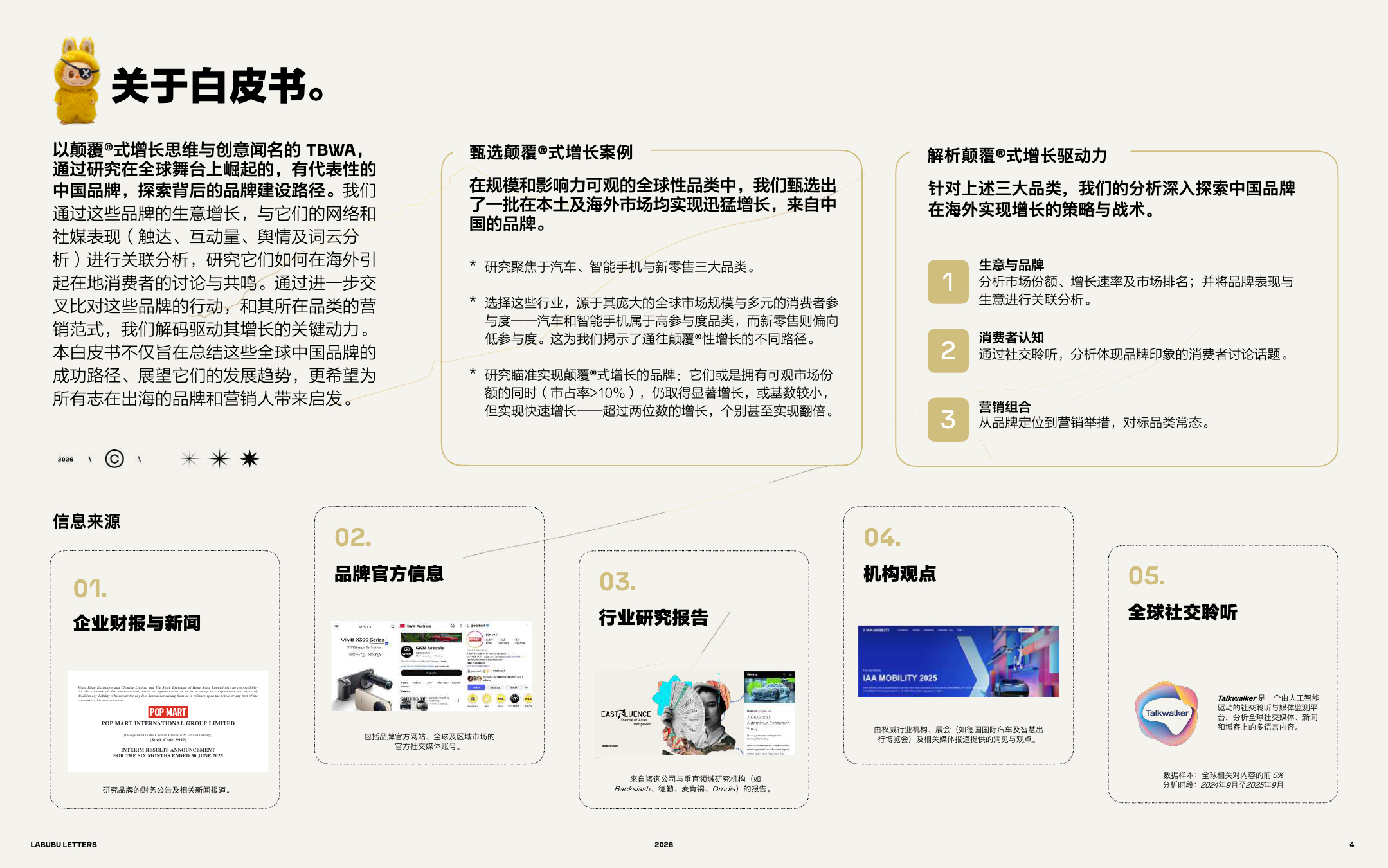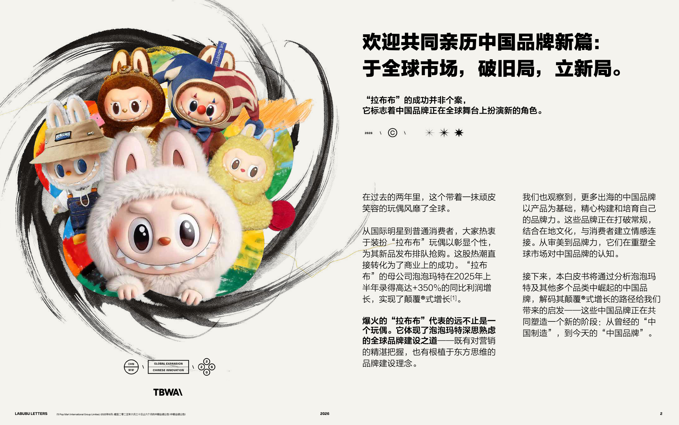 爆火的"拉布布"代表的远不止是一个玩偶。它体现了泡泡玛特深思熟虑的全球品牌建设之道—既有对营销的精湛把握,也有根植于东方思维的品牌建设理念。 本白皮书将通过分析泡泡玛特及其他多个品类中崛起的中国品牌,解码其颠覆式增长的路径给我们带来的启发一这些中国品牌正在共同塑造一个新的阶段:从曾经的"中国制造",到今天的"中国品牌"。