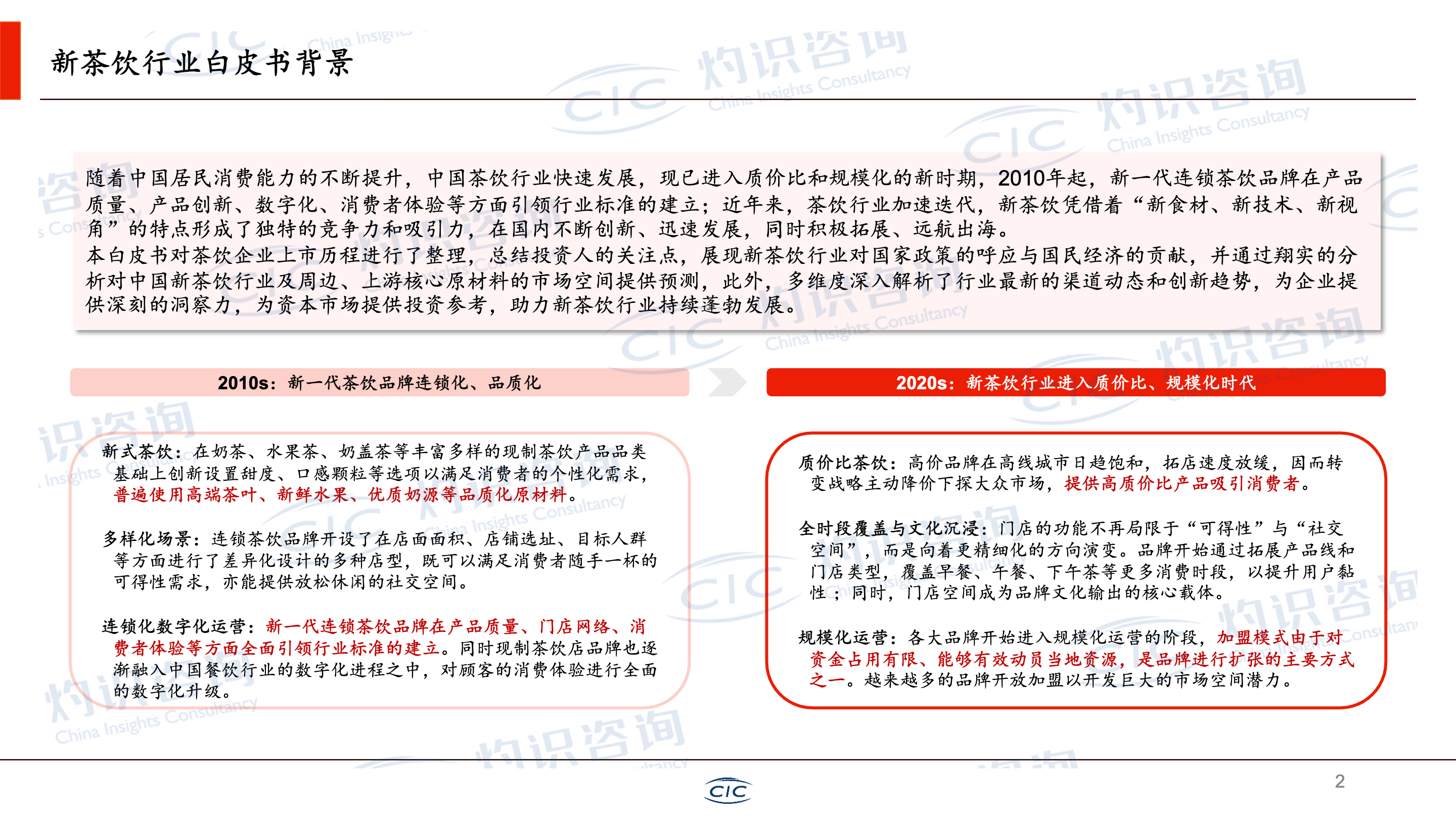 本白皮书对茶饮企业上市历程进行了整理,总结投资人的关注点,展现新茶饮行业对国家政策的呼应与国民经济的贡献,并通过翔实的分析对中国新茶饮行业及周边、上游核心原材料的市场空间提供预测,此外,多维度深入解析了行业最新的渠道动态和创新趋势,为企业提供深刻的洞察力,为资本市场提供投资参考,助力新茶饮行业持续蓬勃发展。
