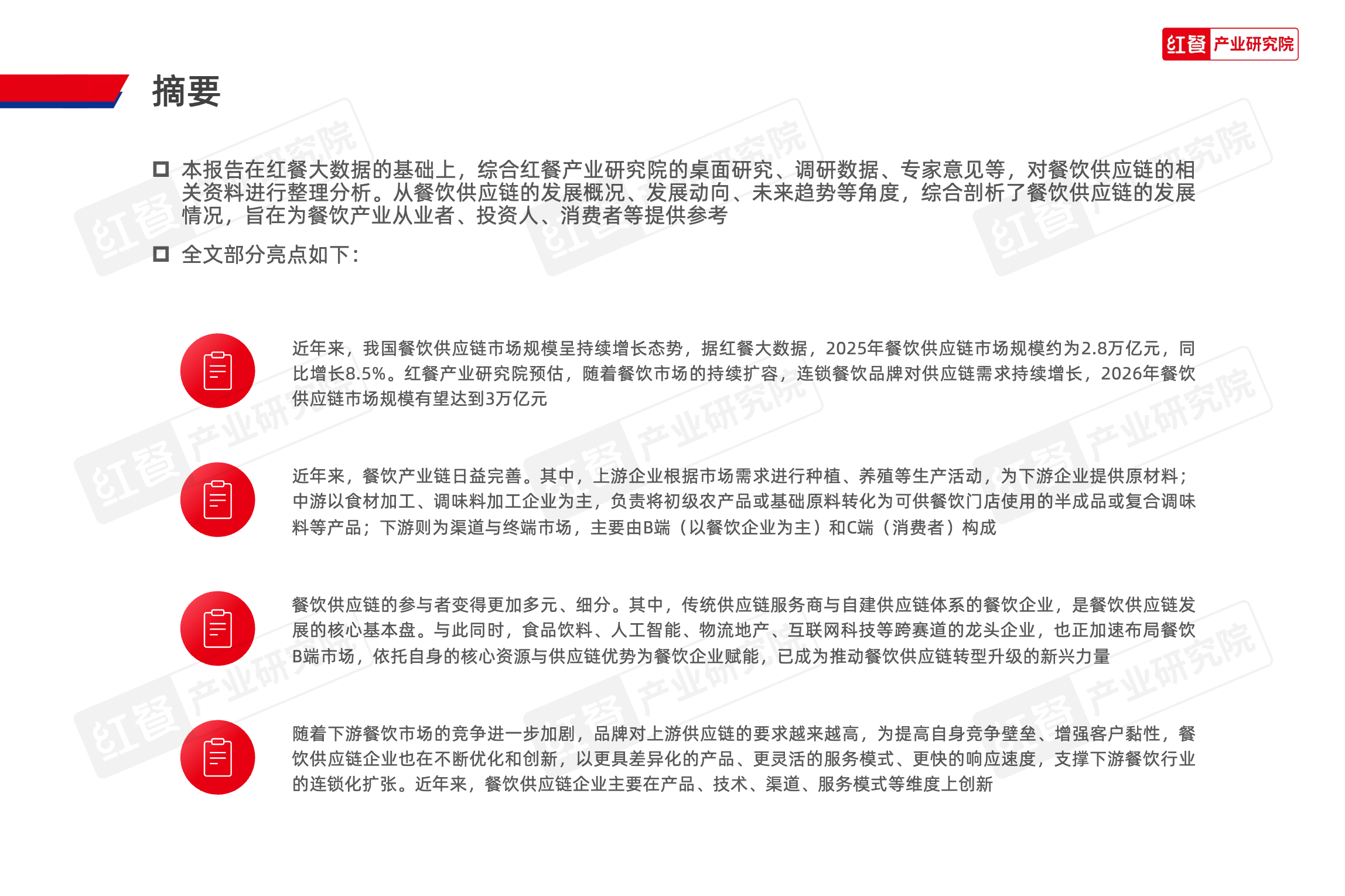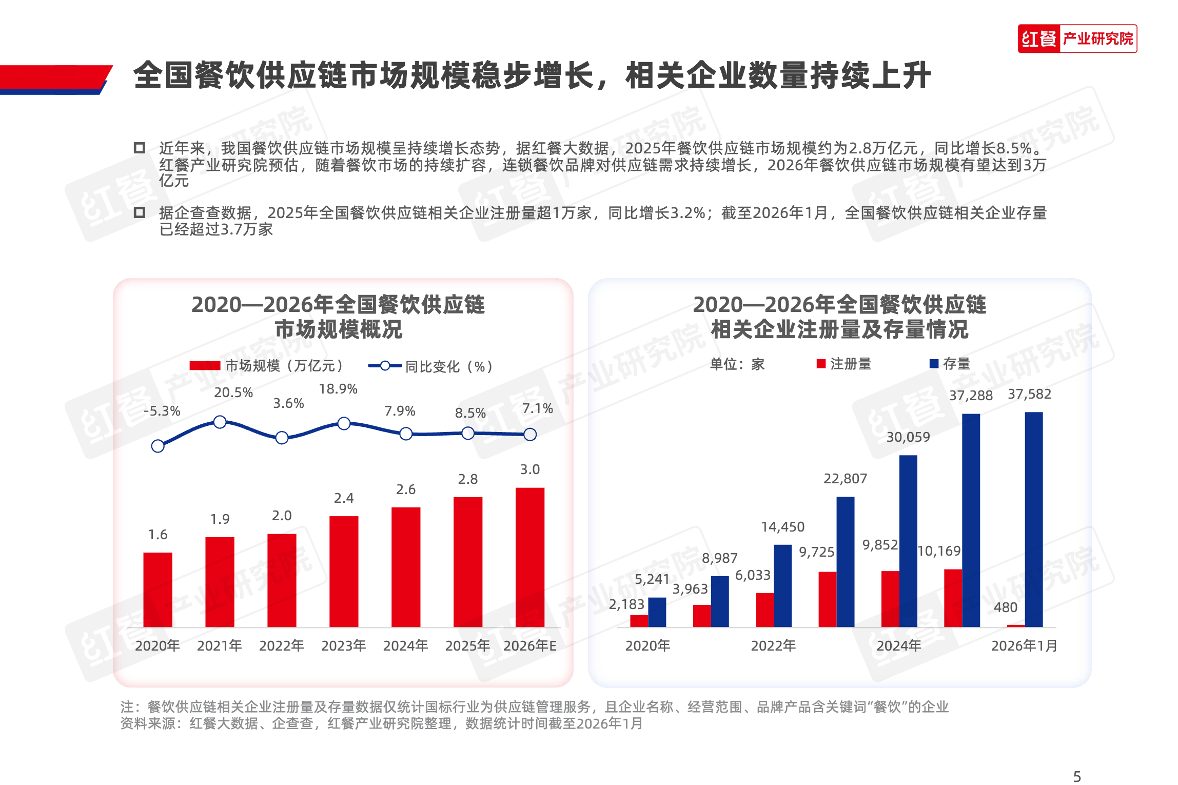 近年来,我国餐饮供应链市场规模呈持续增长态势,随着餐饮市场的持续扩容,连锁餐饮品牌对供应链需求持续增长,2026年餐饮供应链市场规模有望达到3万亿元。更多细节信息,查看完整报告获取~
