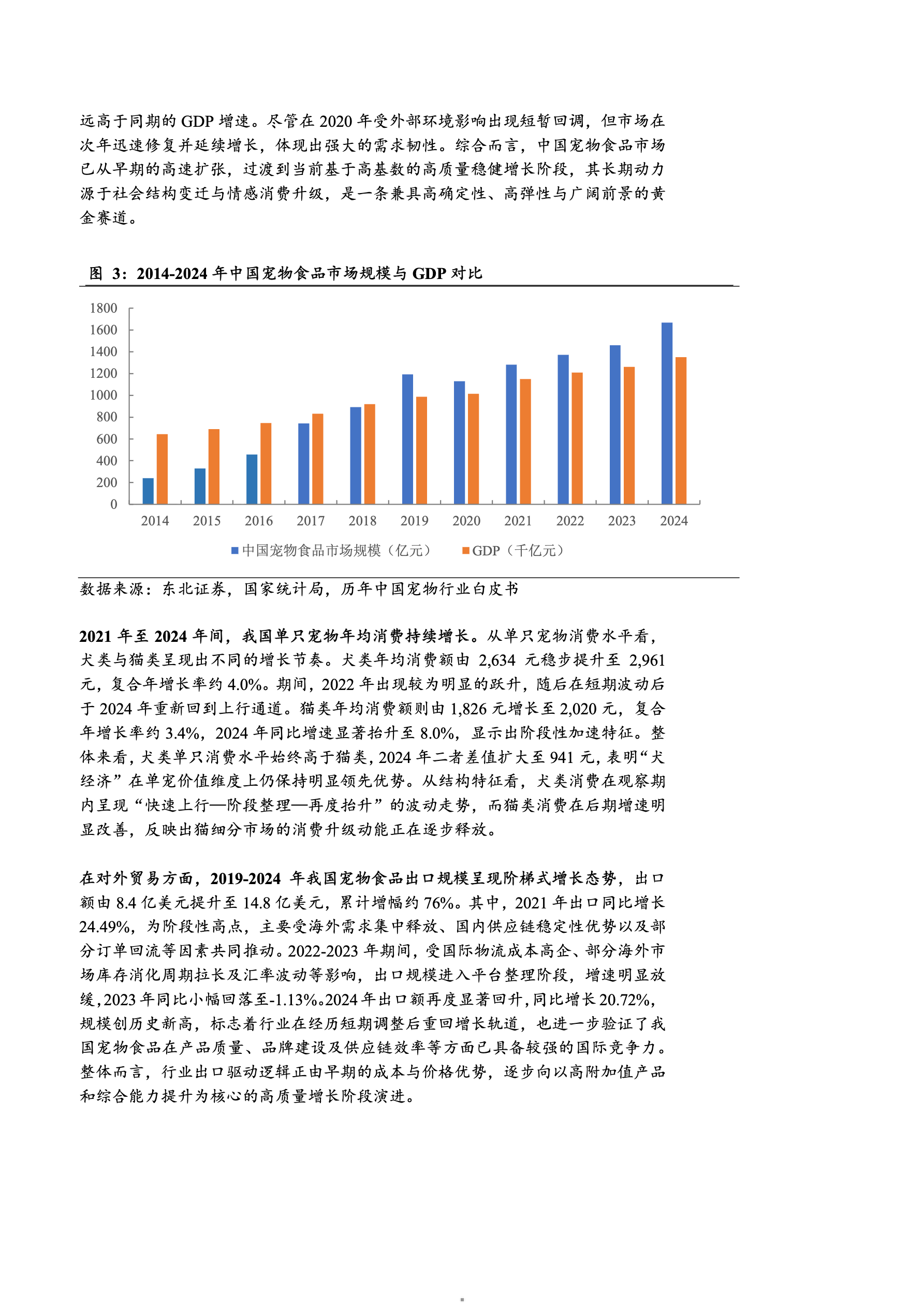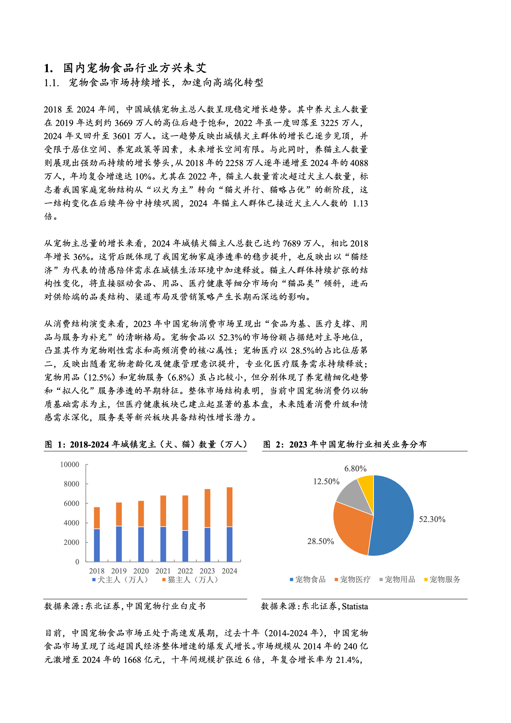 2018 至 2024 年间,中国城镇宠物主总人数呈现稳定增长趋势。与此同时,养猫主人数量 则展现出强劲而持续的增长势头,从 2018 年的 2258 万人逐年递增至 2024 年的 4088 万人,年均复合增速达 10%。 2023 年中国宠物消费市场呈现出“食品为基、医疗支撑、用品与服务为补充”的清晰格局。更多产品细节相关内容及趋势分析,查看完整报告获取~