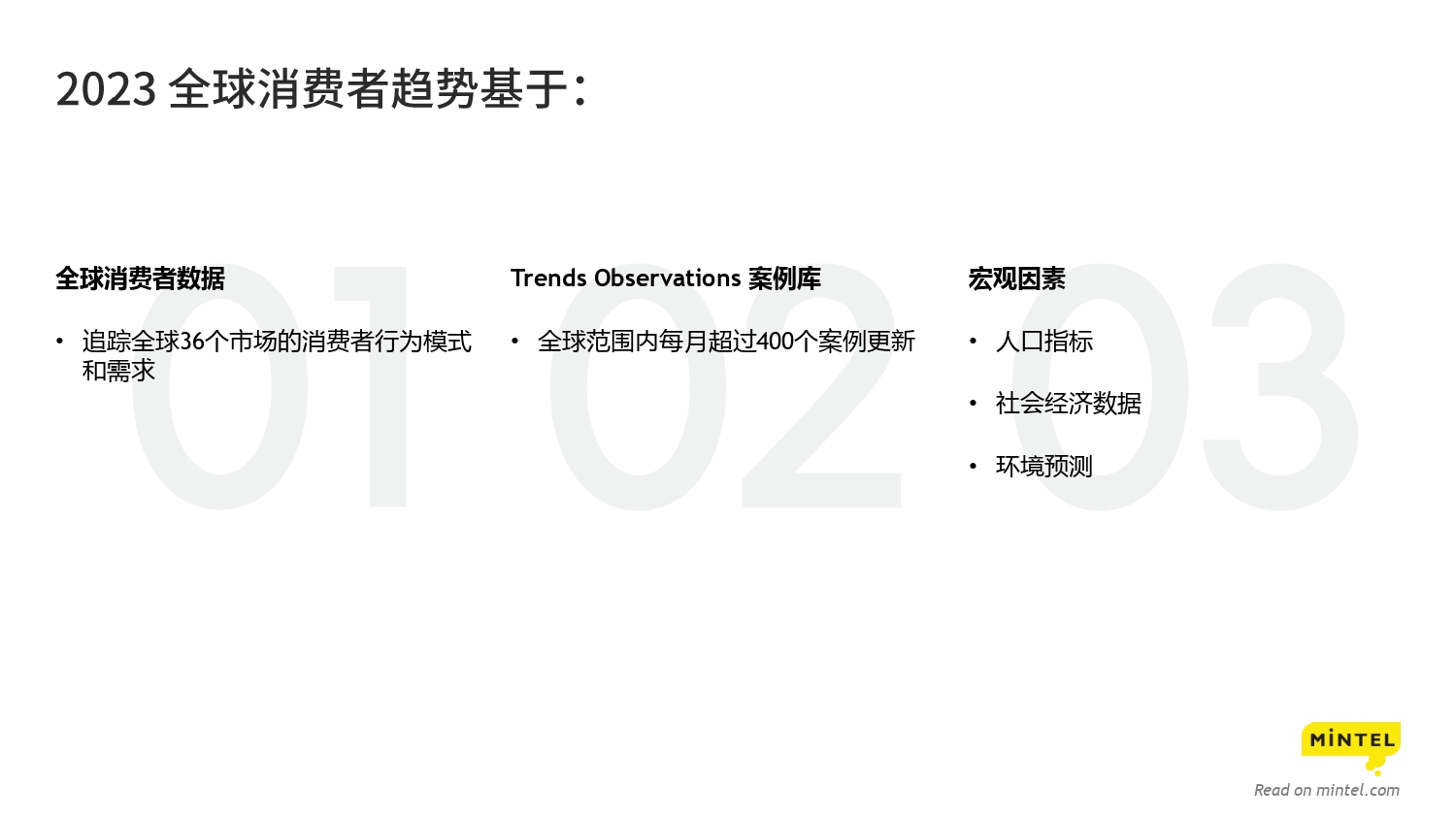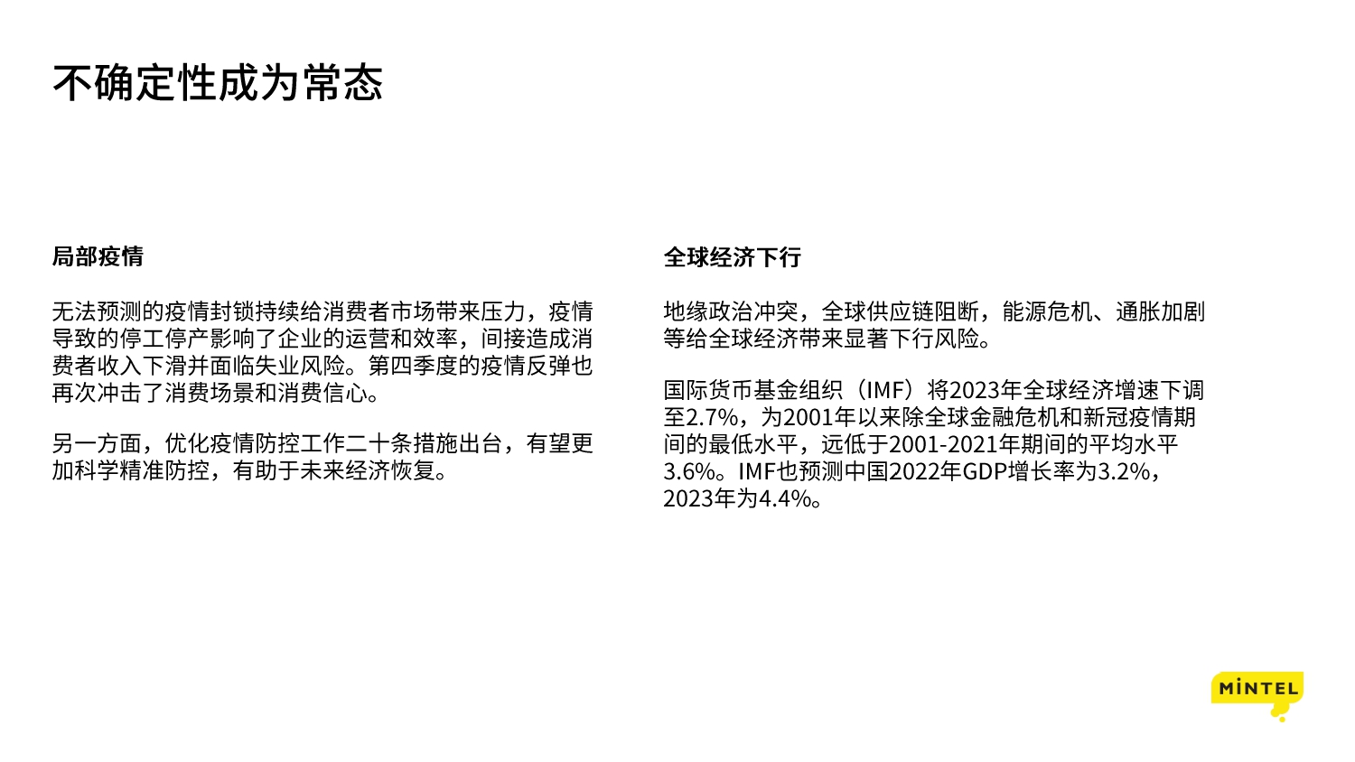 2023年全球消费者趋势: 1.审慎消费 消费者正在更有意识地衡量消费抉择,审慎支出。灵活性、耐用性和持久性等将成为重要的购买因素。 2.松弛生活 消费者希望脱离倦怠感,投入对自己真正重要的事,建立有质量的生活体验。 3.全球本土化 支持本士购买成为消费者在经济、环境和心理层面上保护自己的方式之一,也让他们感觉到自己正在为回馈社会而努力。 4.自我探寻 后疫情时代,消费者渴望重新关注自身,品牌可以帮助他们探寻新的个性身份。 5.消费者共创 消费者正在从品牌的被动接受者转变为品牌决策管理中的主动参与者。消费者参与共创、投资和变革将助力品牌向前。 中国商家在此趋势下,该如何抓住机遇积极应对呢?查看完整报告获取更多灵感~