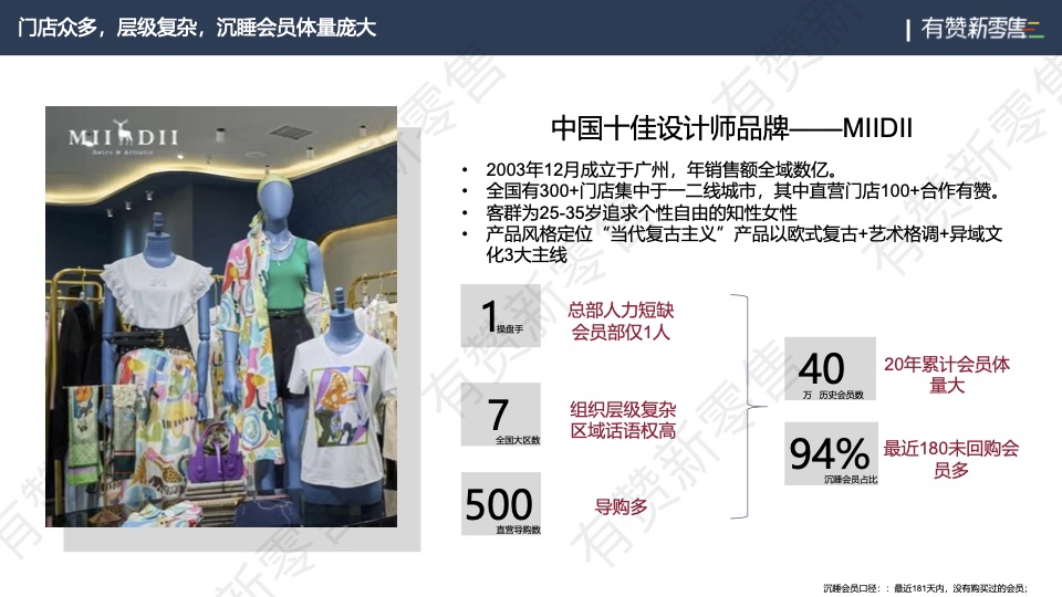 商家在活动的实际执行中,往往会遇到很多问题: 1. 营销玩法单一,门店门口的海报只能宣传满减和折扣; 2. 营销数据无法分析,很难判断活动的有效性; 3. 缺少工具管理导购,导购做与不做,没办法有效追踪与激励。 针对这些问题,「MIIDII 谜底」的实战经验给出了答案。 作为成立于 2003 年的中国独立设计师品牌,谜底同样备受门店流量的困扰。自 20221年携手有赞新零售以来,谜底组织上下同心,把关注点放在老客身上,希望通过更丰富的会员权益和门店活动,唤醒触达沉睡会员,获得最大收益。 谜底的沉睡会员激活战法无保留公开!更多案例细节,可查看完整资料获取~