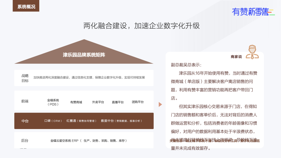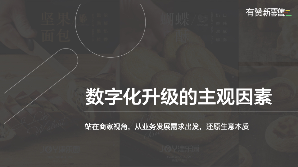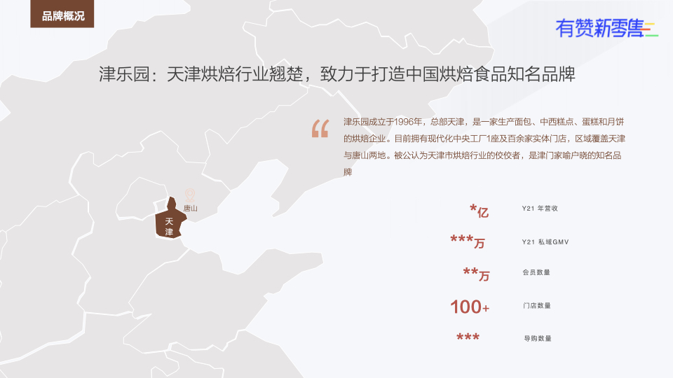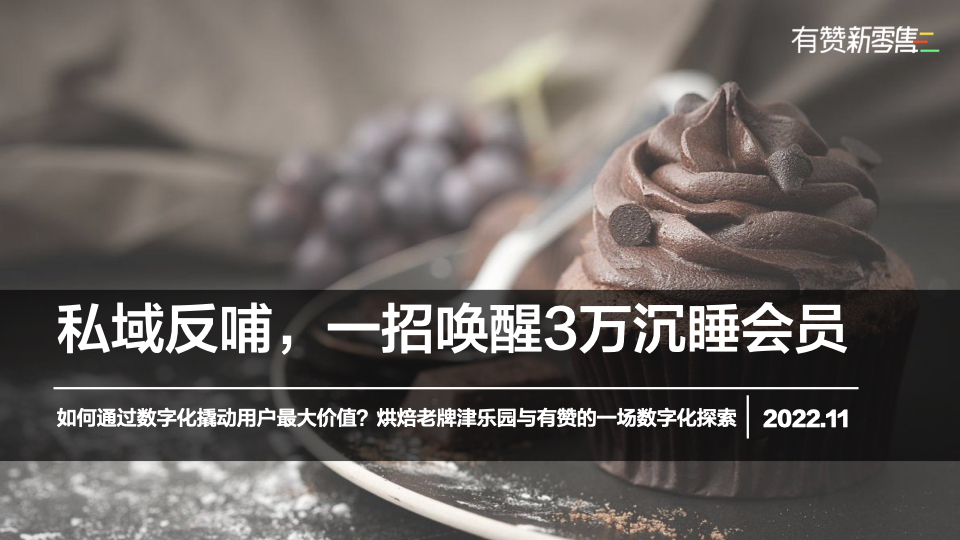 津乐园成立于 1996 年,总部位于天津,是一家生产面包、中西糕点、蛋糕和月饼的烘焙企业,在烘焙行业有口皆碑。 早在 2016 年,津乐园就开始使用有赞,开启线上经营,但核心交易依然发生在门店。受困于没有一体化的数字系统,津乐园缺少对门店客群的运营和分析,用户数据处于半浪费的状态,线下流量无法完成有效留存。 自 2022 年携手有赞新零售以来,津乐园正在逐步通过数字化,来撬动用户的最大价值,取得了一招激活 3 万沉睡会员、半月内锁定百万储值金等亮眼的成绩。 津乐园的每一步成功是如何实现的?其他商家有机会复制吗?更多案例细节可查看完整资料获取~