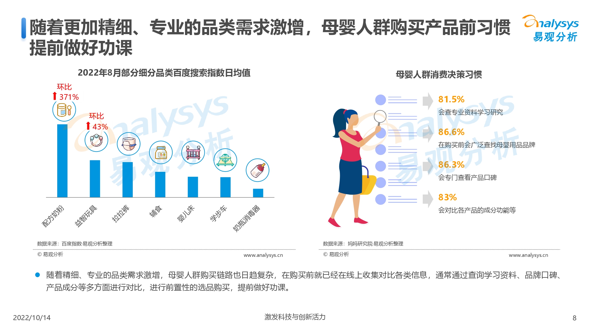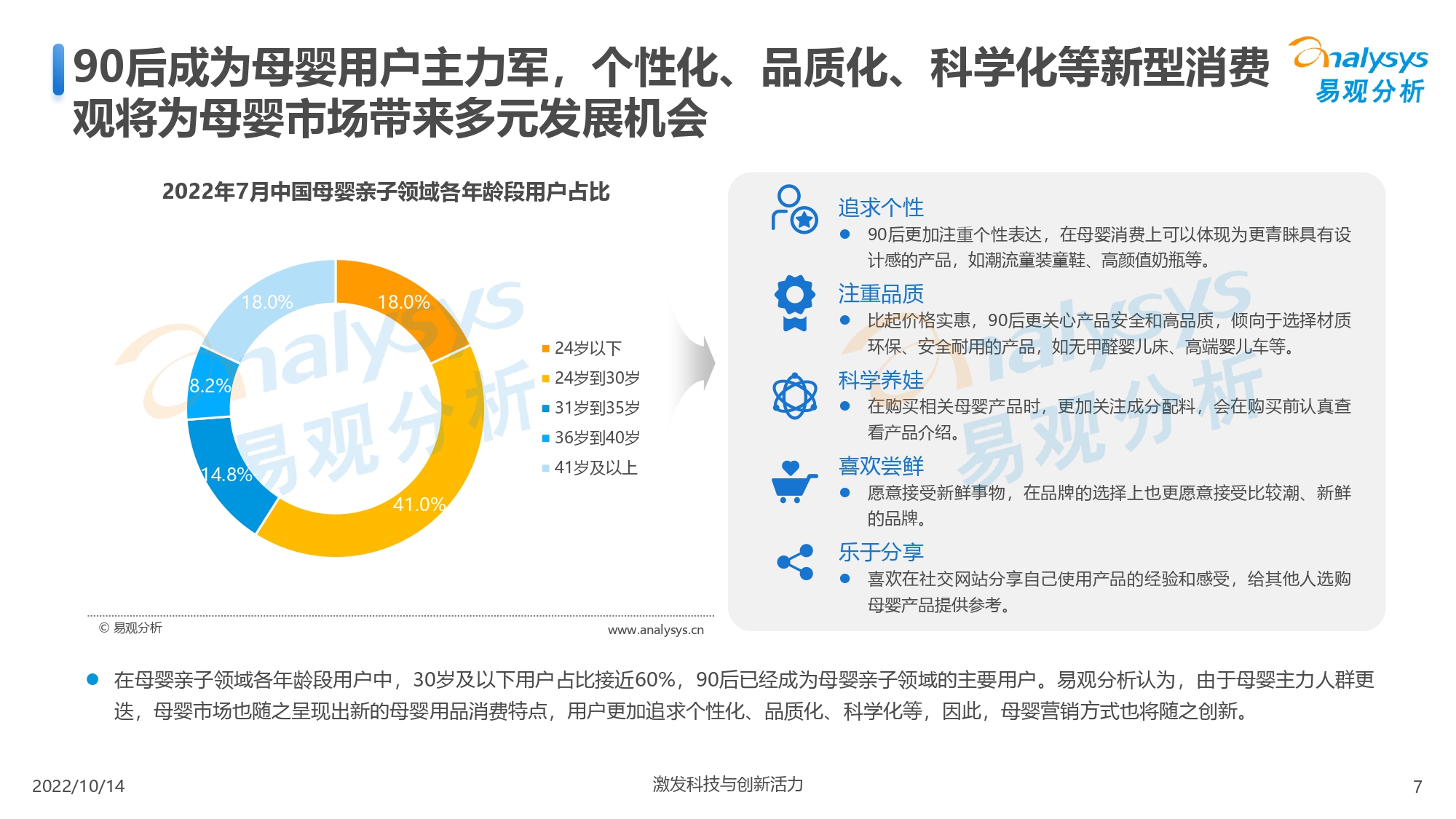 随着生育鼓励政策的推进,新生二孩占比维持高位,推动母婴行业规模持续增长。 下沉市场借人口出生红利,母婴消费呈现购买高频、份额增长的态势,成为母婴市场新增量。 目前,母婴市场线下仍是核心购买渠道,不过线上渠道消费增速更具优势。 90后成为母婴用户主力军,个性化、品质化、科学化等新型消费观将为母婴市场带来多元发展机会。 随着更加精细、专业的品类需求激增,母婴人群购买产品前习惯提前做好功课,专业靠谱成为重要诉求。 更多细节内容可查看完整报告获取~
