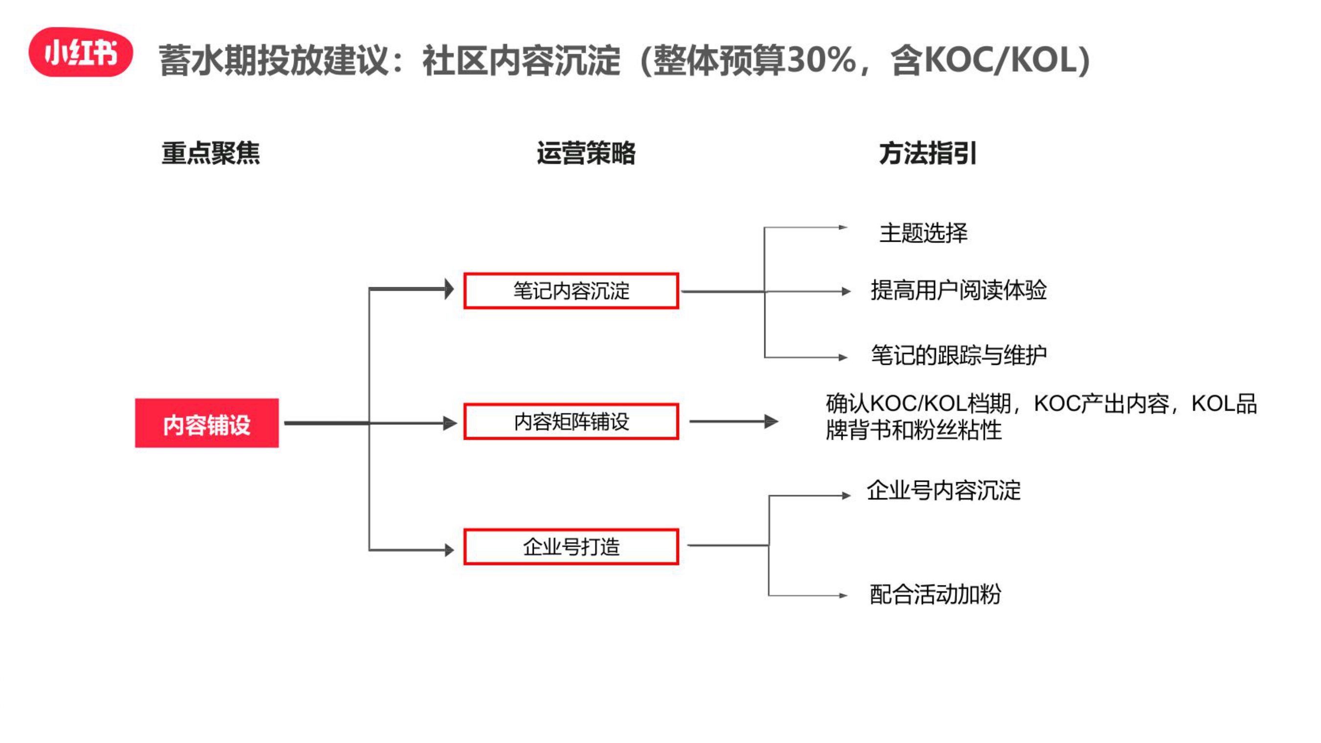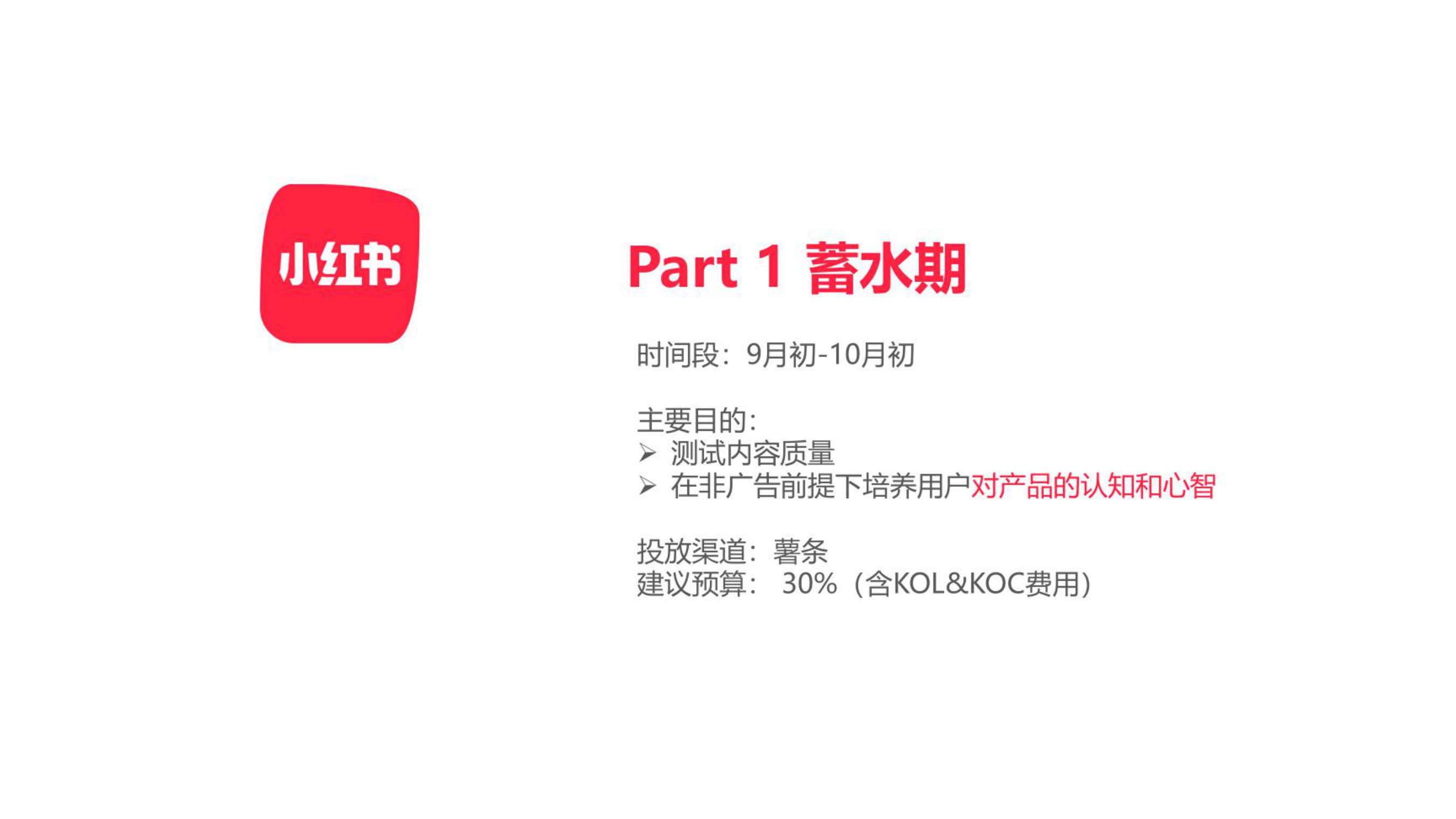 不止双十一,在小红书的投放攻略都可以参考以下时间轴: 1.蓄水期:测试内容质量并做好社区内容沉淀;在非广告前提下培养用户对产品的认知和心智(30%预算); 2.冲刺期:前期-通过投放笔记种草带动全网加购;后期-通过商品销量冲刺站内预售,落袋为安(35%预算); 3.拔草期:借助关键词拓展、人群包扩展、出价提升等手段抓取高转化期的流量(30%预算); 4.返场期:中小商家争取前期没能竞价到的核心关键词流量(5%预算); 具体时间如何分配?通过什么渠道进行投放?有哪些可以借鉴的案例?更多细节可下载完整报告获得~
