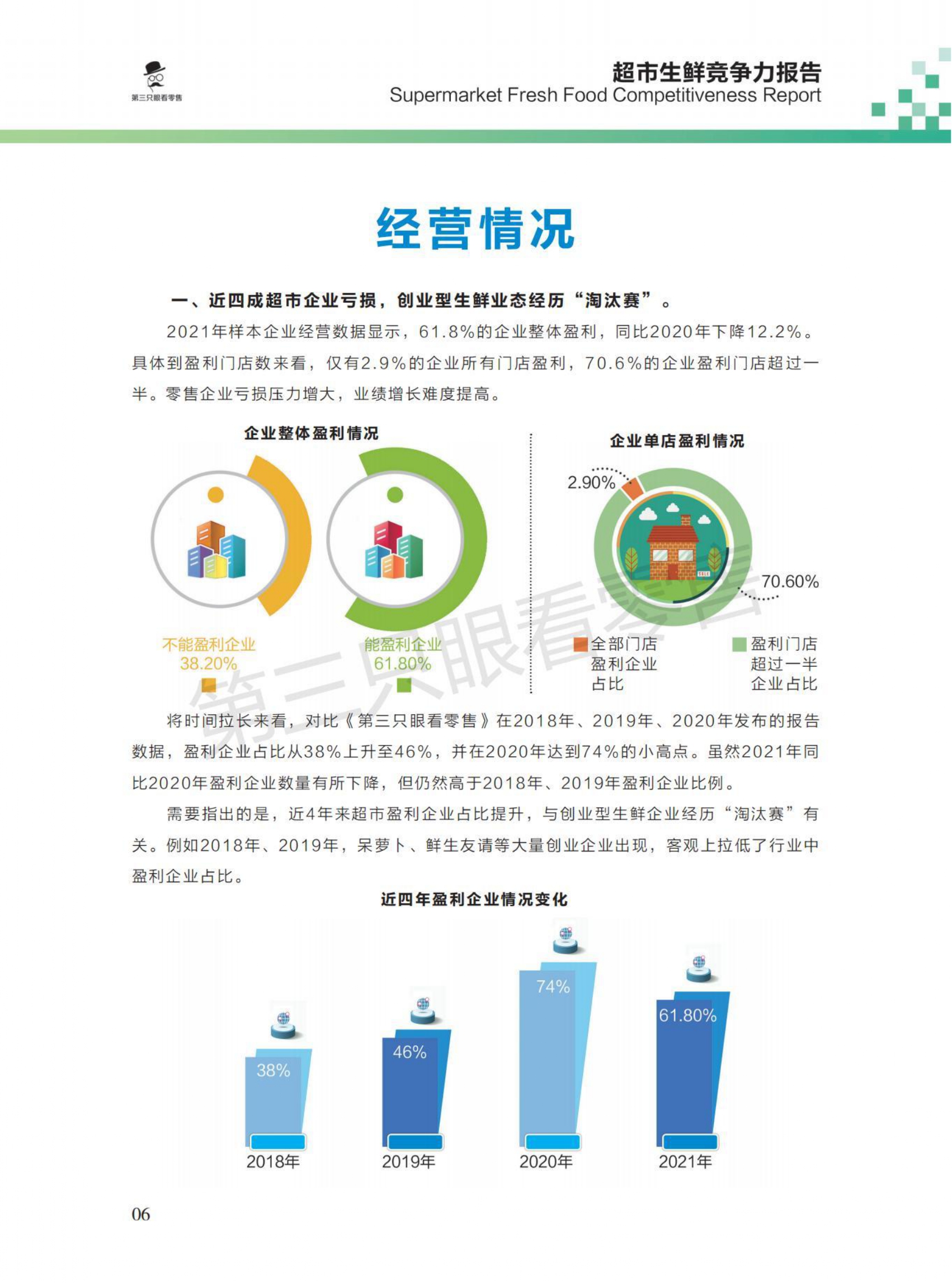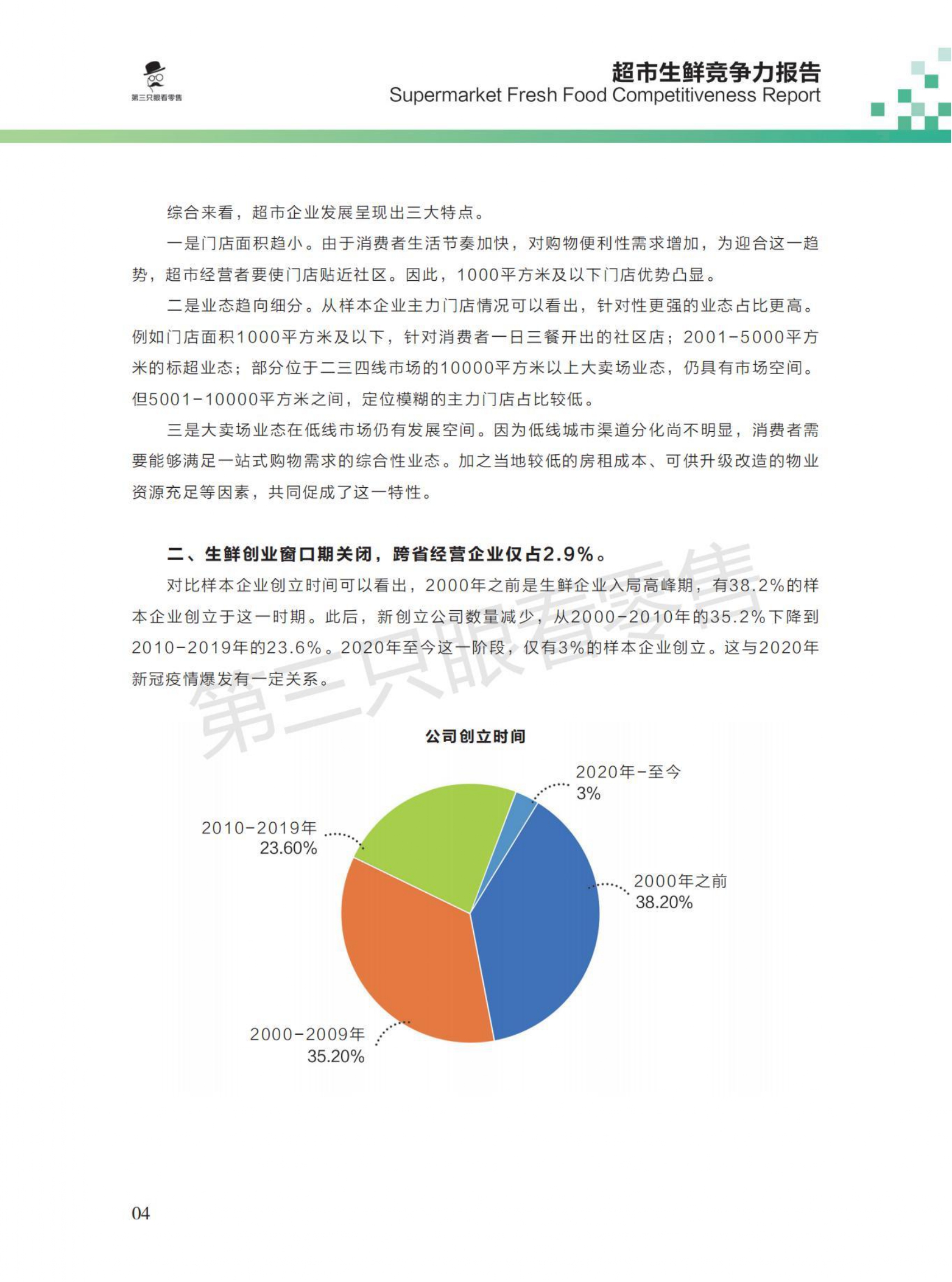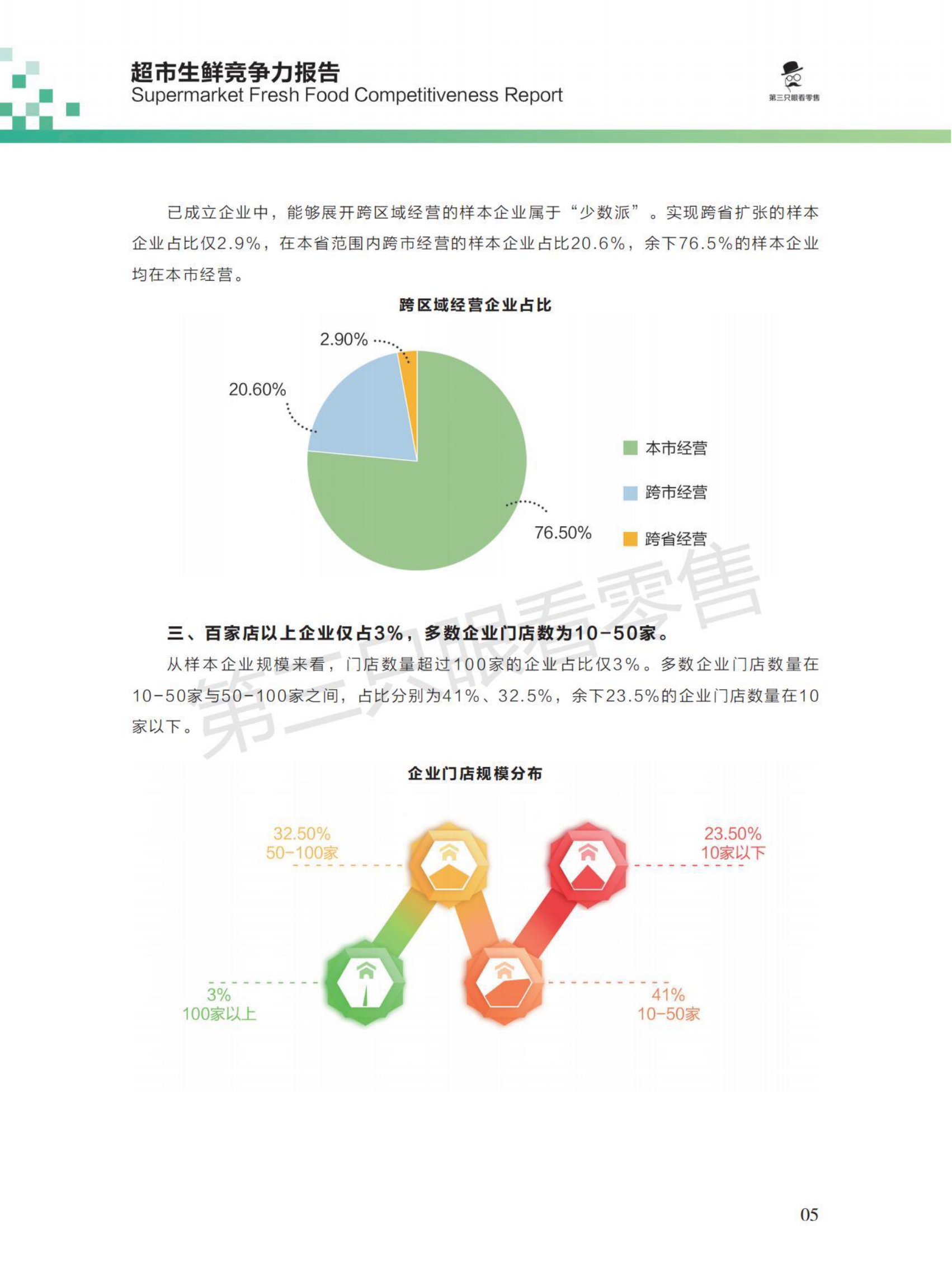 本报告统计分析了全国范围内50余家超市企业经营数据,我们发现,虽然近四成样本企业整体亏损,75.8%的样本企业营收下降,但生鲜销售占比超过60%的样本企业,销售额、来客数、综合毛利率均实现增长。零售企业经营者看好的增长品类,也主要集中在果蔬、加工日配、肉品、水产等生鲜品类中。 进一步梳理超市企业经营概况,我们发现行业变化明显,涉及生鲜业态赛道冷暖、企业营收毛利增减、超市经营策略调整、门店成本浮动、组织架构与团队建设、增长方向预判以及零售商心态多个层面。 这些变化正在影响实体零售业发展。行业增长受阻,也使零售行业人员流动率提高,人才问题凸显。零售企业普遍面临经营团队学历偏低、年龄偏大的问题。其中管理层学历以高中及以下文凭为主的企业占比达28.11%;管理层平均年龄小于35岁的企业占比2.95%;门店员工平均年龄小于35岁的企业占比仅为11.76%。 因此本报告通过七个板块,分别是企业画