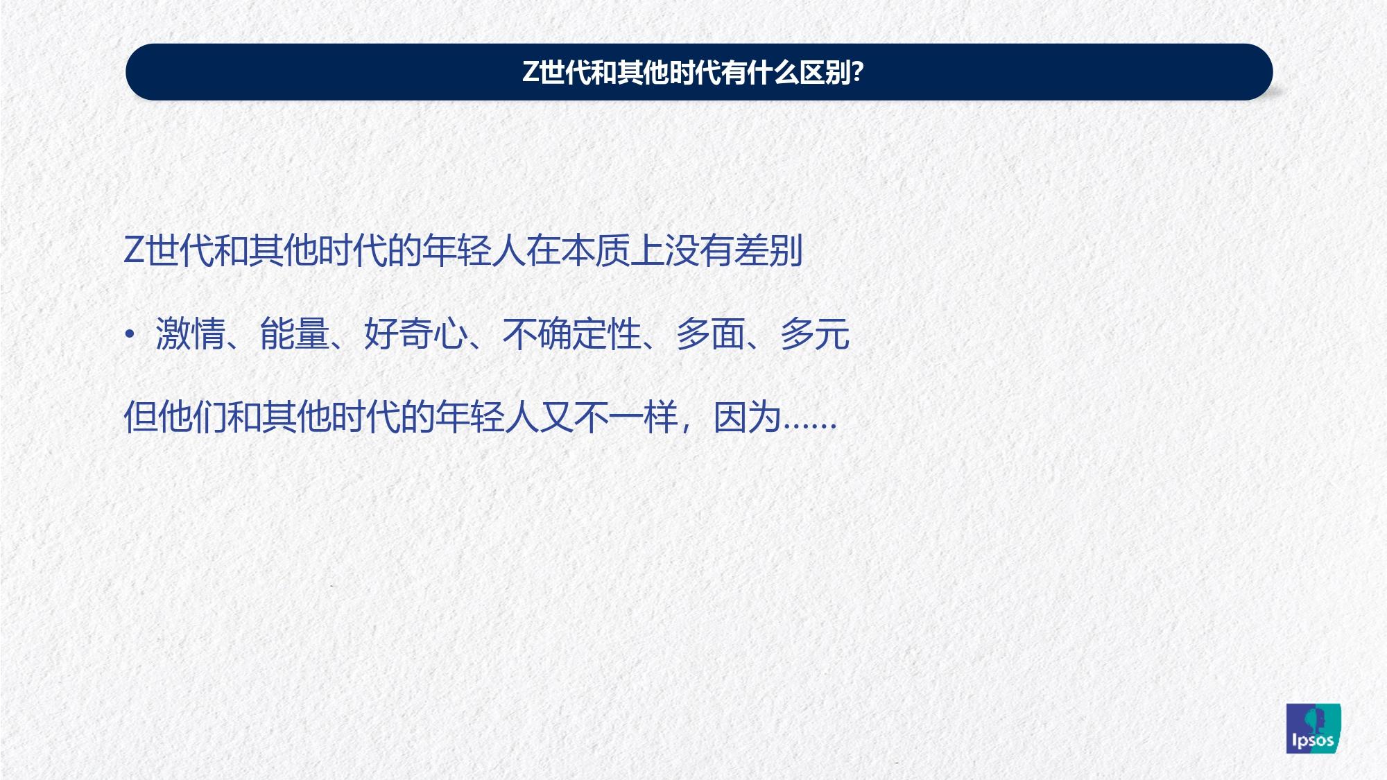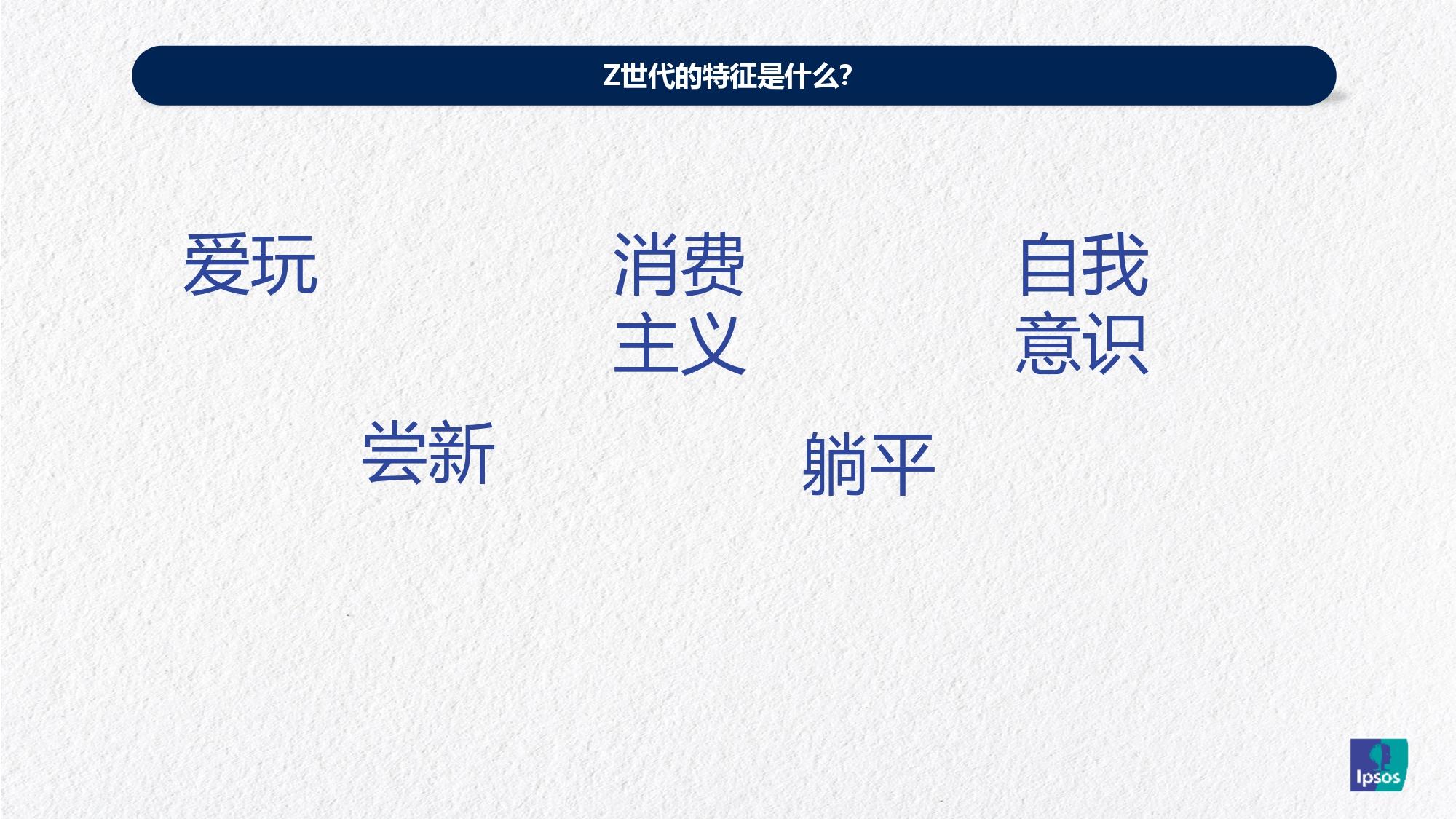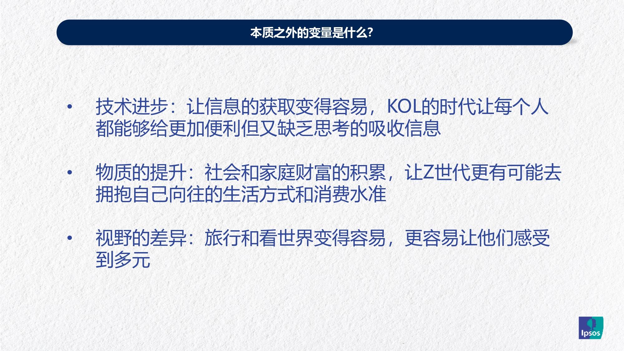 Z世代和其他时代的年轻人在本质上没有差别,激情、能量、好奇心、不确定性、多面、多元但他们和其他时代的年轻人又不一样,因为…… 1.技术进步:让信息的获取变得容易,KOL的时代让每个人都能够给更加便利但又缺乏思考的吸收信息; 2.物质的提升:社会和家庭财富的积累,让Z世代更有可能去拥抱自己向往的生活方式和消费水准; 3.视野的差异:旅行和看世界变得容易,更容易让他们感受到多元; 他们见多识广,可支配收入更多,也更舍得花钱;他们是“精致懒”的一代,能用钱买到的品质生活,尽量不动手;他们在海量信息包围的互联网时代成长起来;价值观各异, 自我意识强,关注并表达独一无二的自己;他们是个性前卫的, 对时尚品味的感知力 强,对新事物的接受 度高,热爱挑战,敢于驾驭不同风格的一代人......