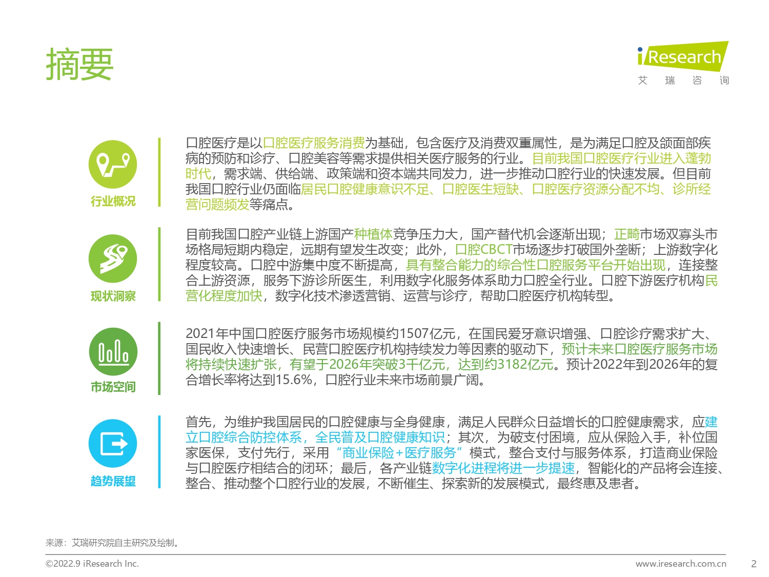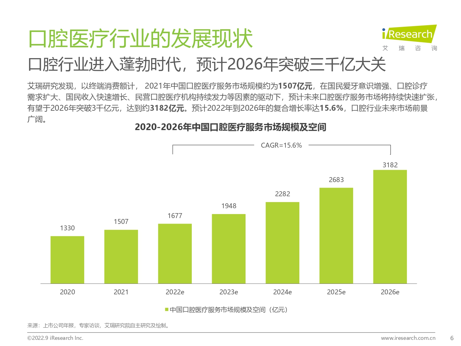 口腔医疗是以口腔医疗服务消费为基础,包含医疗及消费双重属性,是为满足口腔及颌面部疾病的预防和诊疗、口腔美容等需求提供相关医疗服务的行业。 目前我国口腔医疗行业进入蓬勃时代,需求端、供给端、政策端和资本端共同发力,进一步推动口腔行业的快速发展。但目前我国口腔行业仍面临居民口腔健康意识不足、口腔医生短缺、口腔医疗资源分配不均、诊所经营问题频发等痛点。 2021年中国口腔医疗服务市场规模约1507亿元,在国民爱牙意识增强、口腔诊疗需求扩大、国民收入快速增长、民营口腔医疗机构持续发力等因素的驱动下,预计未来口腔医疗服务市场将持续快速扩张,有望于2026年突破3千亿元,达到约3182亿元。 预计2022年到2026年的复合增长率将达到15.6%,口腔行业未来市场前景广阔。 相关行业的商家该如何抓住机遇?可查看完整报告获取~