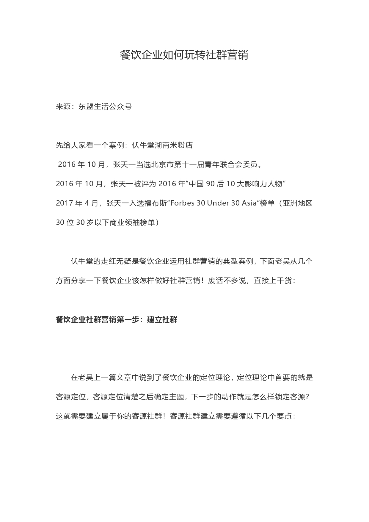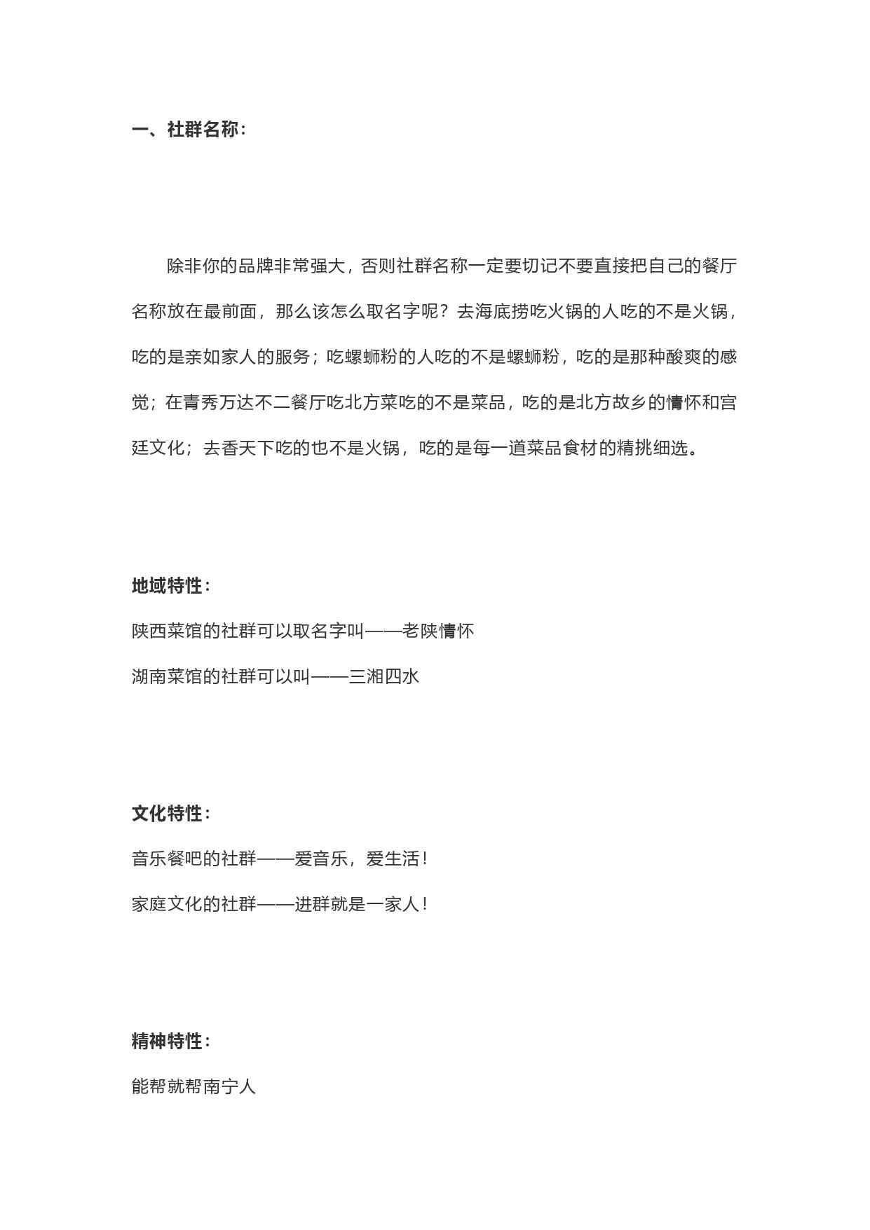 如今,80 后 90 后群体成为了餐饮消费的中坚力量,而这部分年轻人消费理念更加偏向于参与和交互性,那社群运营正好是这样一种能满足年轻人的方 式。 通过社群将这部分年轻的忠实的消费者进行聚拢,从而能够为商家在品牌传播和举办活动时带来巨大价值。 不管是大品牌还是小品牌,社群营销都非常重要,营销的核心是你要找到自己的客户,然后去锁定他。 社群营销就是找到客户并锁定客户的方法,这也是一场看不见硝烟的战争,谁早日行动提前锁定了客户,谁就会在竞争中占据先机。不行动的人会逐步发现自己的客户慢慢消失了,不是客户不见了,而是客户已经提前被人锁定。 更多细节的方法论,可查看完整干货内容获取~