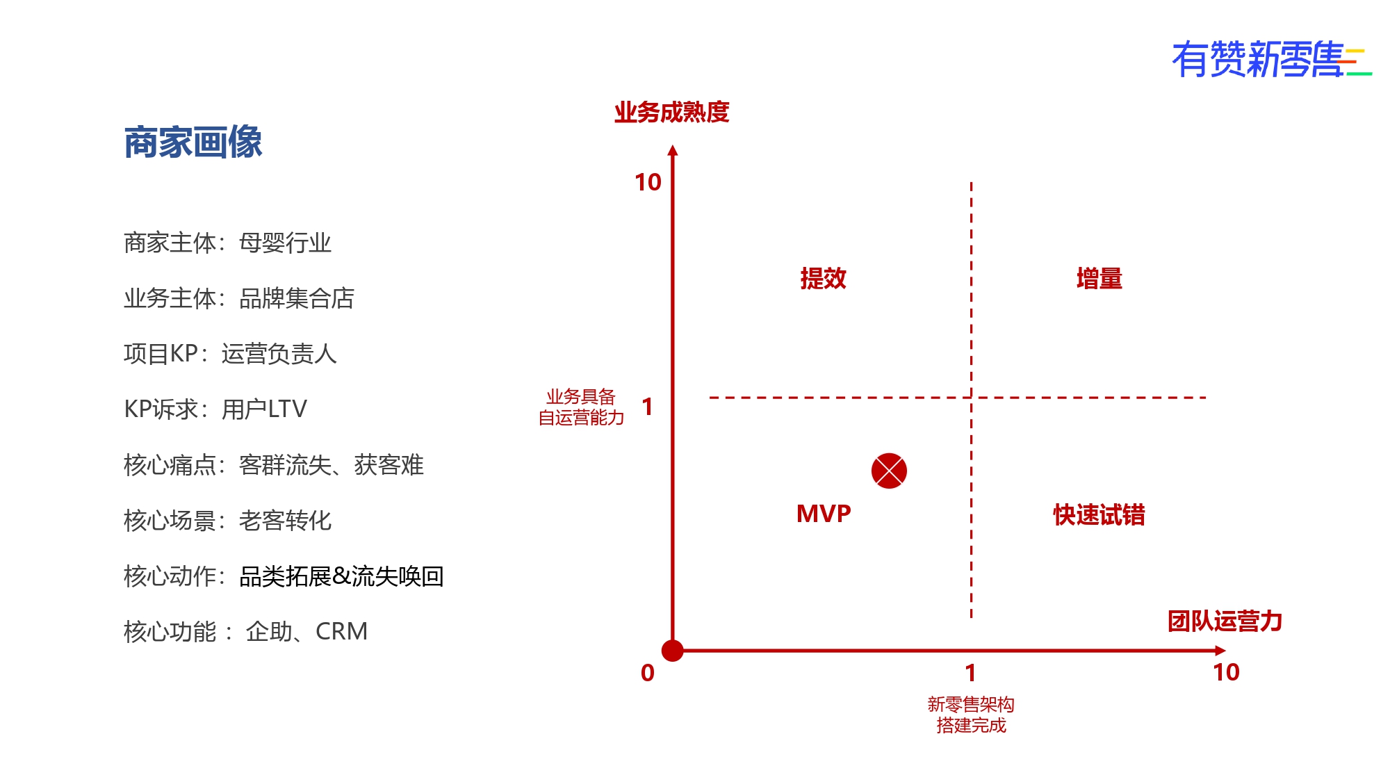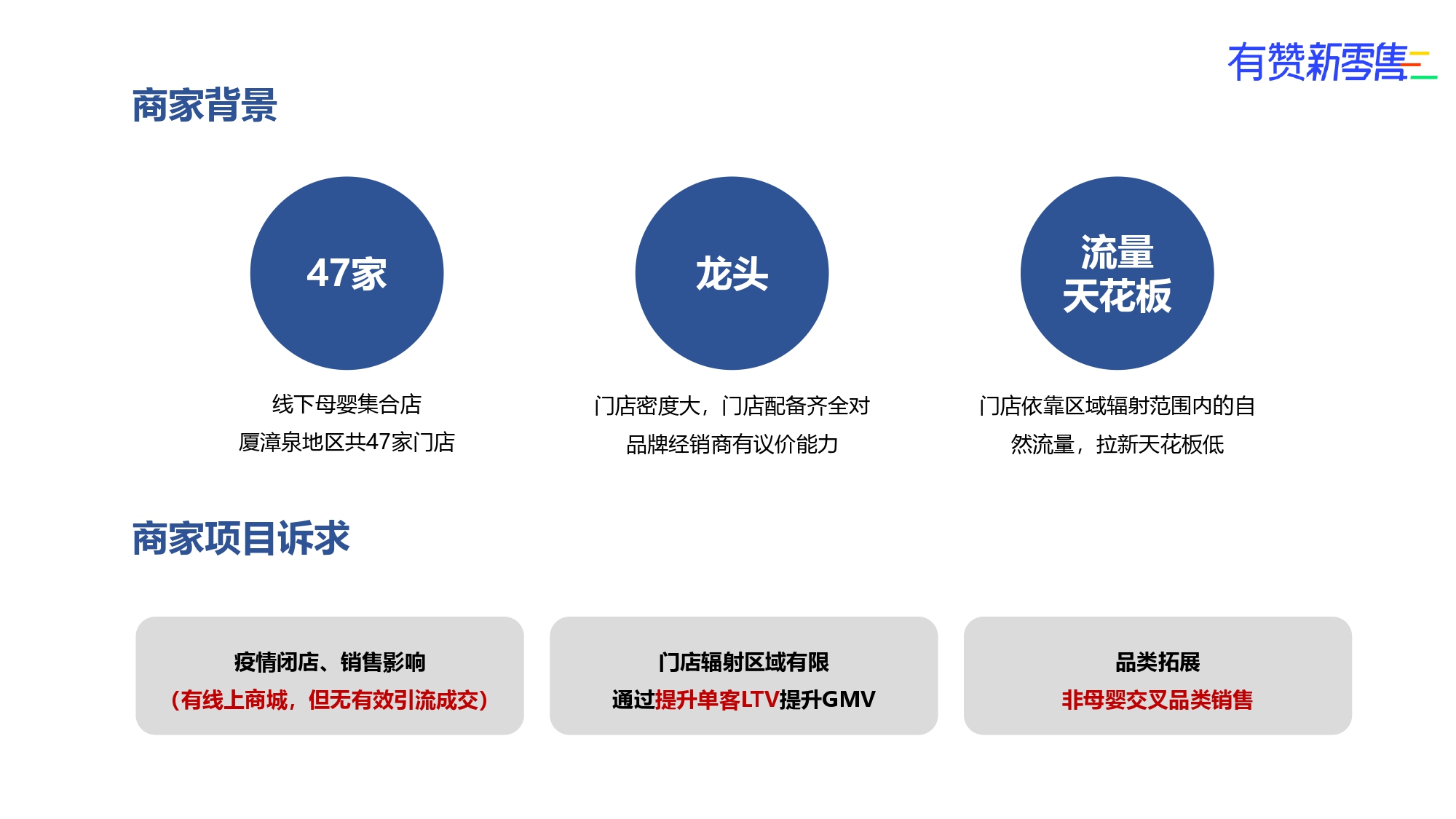 区域龙头母婴商家爱甜甜,在厦漳泉地区共有47 家线下母婴集合店。在当地属于门店密度大,门店配备齐全的商家,然而门店依靠区域辐射范围内的自然流量,拉新天花板低。因为疫情等的原因,销售也收到了影响。 商家诉求: 1.提升线上商城流量,做好引流; 2.扩大门店辐射范围,通过提升单客LTV提升GMV; 3.品类拓展,进行非母婴交叉品类销售,扩大整体销量; 有赞新零售咨询规划服务,助力商家短平快起盘,主要支持: 1.多次买--消耗品、准触达; 2.多买--挖需求、强触达: 例如,通过美妆跨品类的经营,打破对母婴品牌集合店的固有印象;拓展建立品牌对母婴生活方式的理念,引入相关周边商品,打造“母婴生活方式”解决方案;建立一站式生活购物圈,囊括一家人生活所需等。最终帮助商家实现客单增长123%。