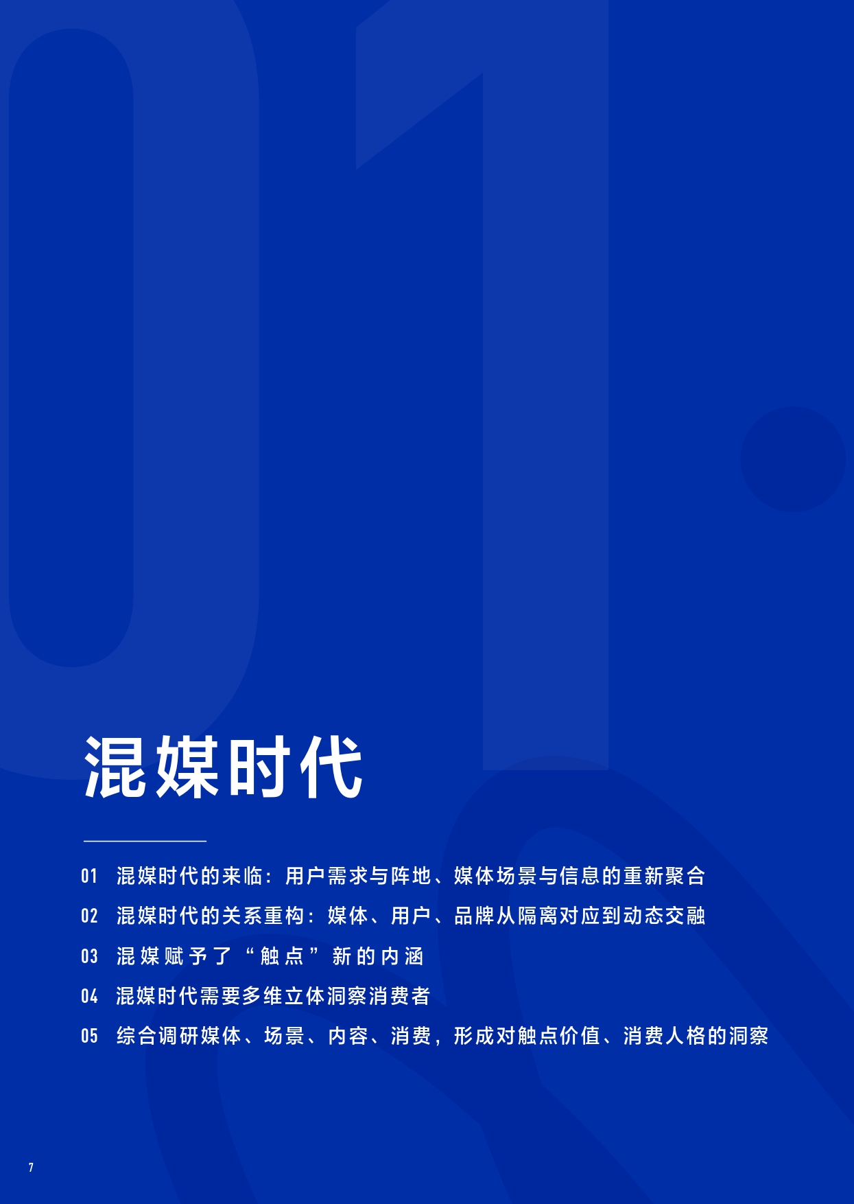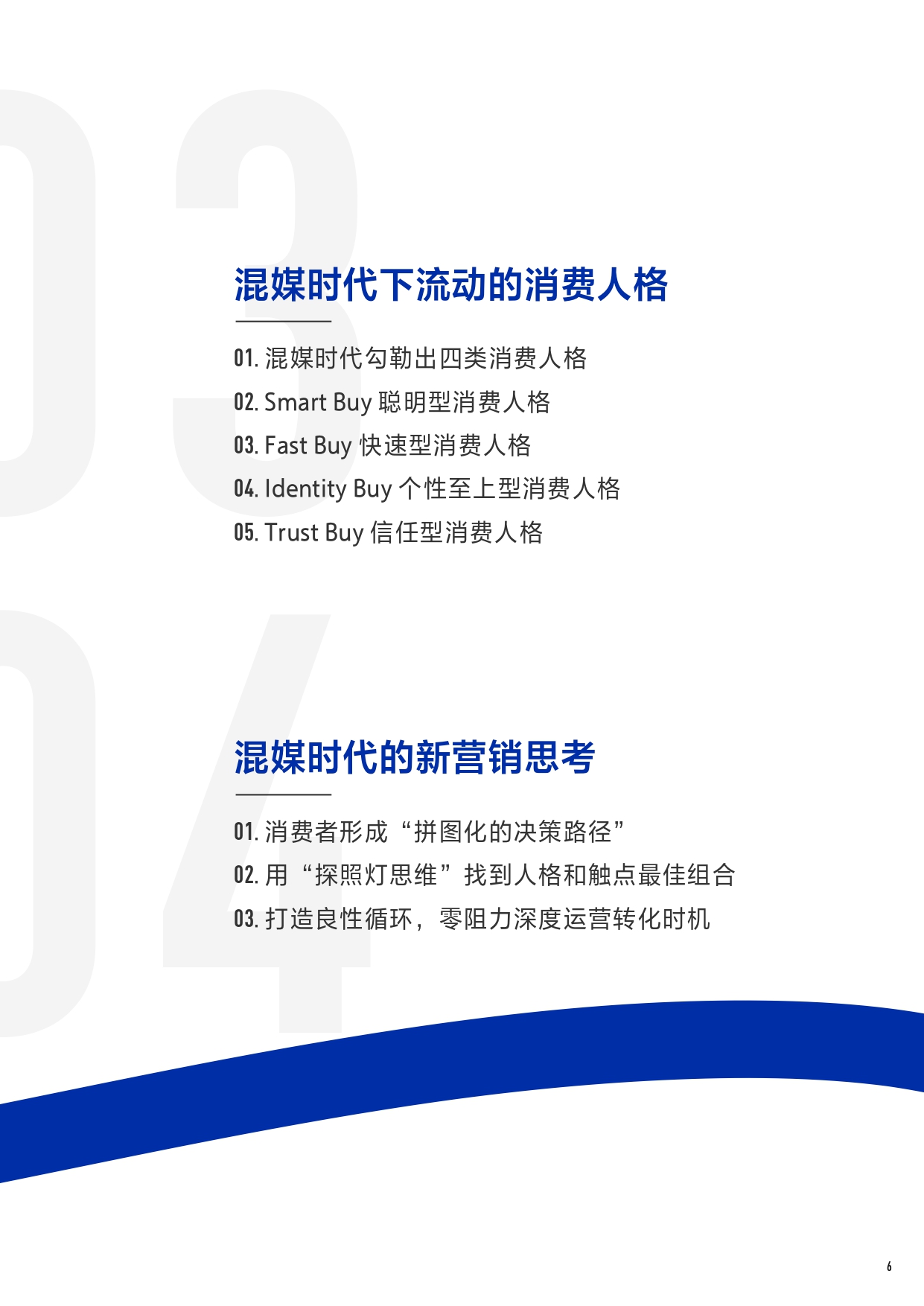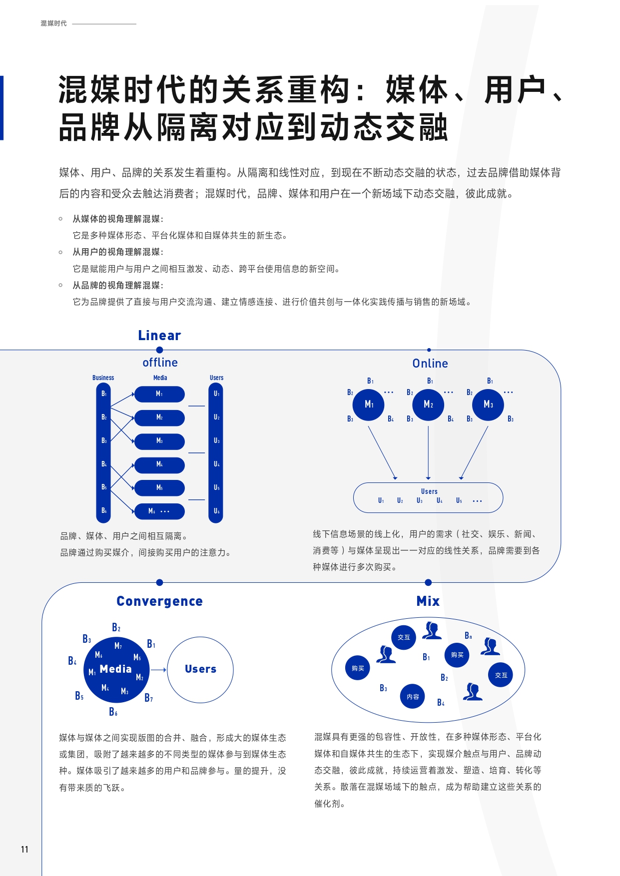 混媒是多种媒体形态、多个媒体功能产品与多层级、多领域自媒体交融共生的生态;也是用户与用户之间相互激发,支持用户动态选择、按需定制、跨信源跳转评估、快捷满足多种消费需求的新信息场域。 混媒时代下呈现出来的四类消费人格: 1.聪明型消费人格 2.快速型消费人格 3.个性至上型消费人格 4.信任型消费人格 针对此现象,如何开展新营销? 1.消费者角度:引导用户形成“拼图化的决策路径”; 2.营销者角度:需要用“探照灯”思维,看清消费拼图,找到触点的最佳组合; 3.打造良性循环,零阻力深度运营转化时机。 更多细节可查看完整报告内容获取~